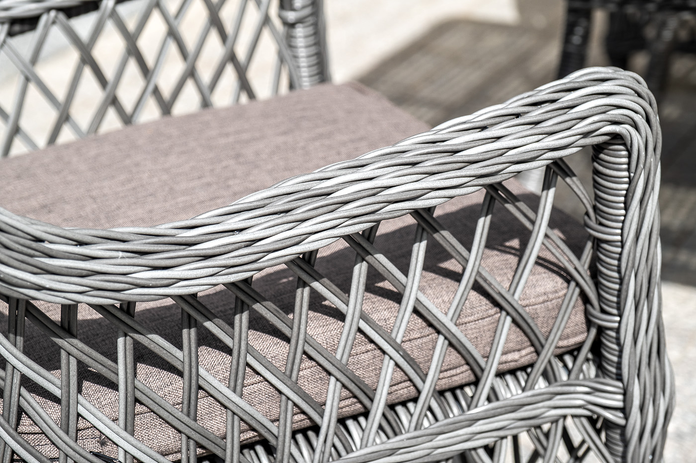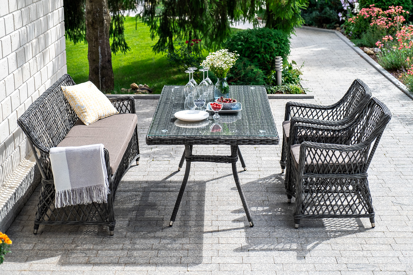 Все предметы мебели изготовлены из прочного алюминия, вручную оплетенного долговечным искусственным ротангом. На креслах и диване предусмотрены подушки со съёмными чехлами и влагостойкой пропиткой. Стол укомплектован прочным стеклом толщиной 5 мм для удобства использования.