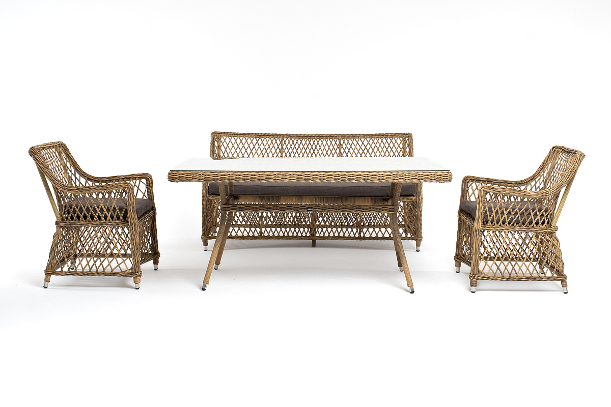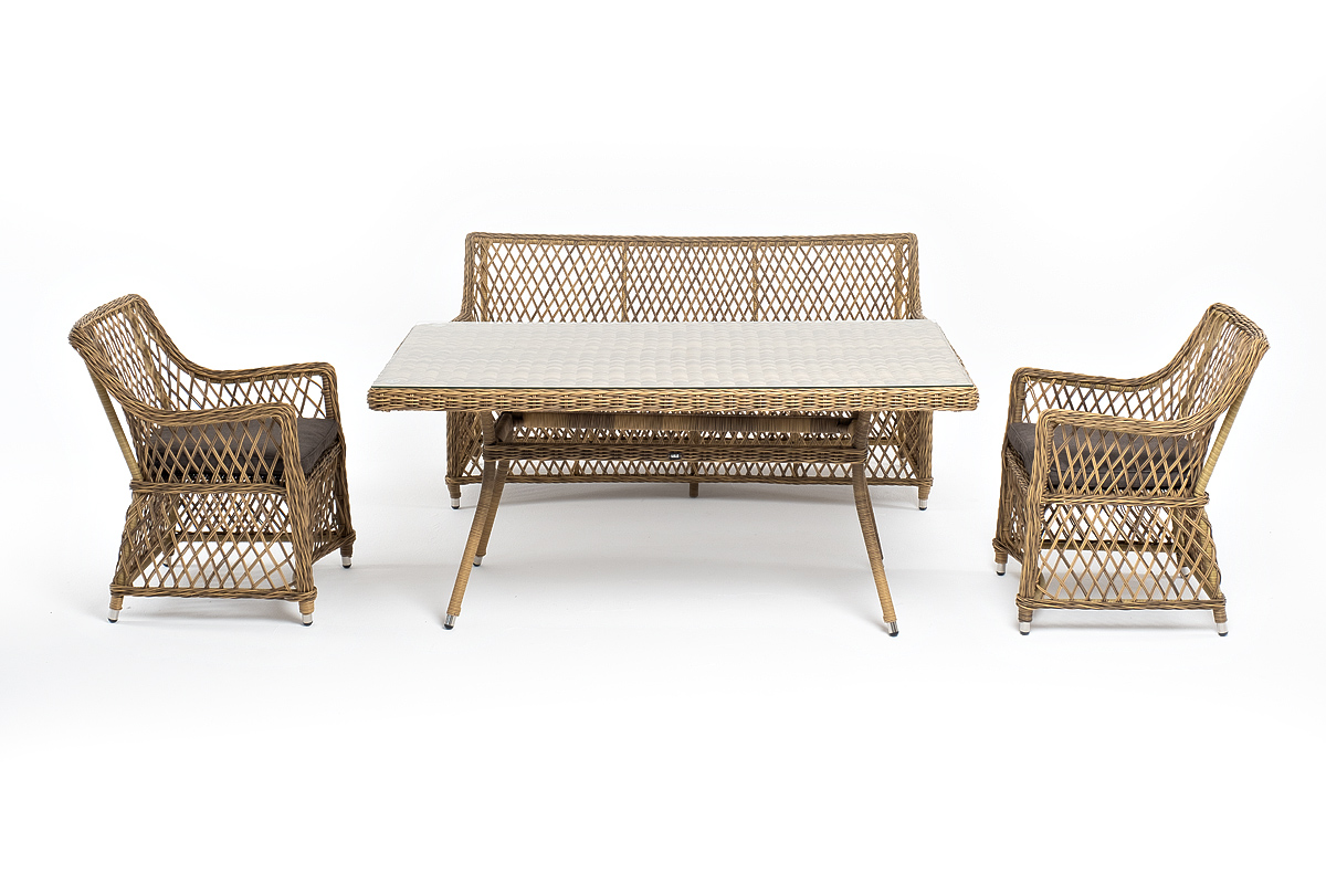 Обеденная группа выполнена в соломенном цвете. Комплект дополнит любой экстерьер в классическом стиле.
