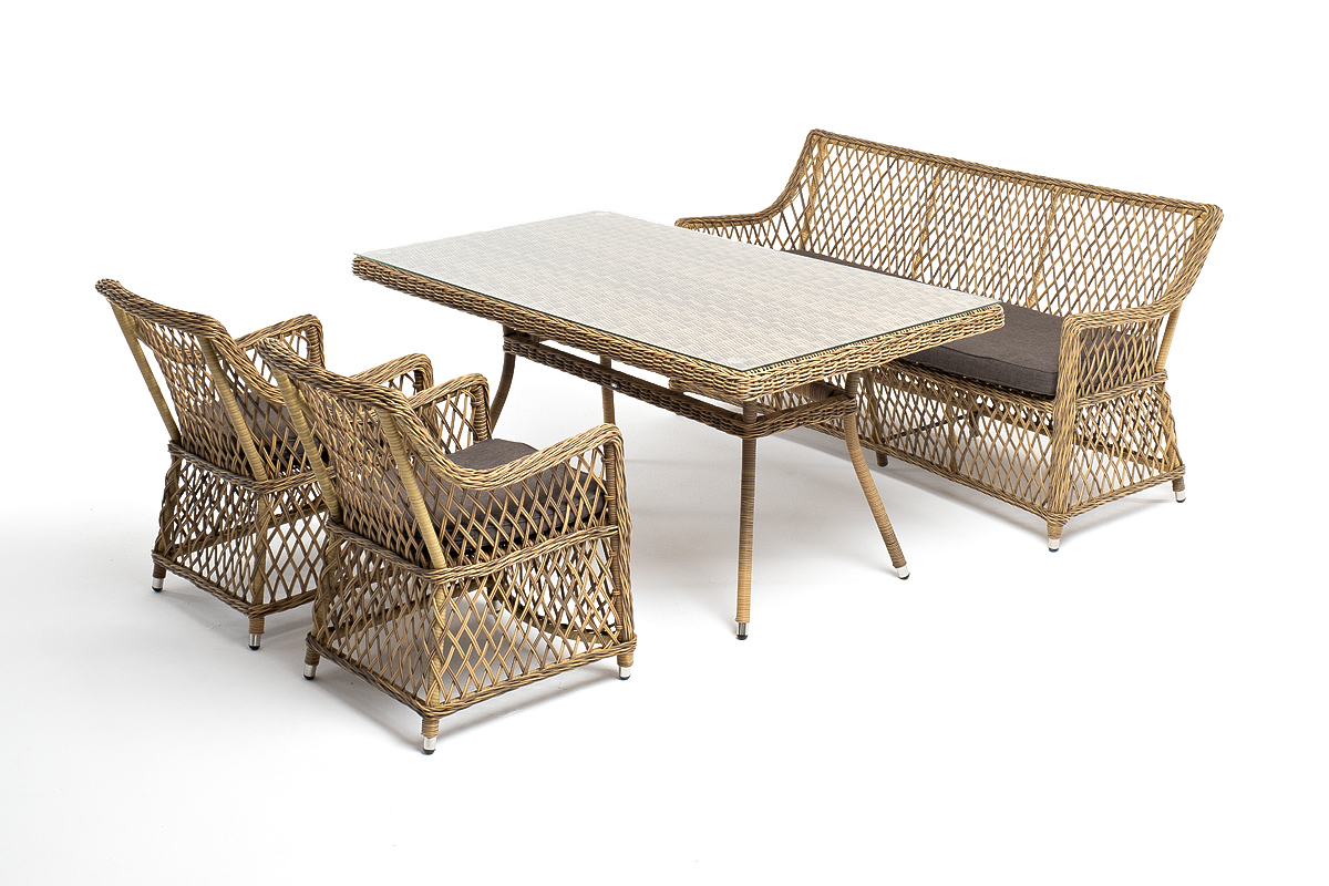 Все предметы мебели изготовлены из прочного алюминия, вручную оплетенного долговечным искусственным ротангом. На креслах и диване предусмотрены подушки со съёмными чехлами и влагостойкой пропиткой. Стол укомплектован прочным стеклом толщиной 5 мм для удобства использования.