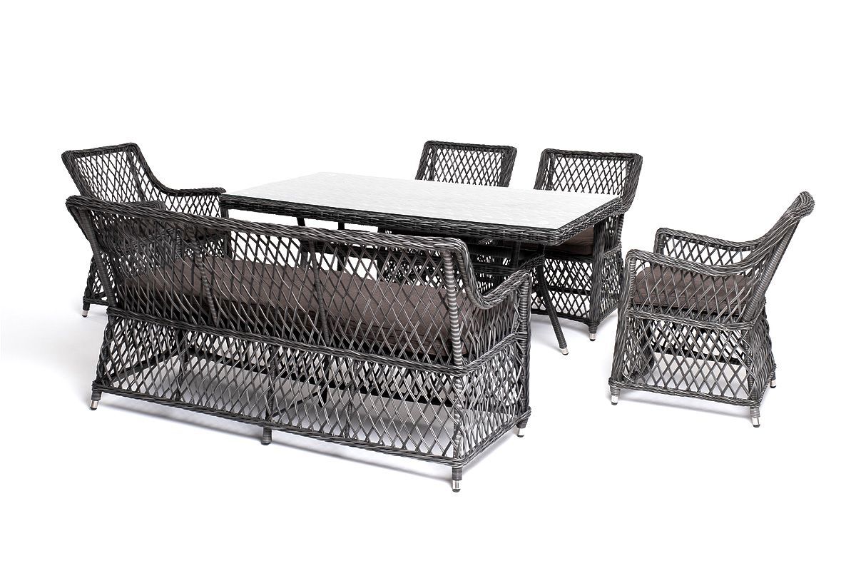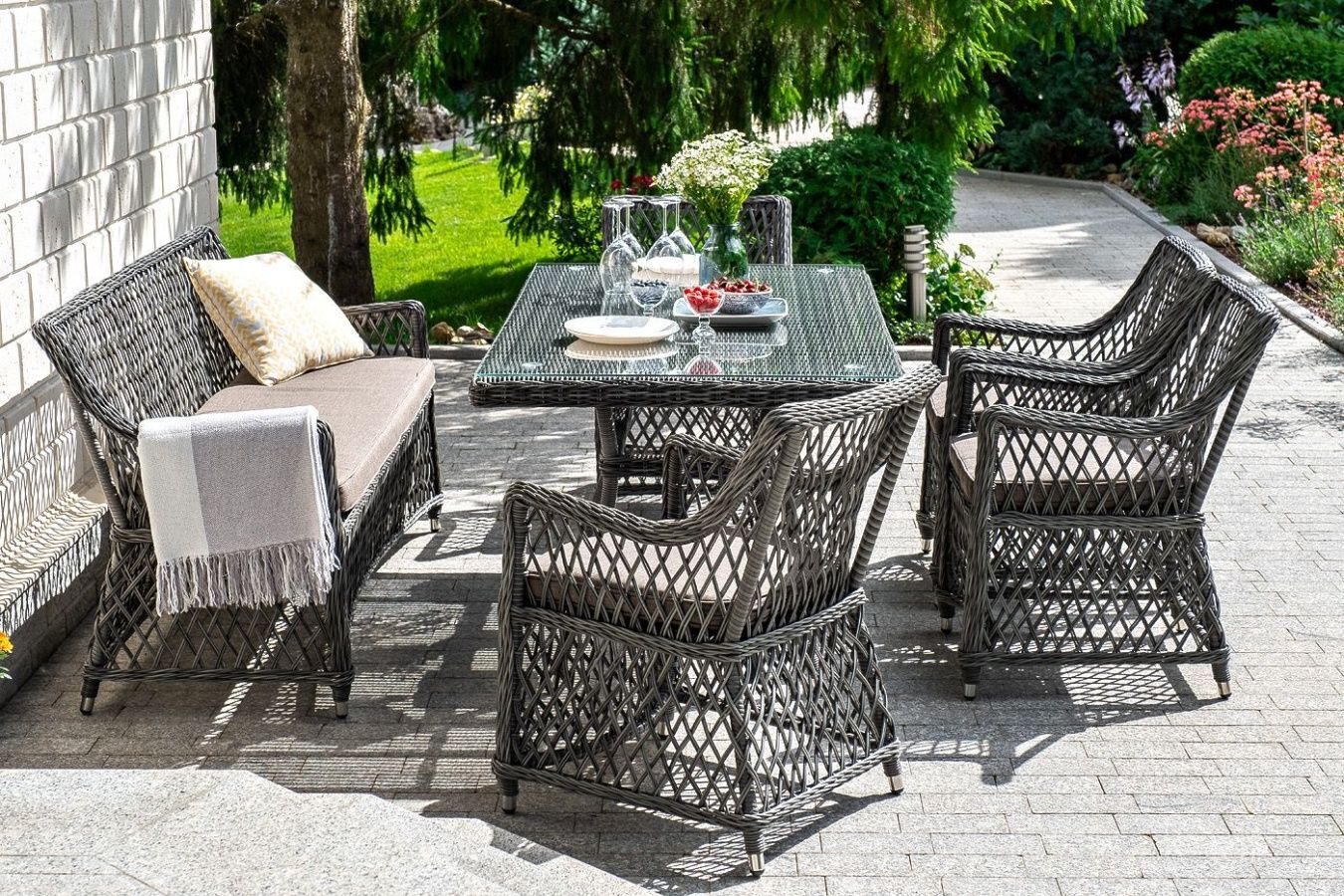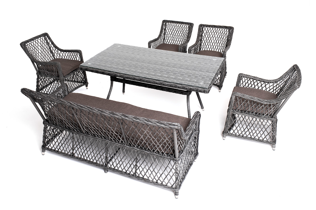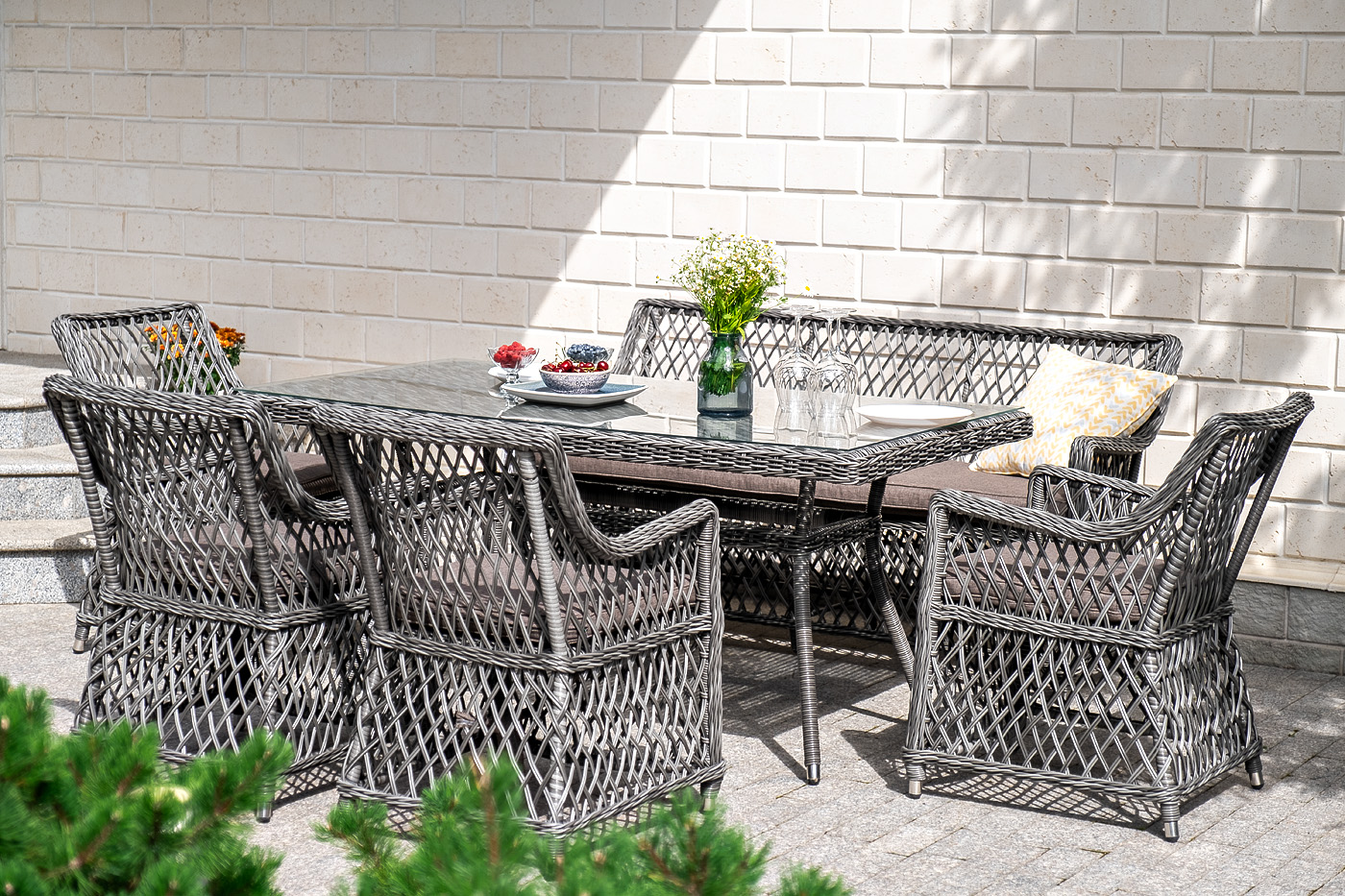 Обеденная группа выполнена в цвете графит. Комплект дополнит любой экстерьер в классическом стиле.