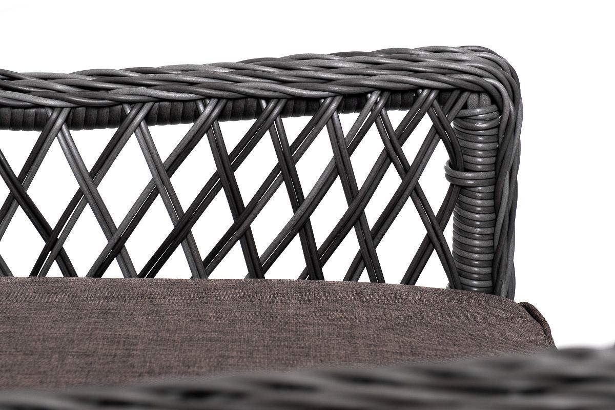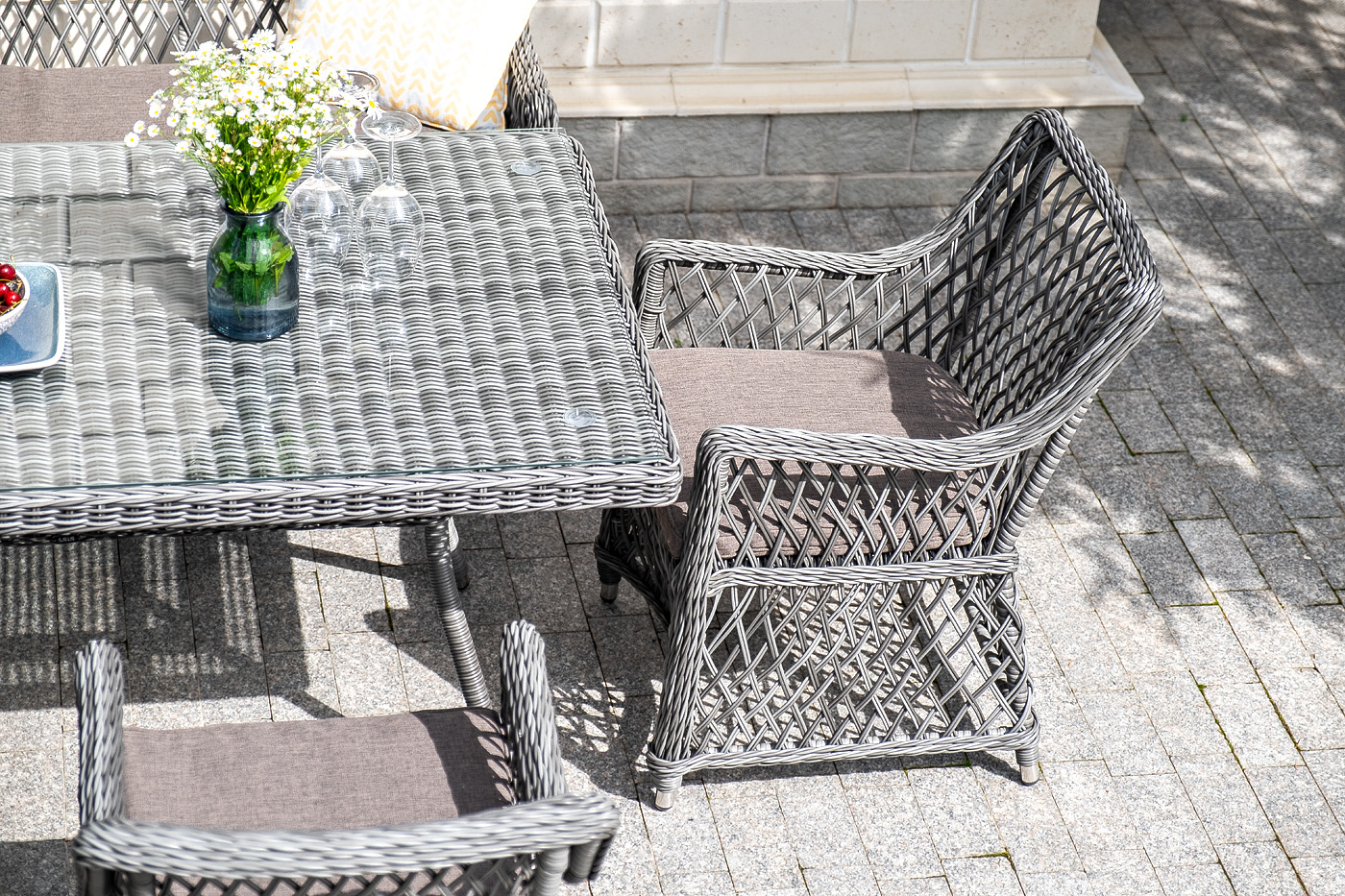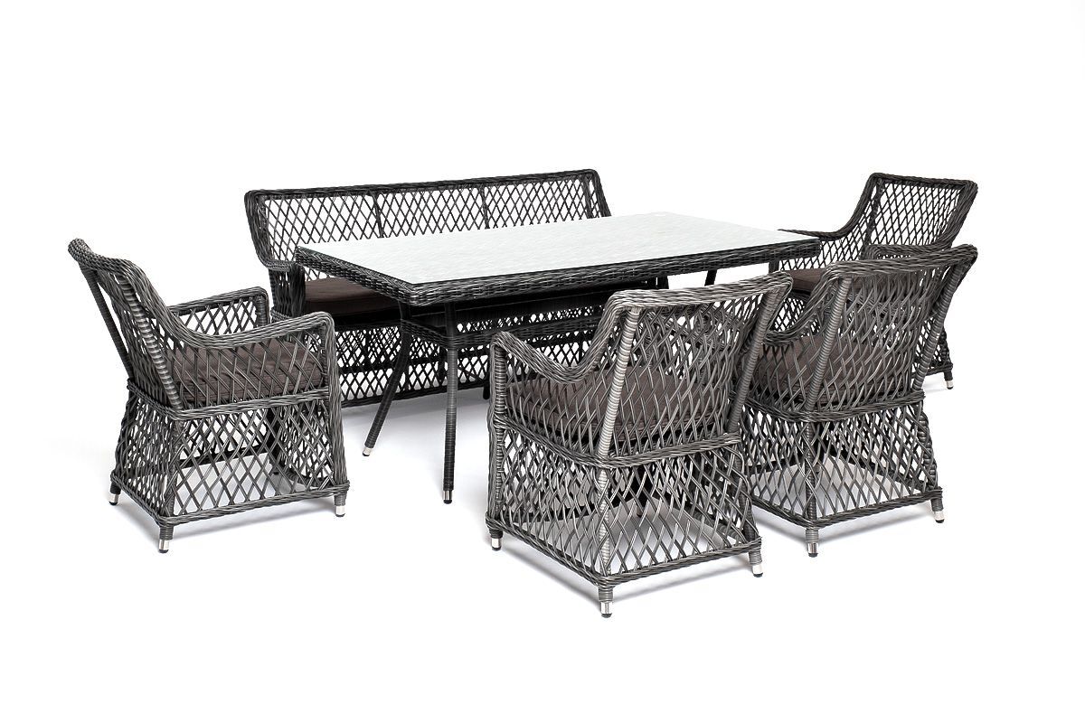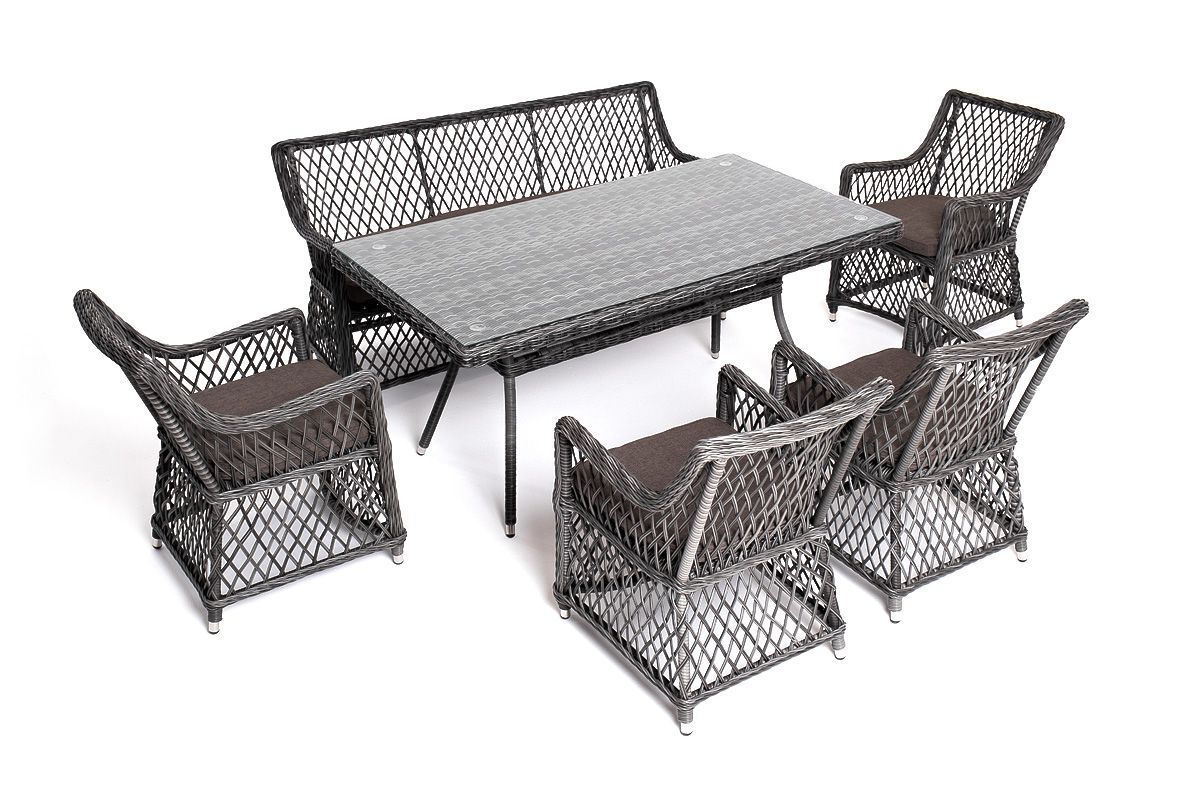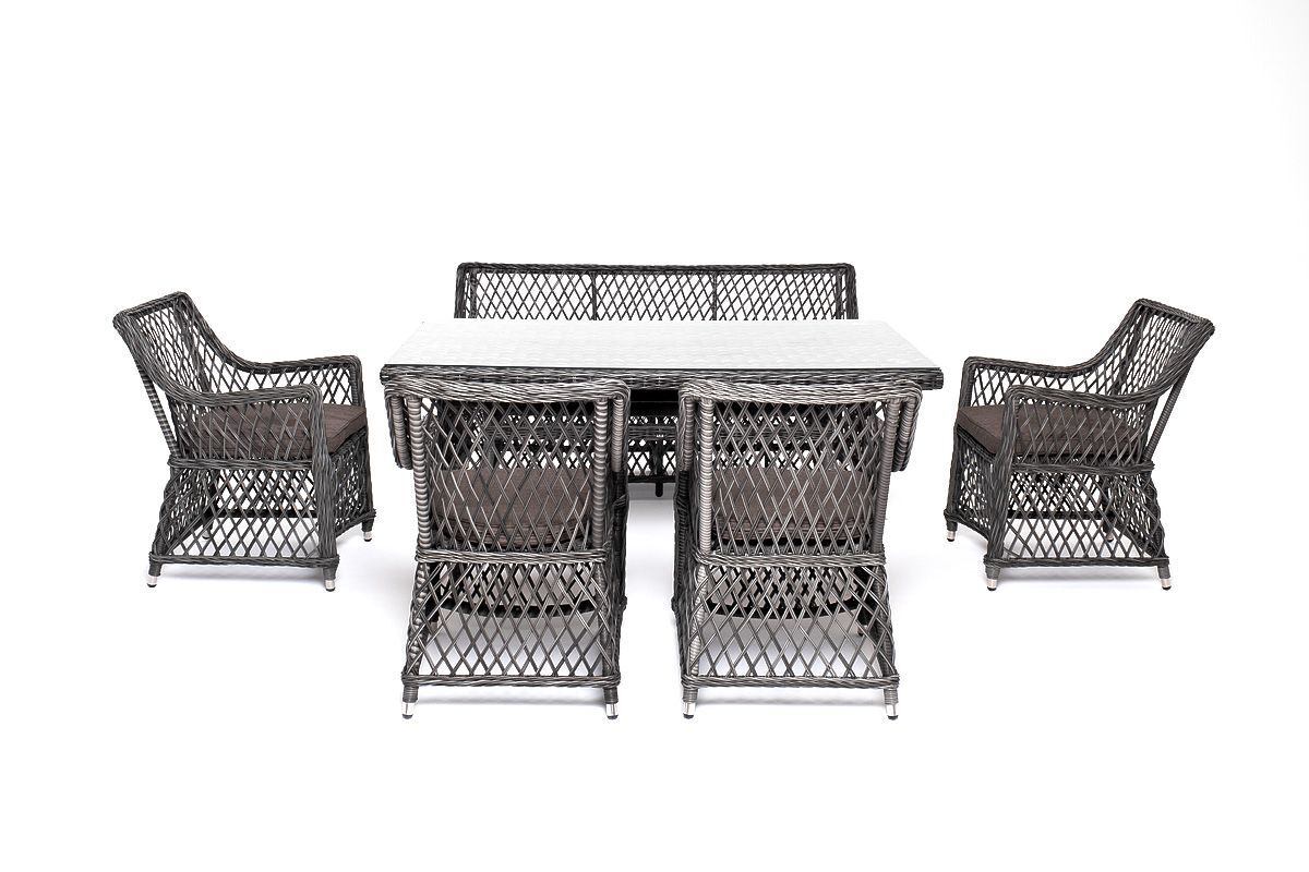 Обеденная группа выполнена в цвете графит. Комплект дополнит любой экстерьер в классическом стиле.