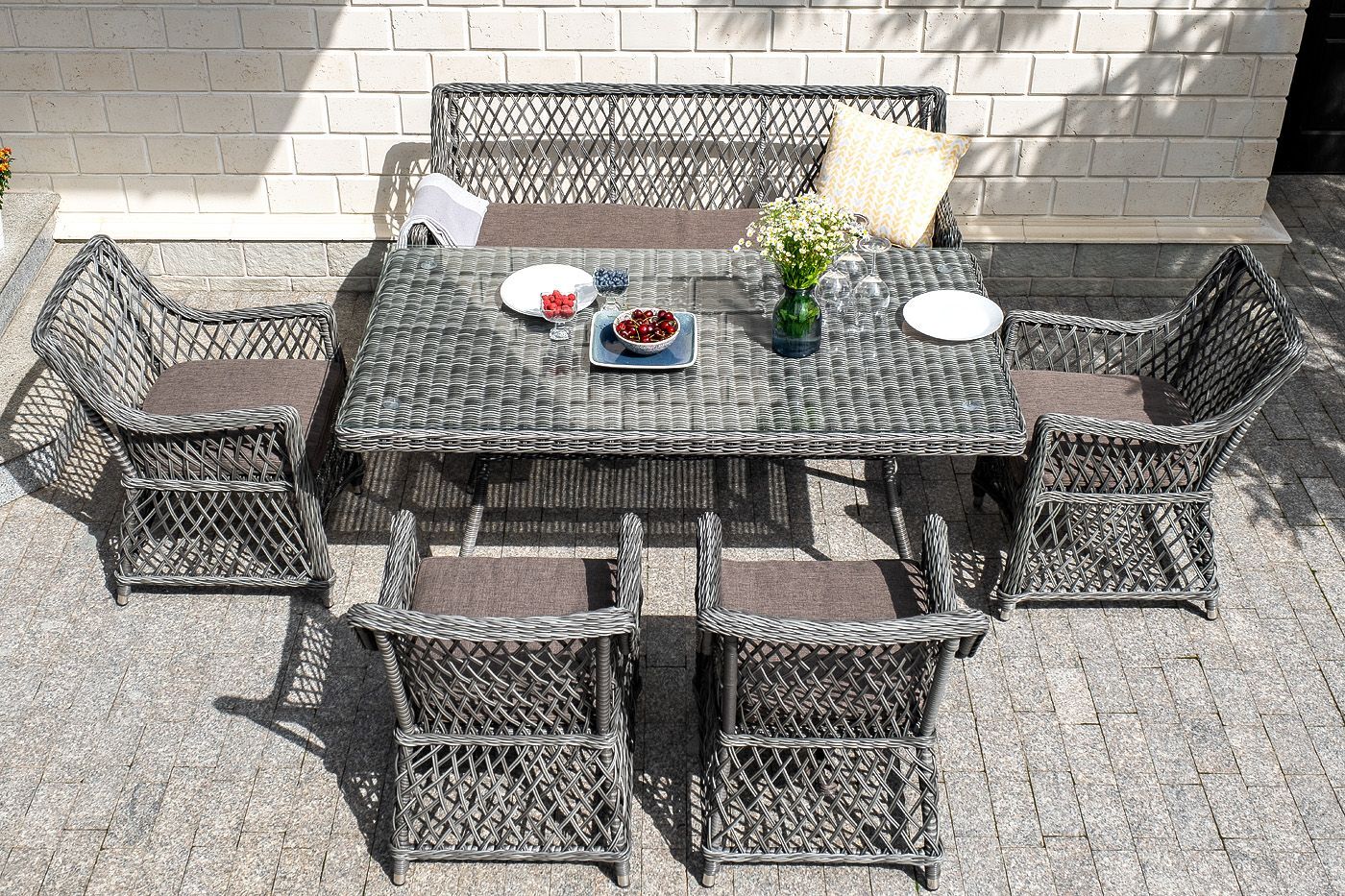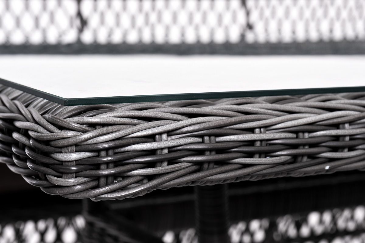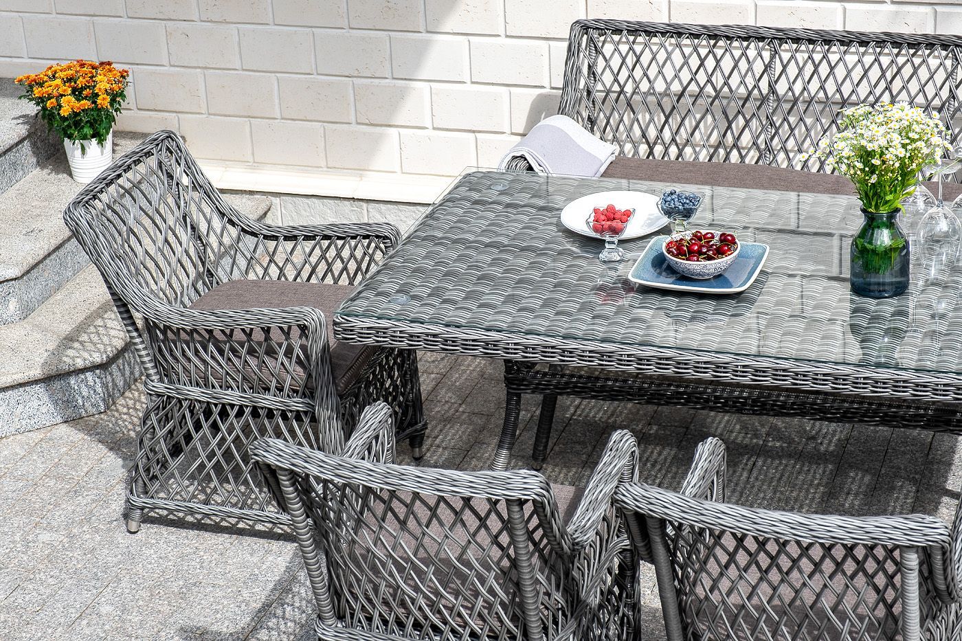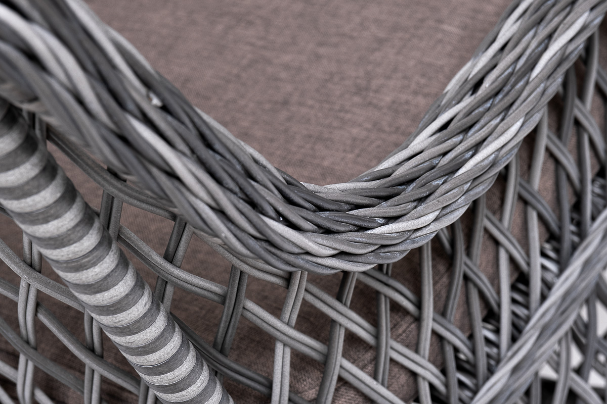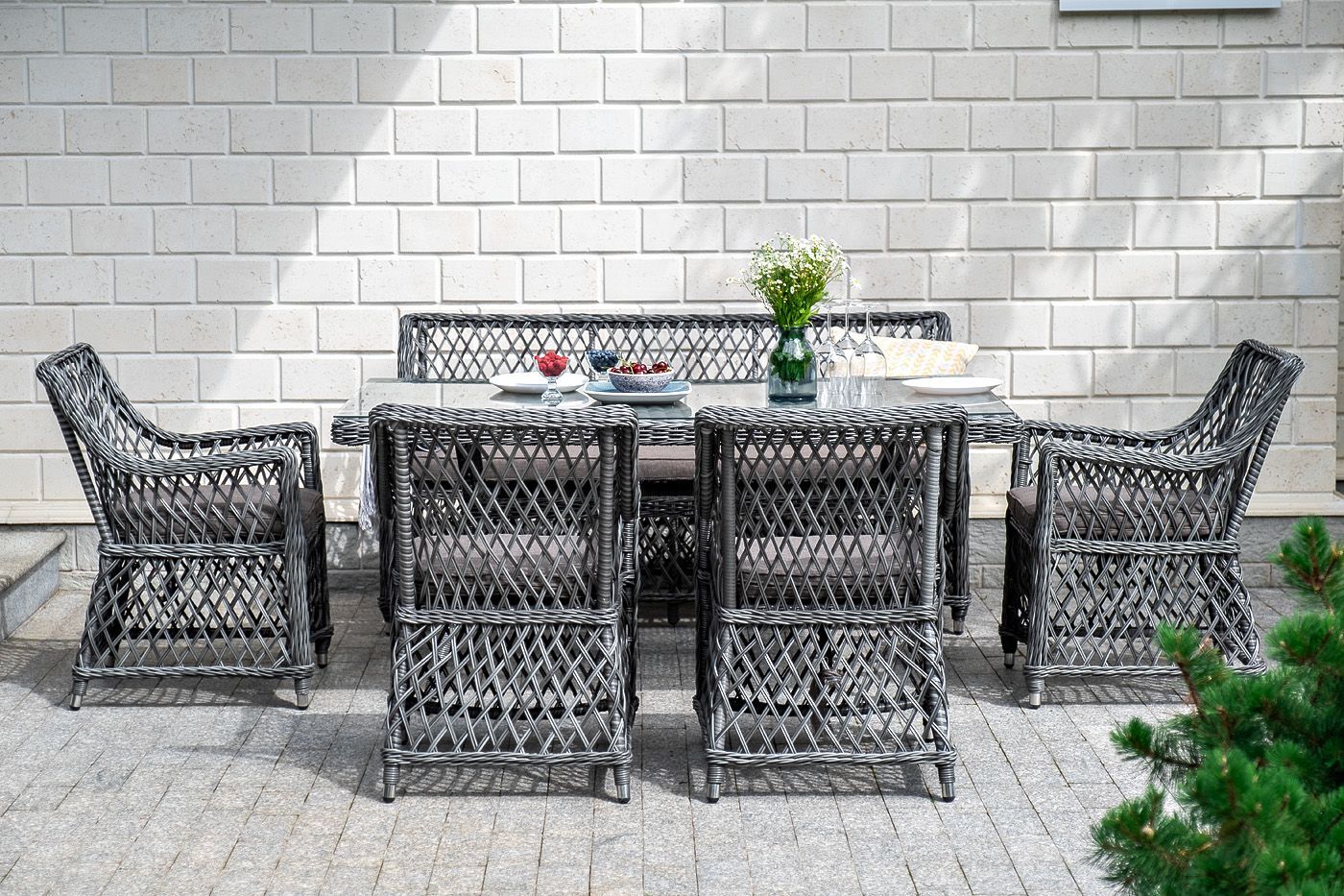 Все предметы мебели изготовлены из прочного алюминия, вручную оплетенного долговечным искусственным ротангом. На креслах и диване предусмотрены подушки со съёмными чехлами и влагостойкой пропиткой. Стол укомплектован прочным стеклом толщиной 5 мм для удобства использования.