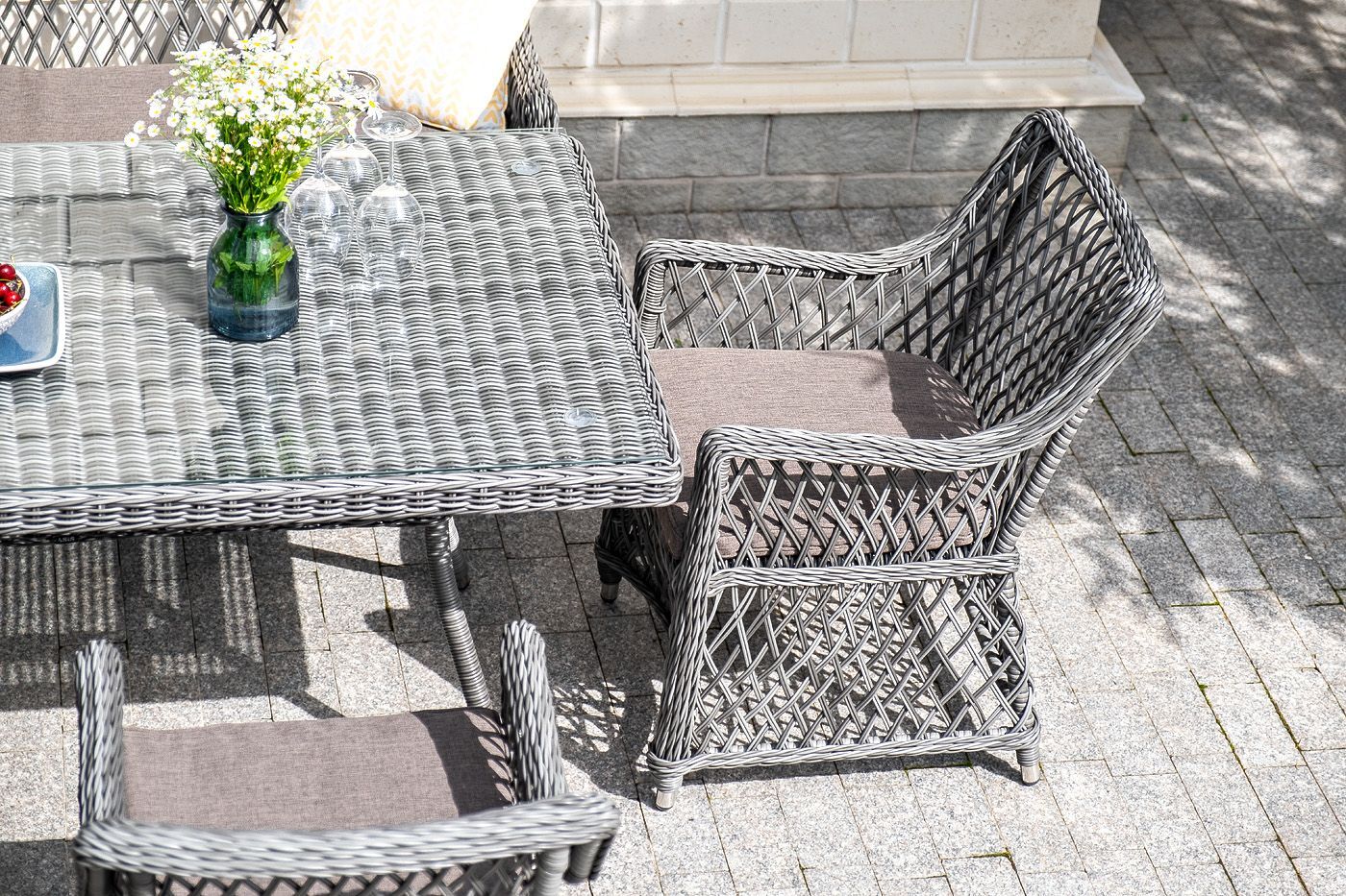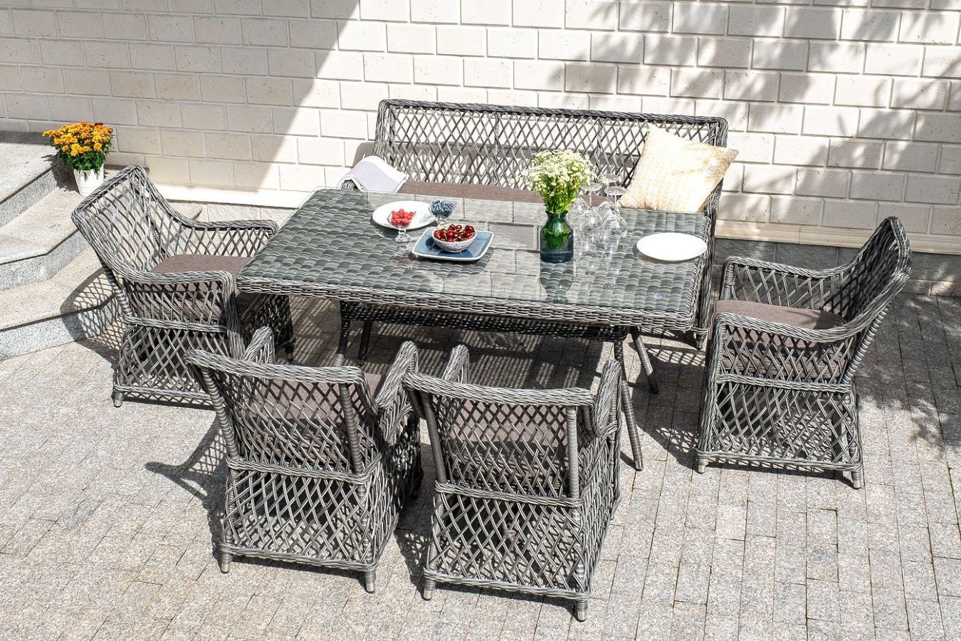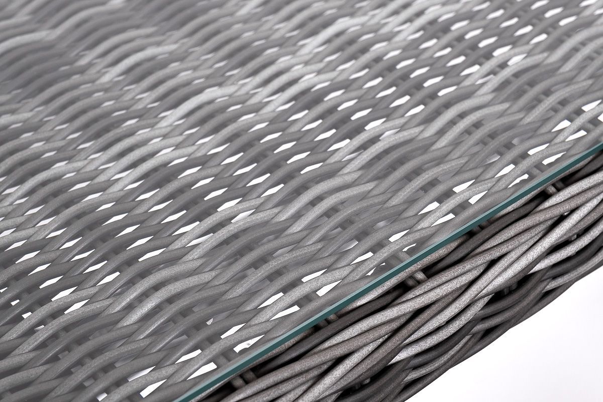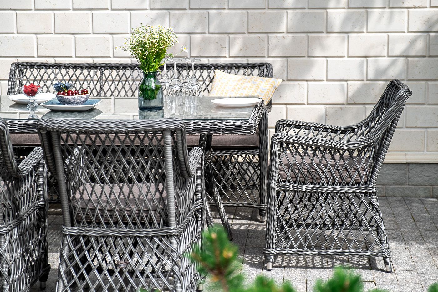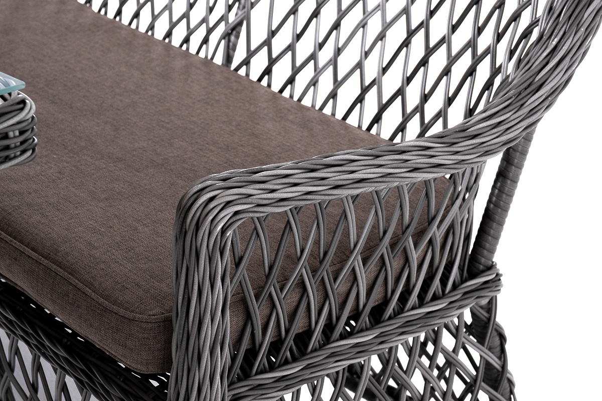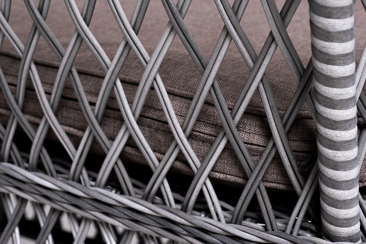 Все предметы мебели изготовлены из прочного алюминия, вручную оплетенного долговечным искусственным ротангом. На креслах и диване предусмотрены подушки со съёмными чехлами и влагостойкой пропиткой. Стол укомплектован прочным стеклом толщиной 5 мм для удобства использования.