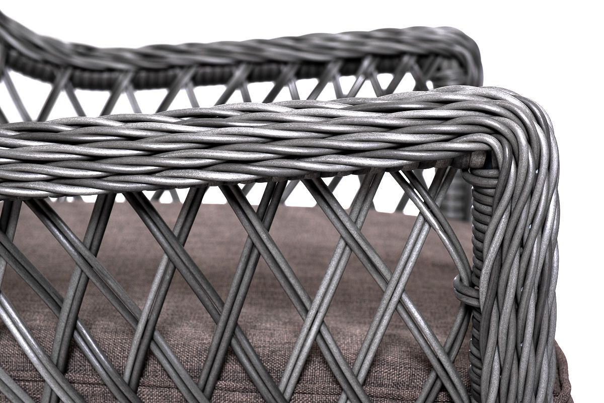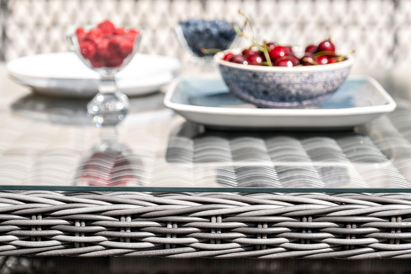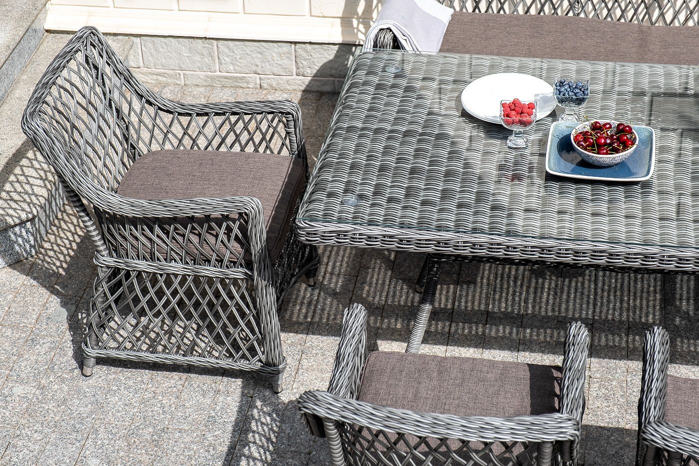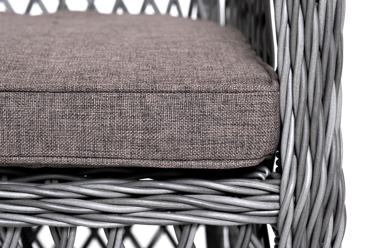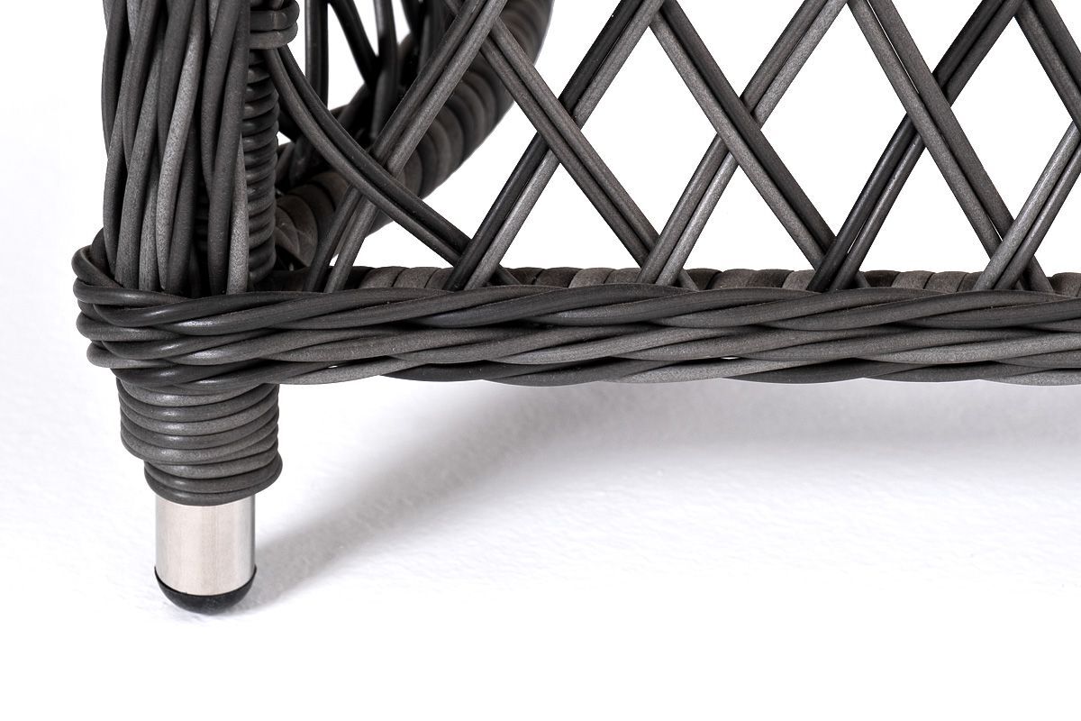 Все предметы мебели изготовлены из прочного алюминия, вручную оплетенного долговечным искусственным ротангом. На креслах и диване предусмотрены подушки со съёмными чехлами и влагостойкой пропиткой. Стол укомплектован прочным стеклом толщиной 5 мм для удобства использования.