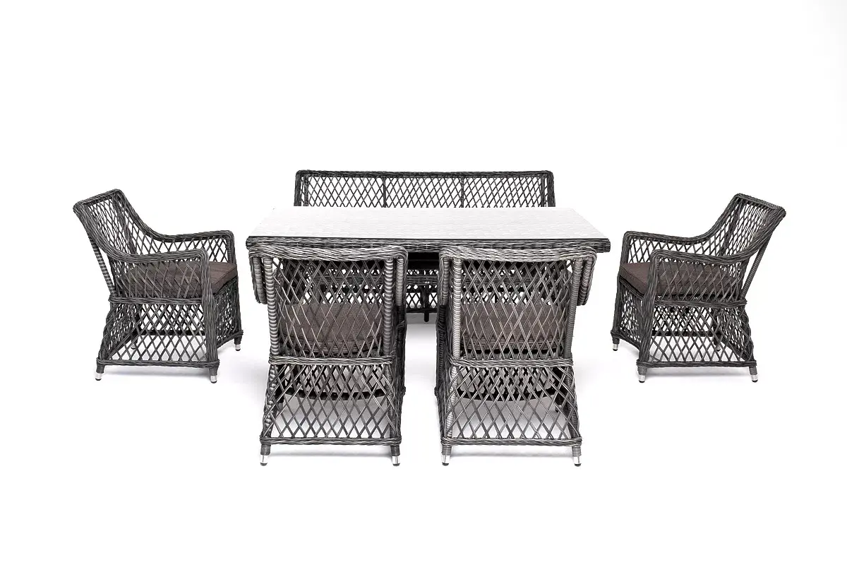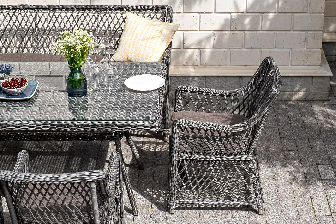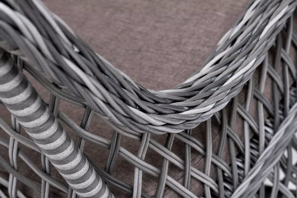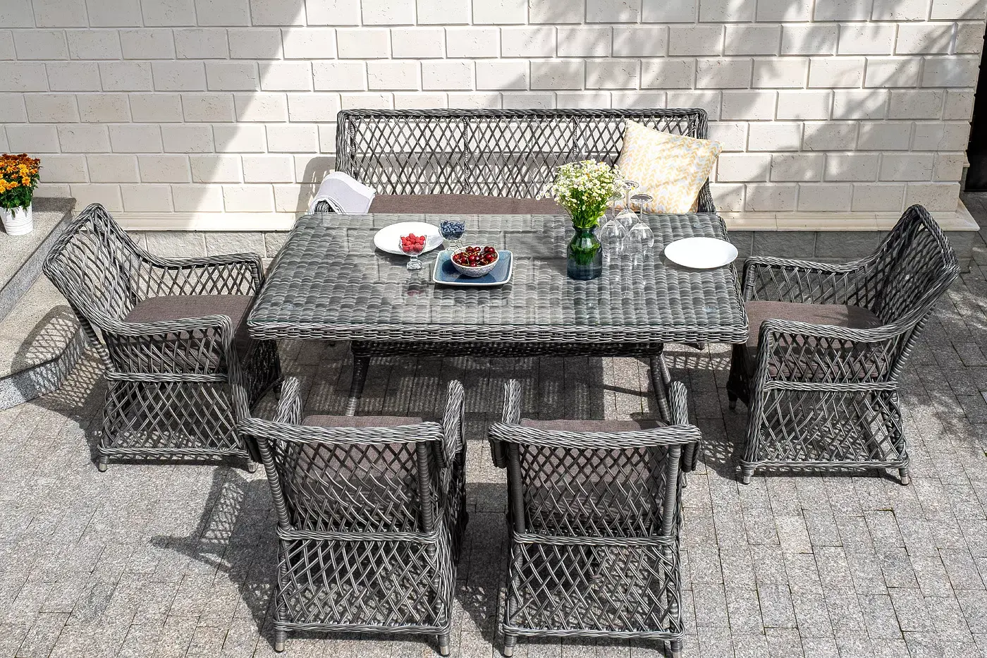 Все предметы мебели изготовлены из прочного алюминия, вручную оплетенного долговечным искусственным ротангом. На креслах и диване предусмотрены подушки со съёмными чехлами и влагостойкой пропиткой. Стол укомплектован прочным стеклом толщиной 5 мм для удобства использования.