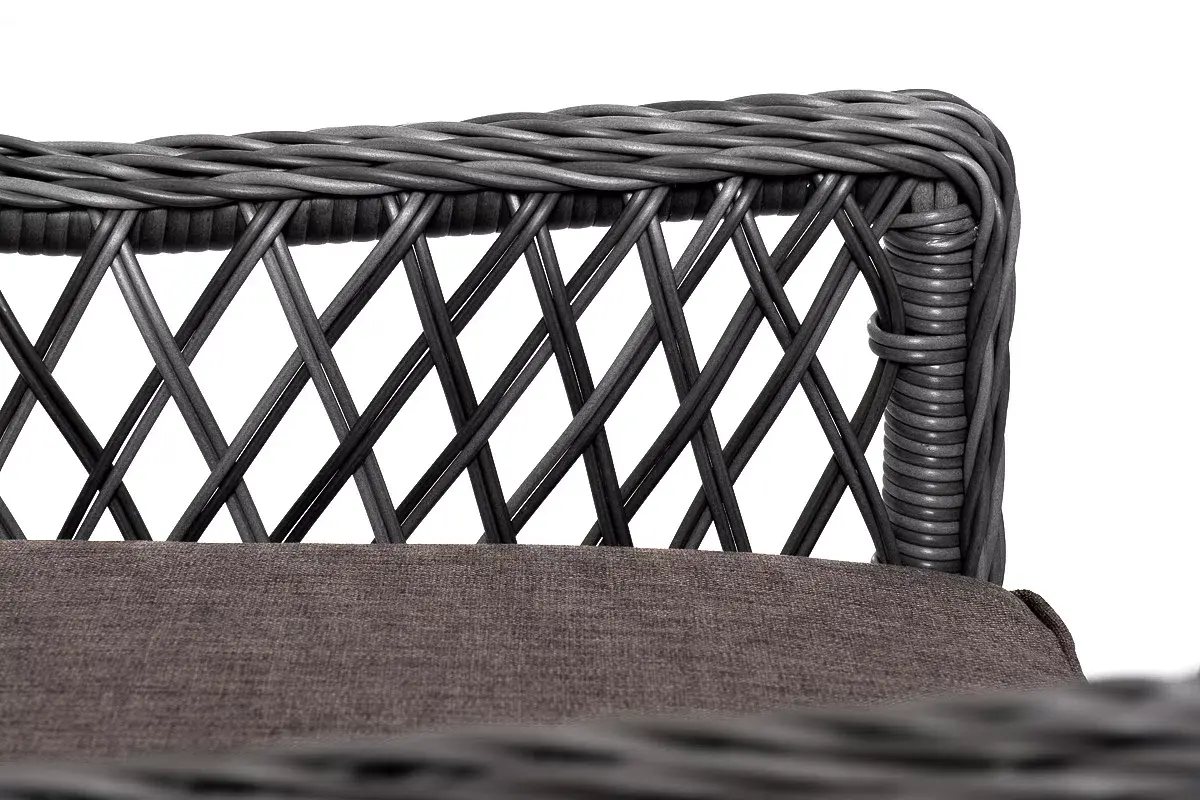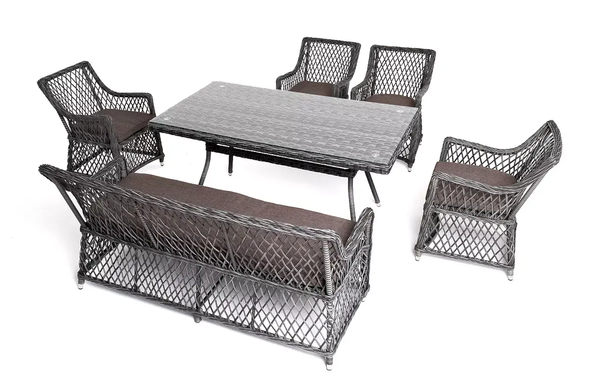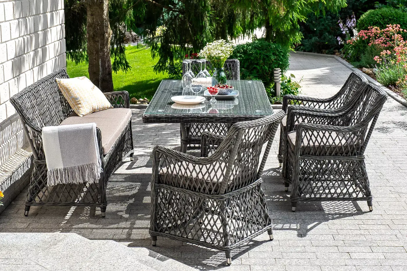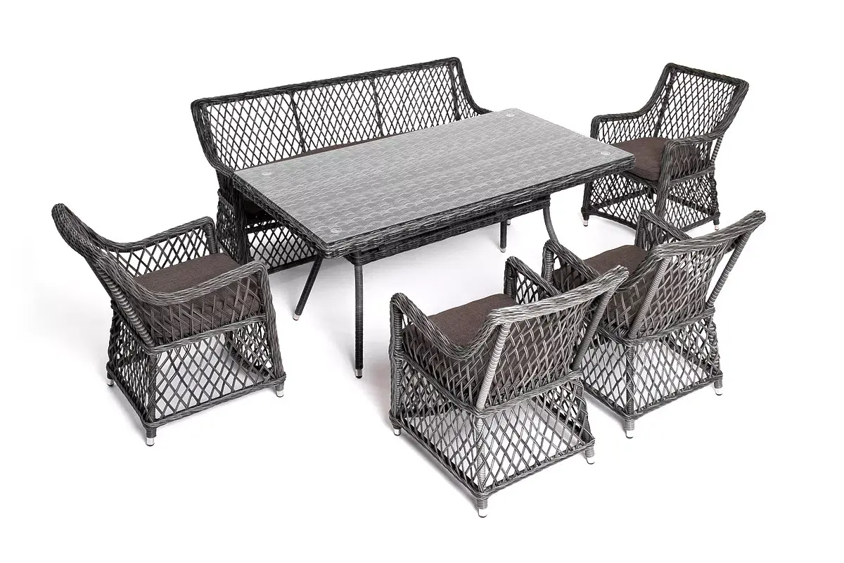 Все предметы мебели изготовлены из прочного алюминия, вручную оплетенного долговечным искусственным ротангом. На креслах и диване предусмотрены подушки со съёмными чехлами и влагостойкой пропиткой. Стол укомплектован прочным стеклом толщиной 5 мм для удобства использования.