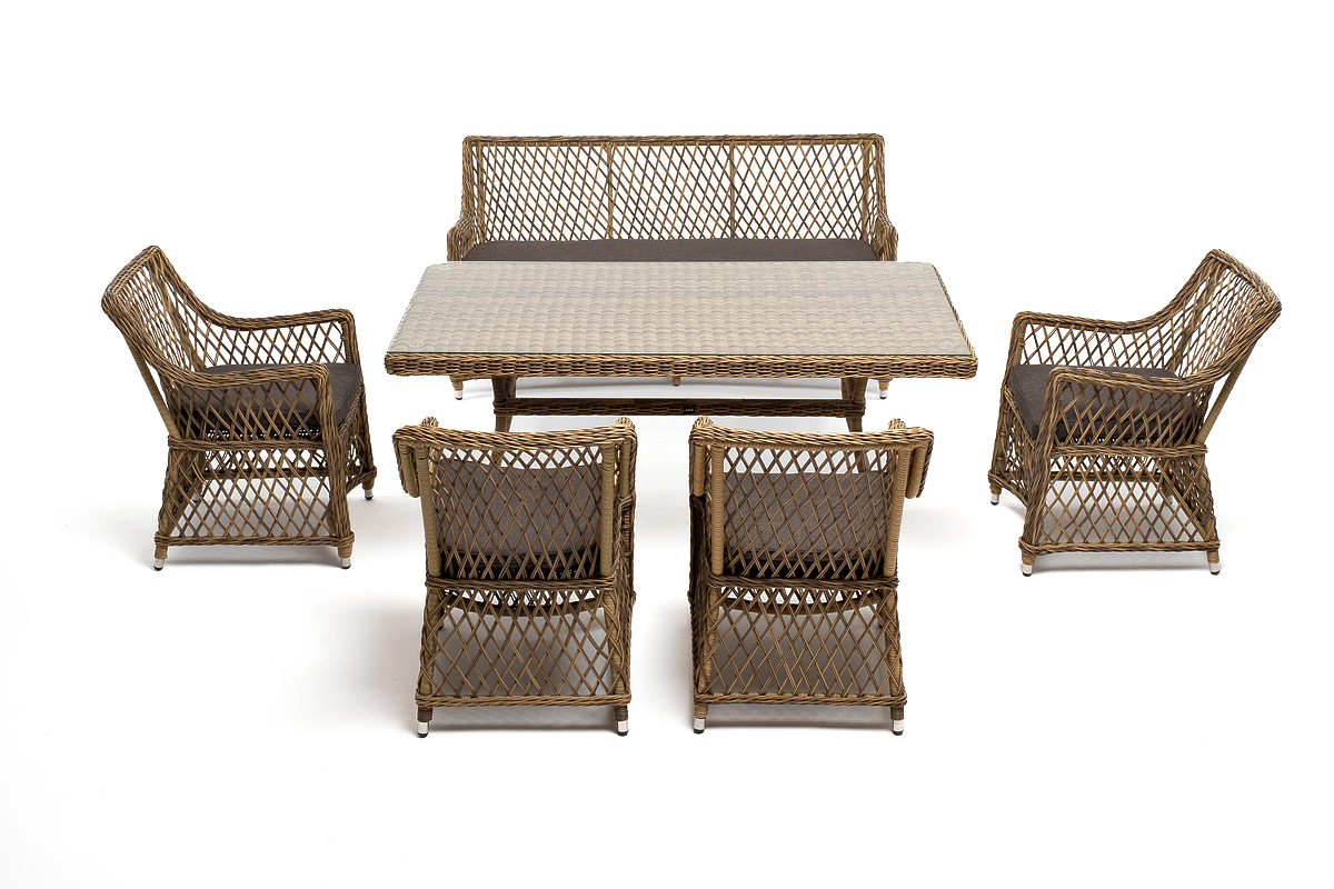 Обеденная группа выполнена в натуральном соломенном цвете. Комплект дополнит любой экстерьер в классическом стиле.