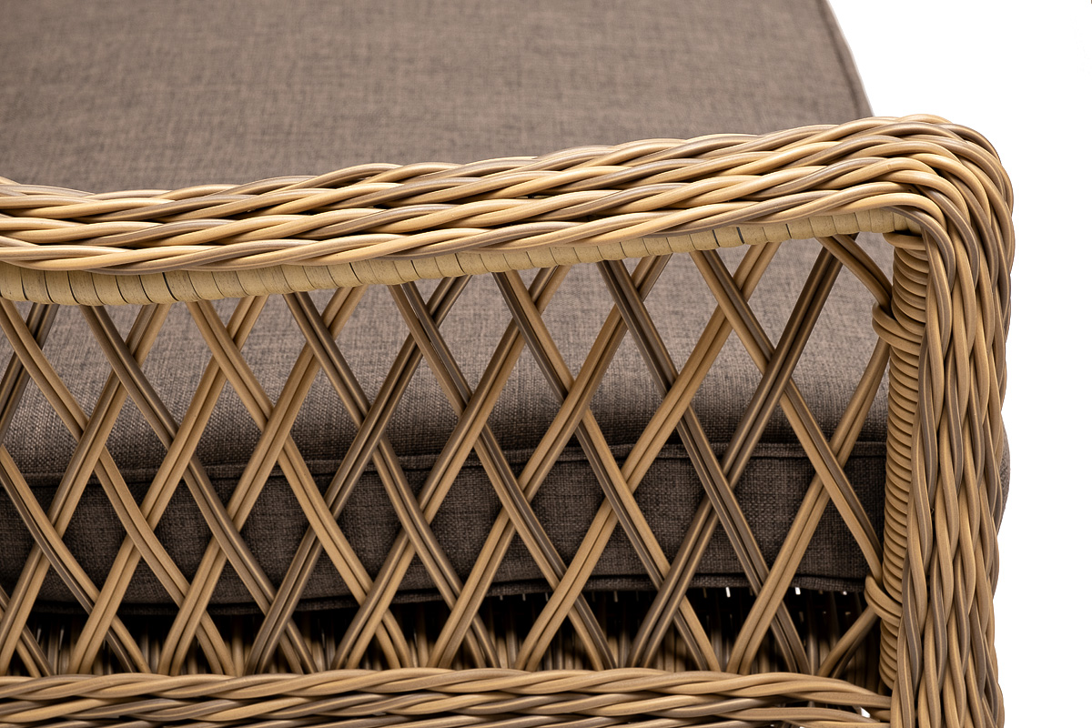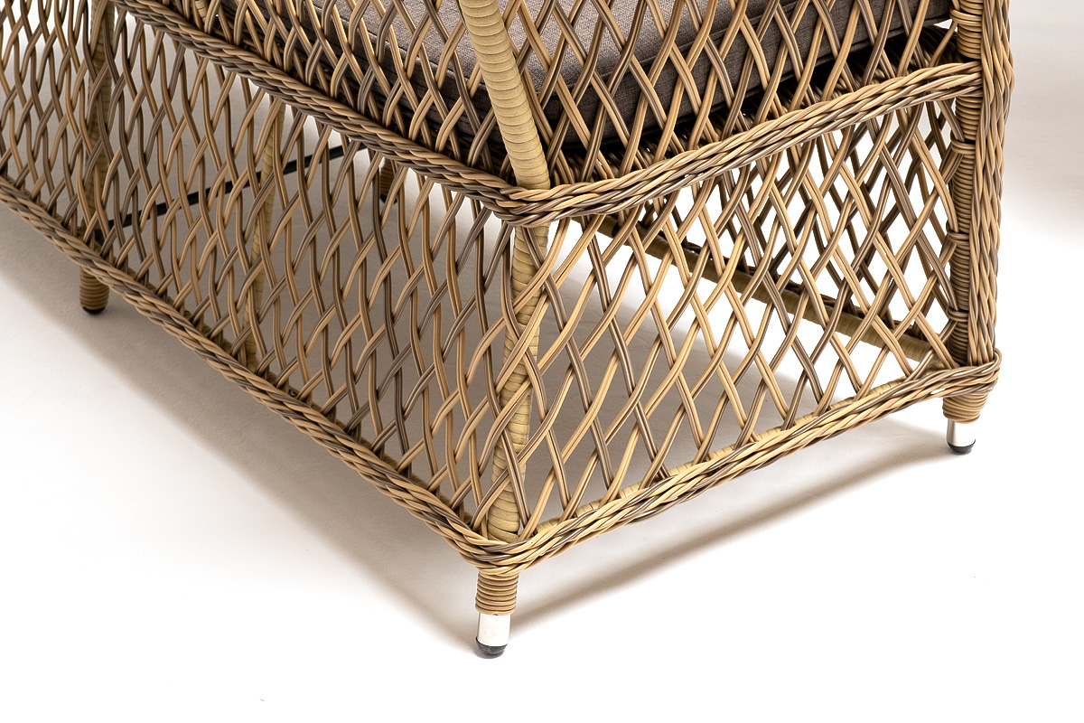 Все предметы мебели изготовлены из прочного алюминия, вручную оплетенного долговечным искусственным ротангом. На креслах и диване предусмотрены подушки со съёмными чехлами и влагостойкой пропиткой. Стол укомплектован прочным стеклом толщиной 5 мм для удобства использования.