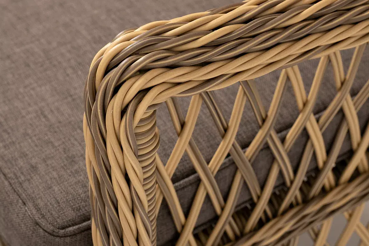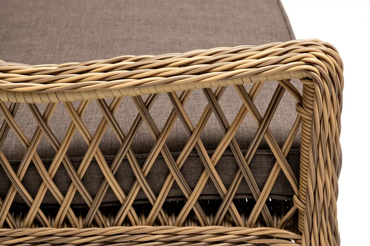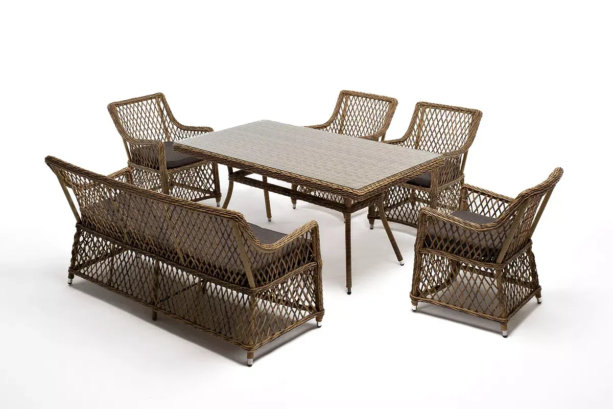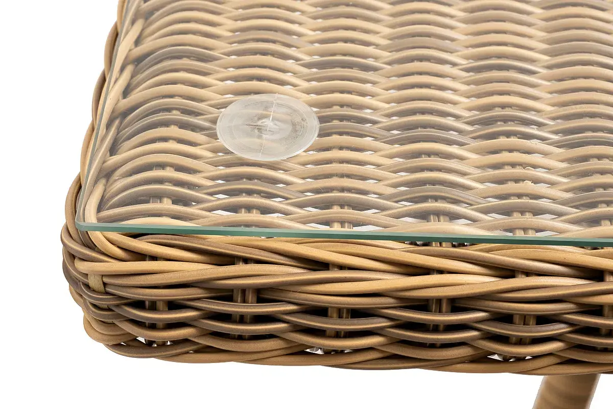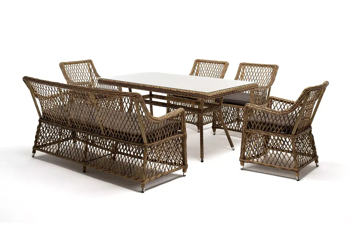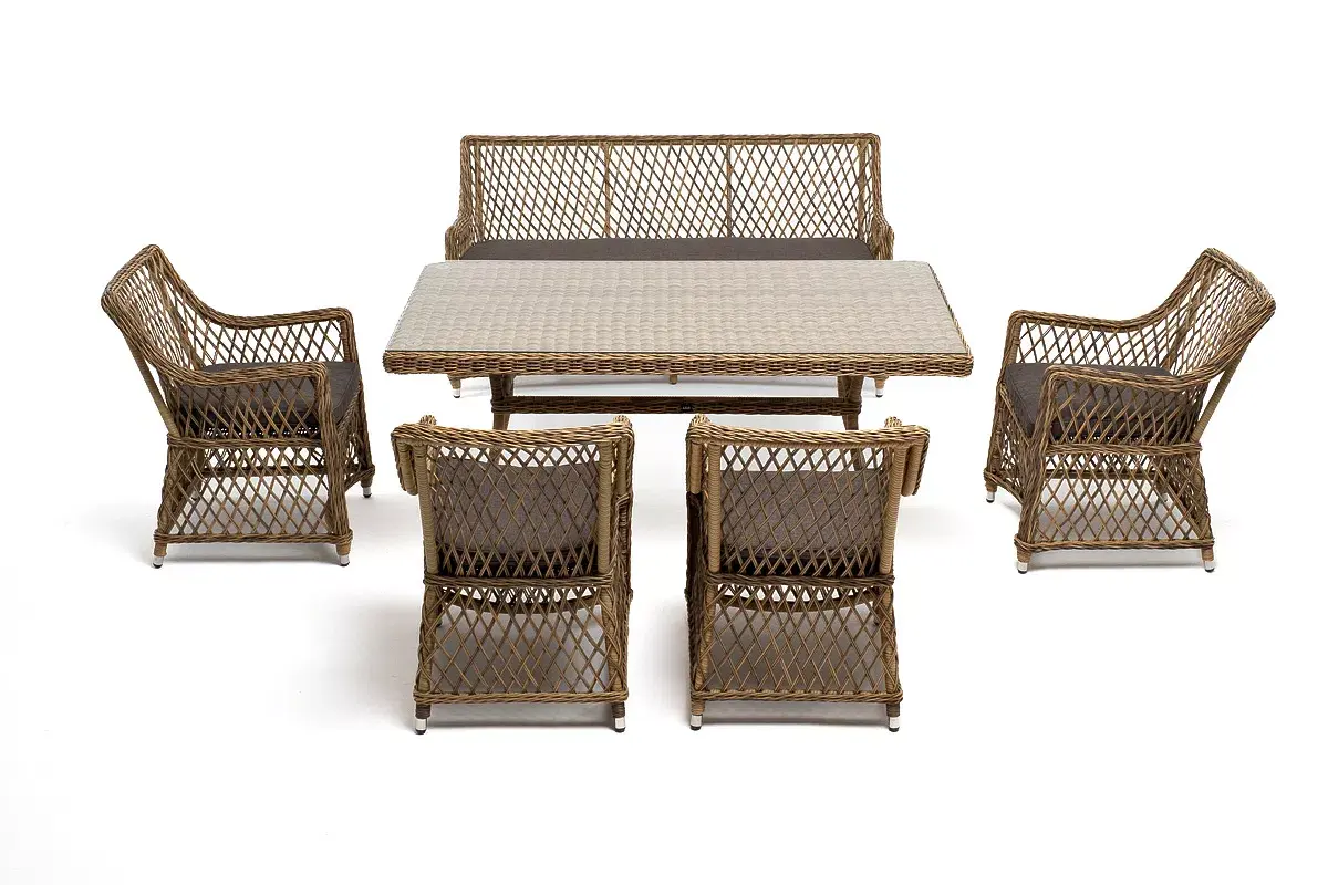 Все предметы мебели изготовлены из прочного алюминия, вручную оплетенного долговечным искусственным ротангом. На креслах и диване предусмотрены подушки со съёмными чехлами и влагостойкой пропиткой. Стол укомплектован прочным стеклом толщиной 5 мм для удобства использования.