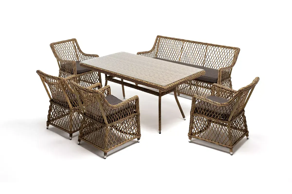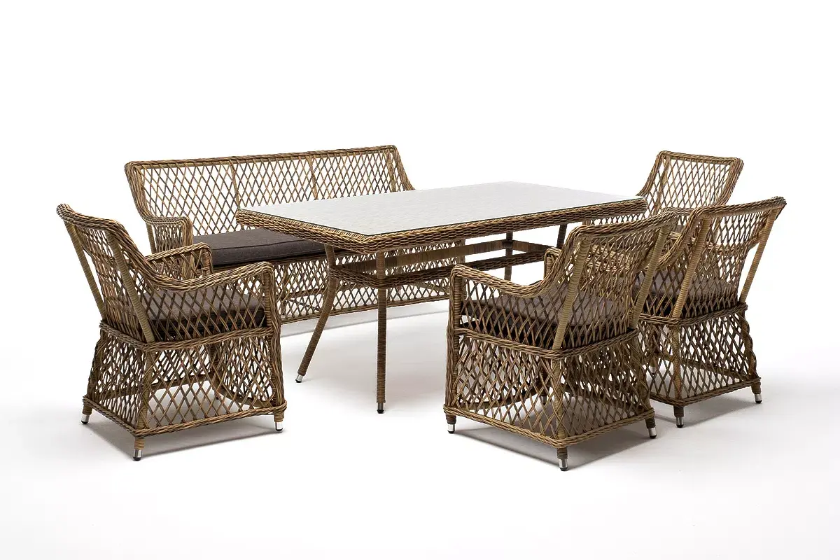 Обеденная группа выполнена в натуральном соломенном цвете. Комплект дополнит любой экстерьер в классическом стиле.