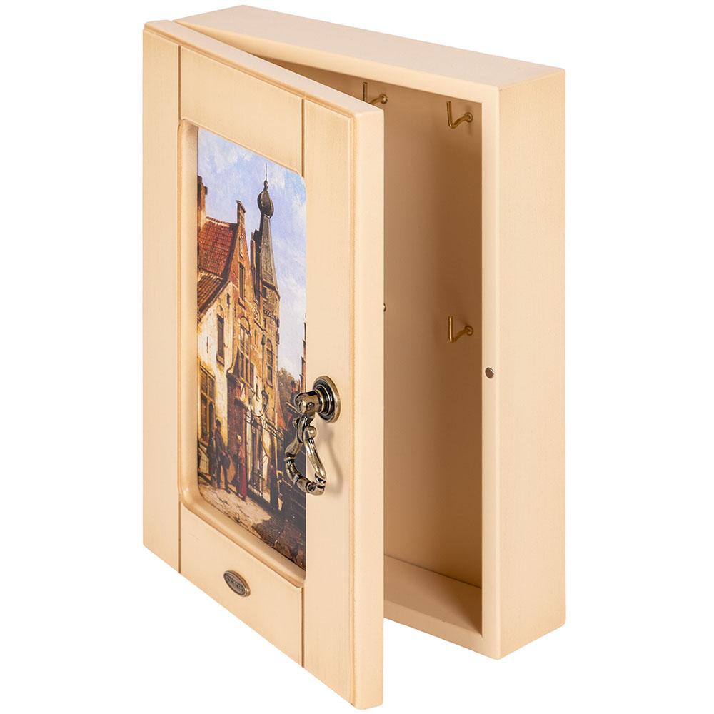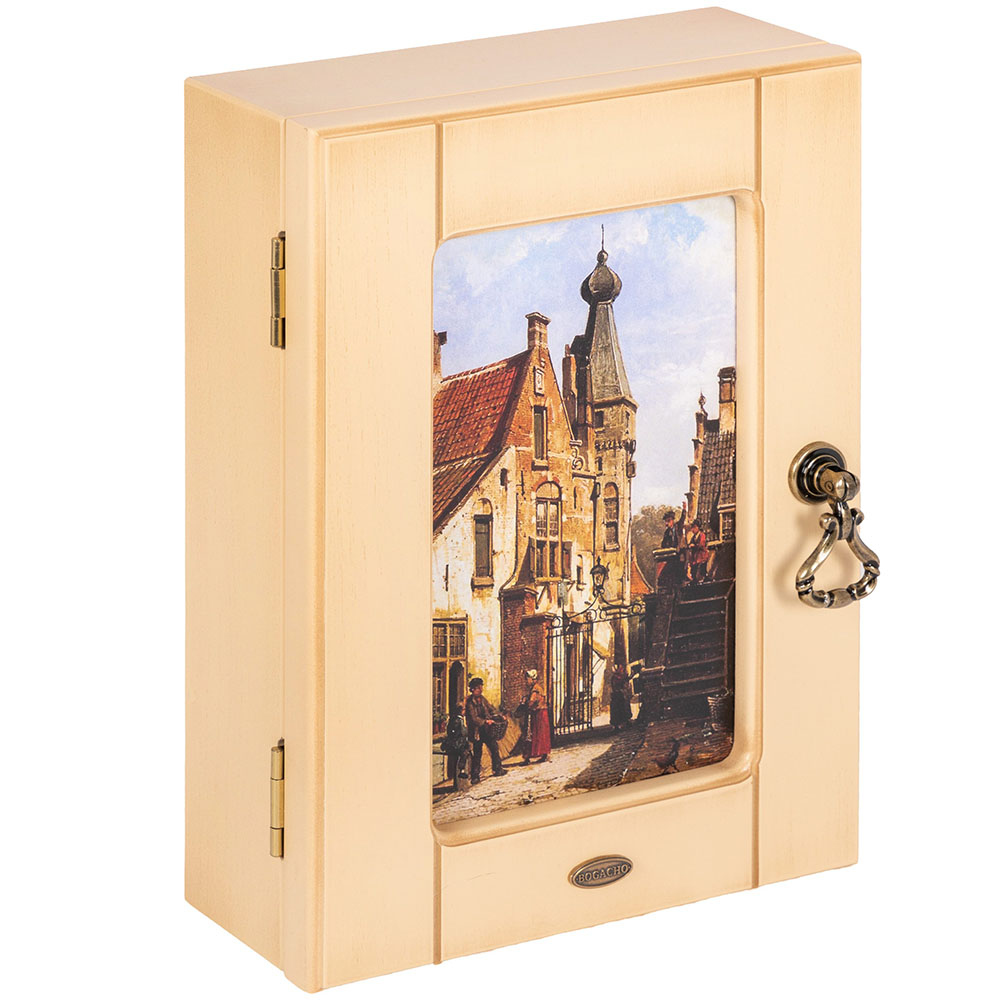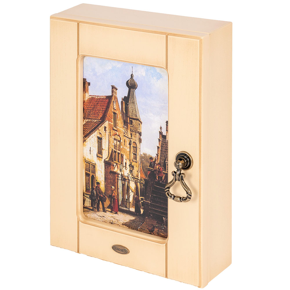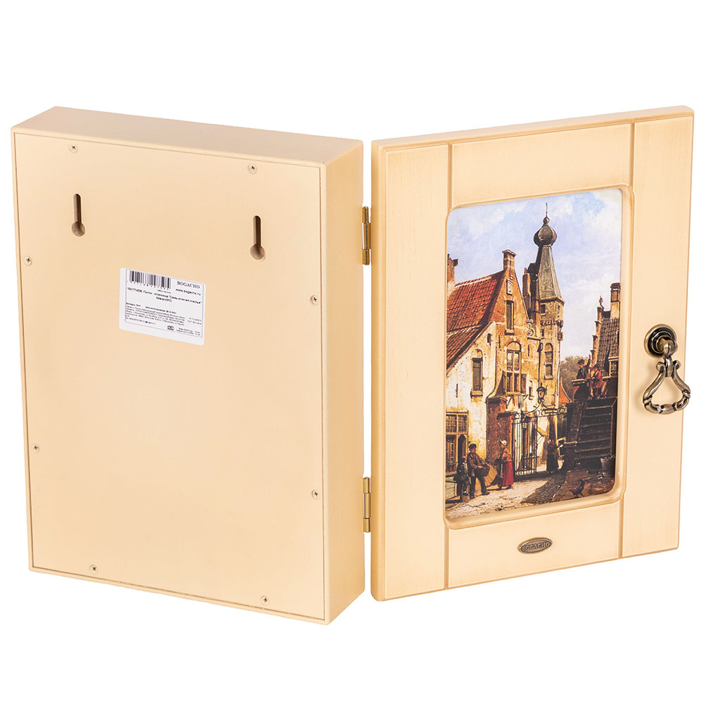 Материалы изготовления и размеры изделияКорпус ключницы изготовлен из Мдф. Дверка выполнена из натурального дерева бук. Изображение печатается на дизайнерской бумаге имитирующую фактуру холста. Фурнитура сделана из латуни испанского производства.