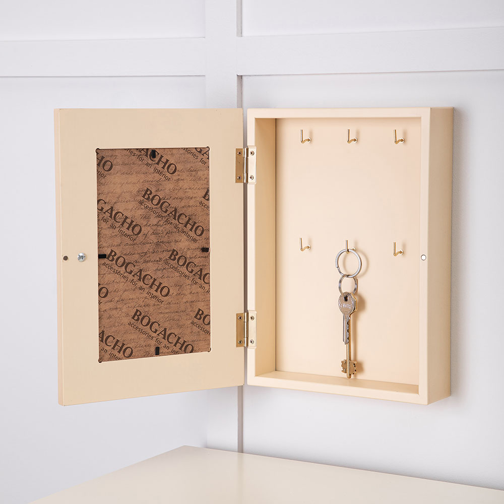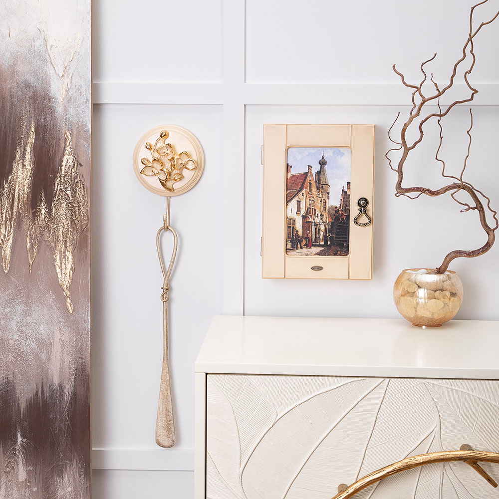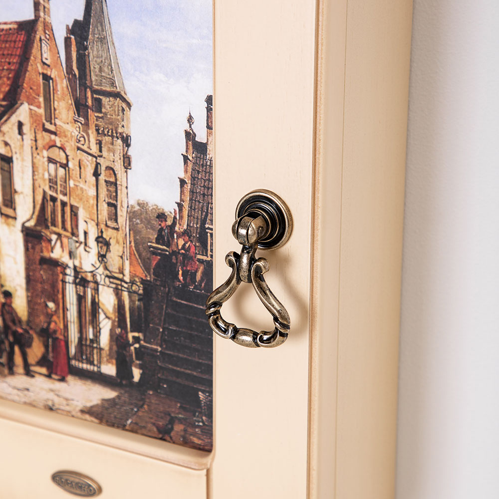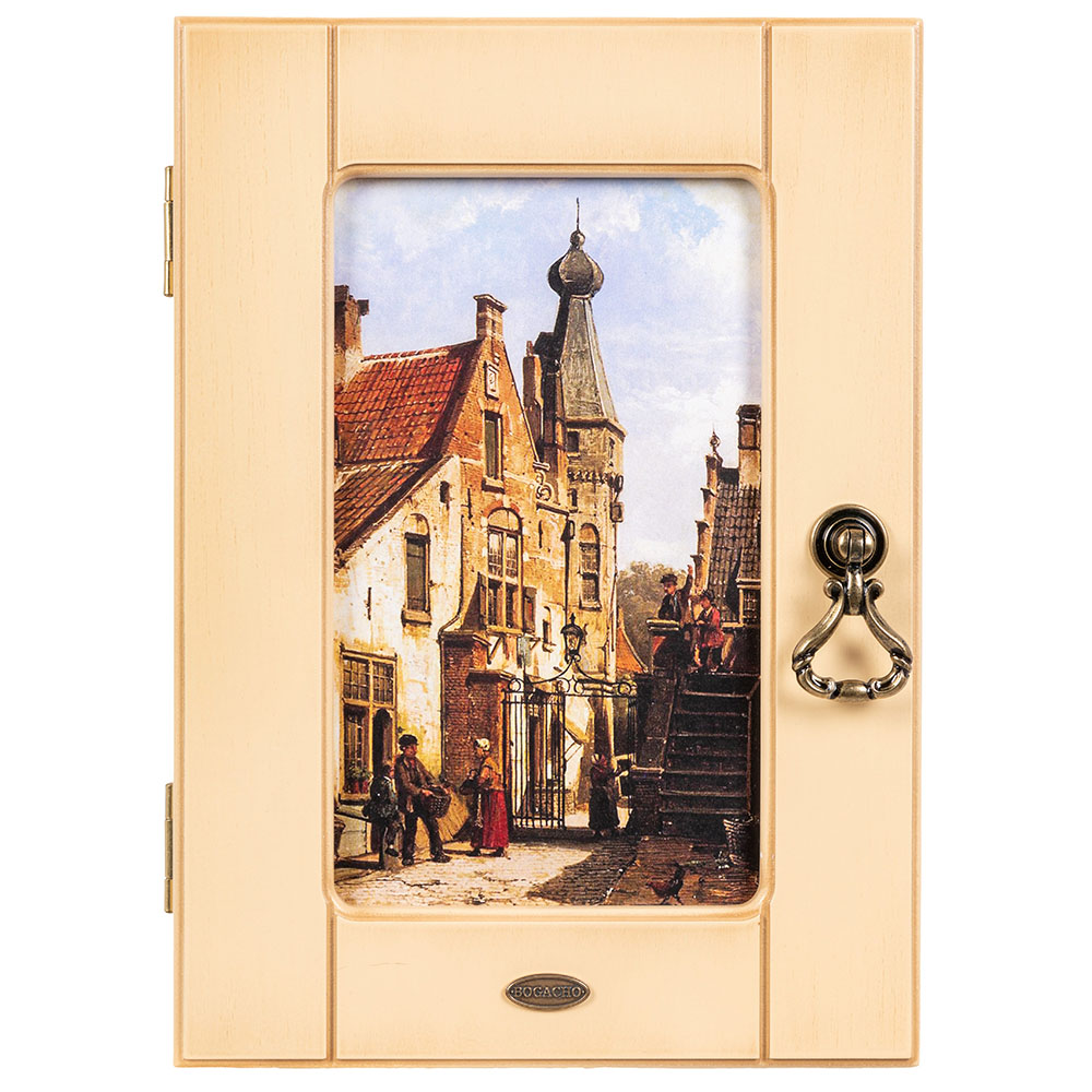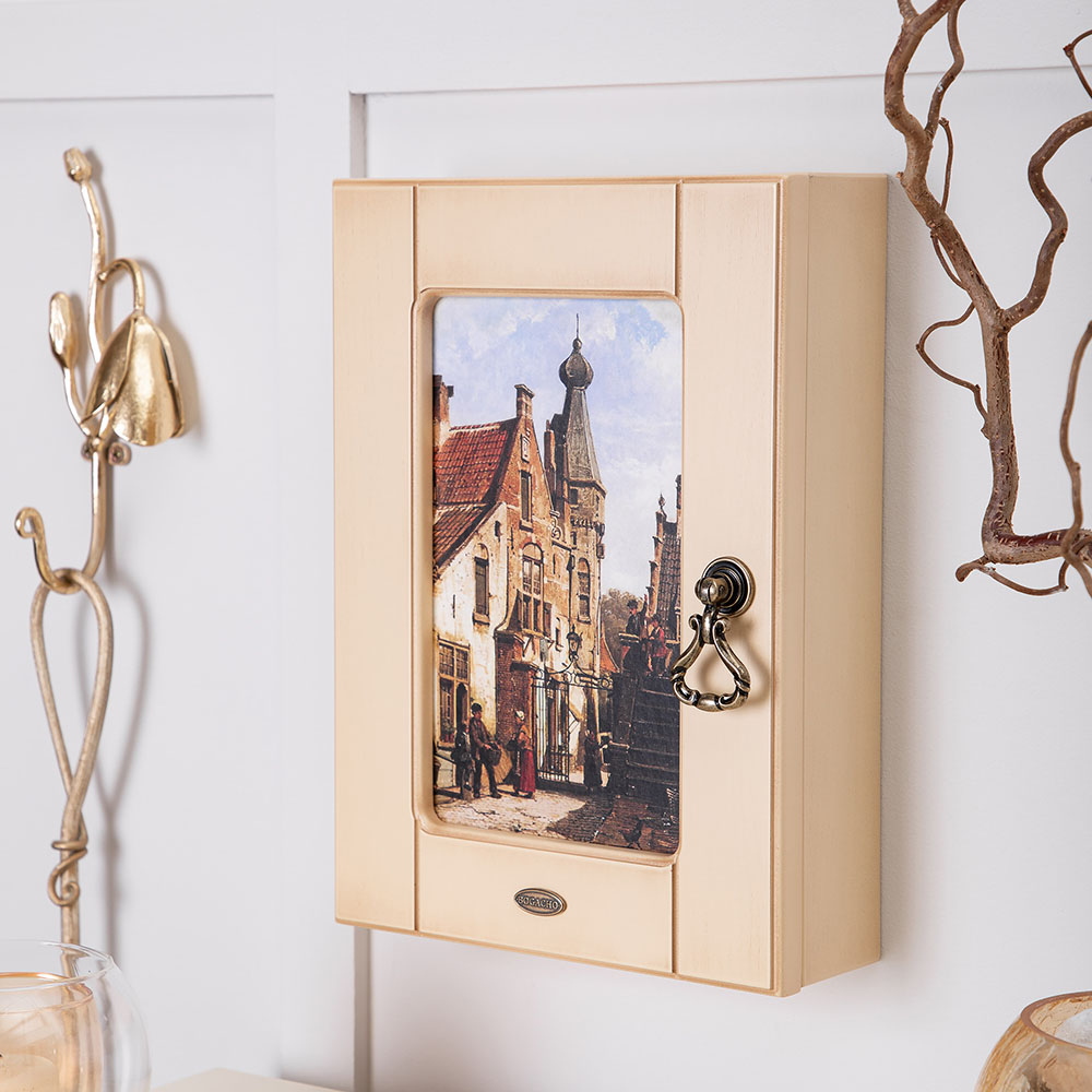 Материалы изготовления и размеры изделияКорпус ключницы изготовлен из Мдф. Дверка выполнена из натурального дерева бук. Изображение печатается на дизайнерской бумаге имитирующую фактуру холста. Фурнитура сделана из латуни испанского производства.