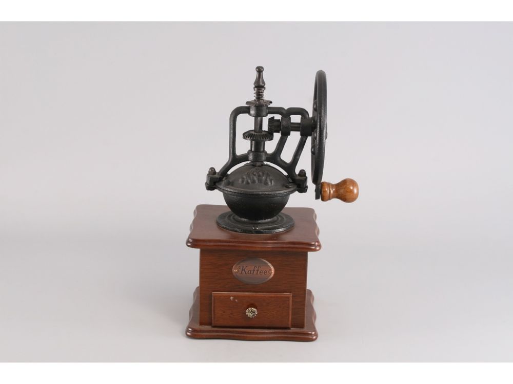 Корпус кофемолки, с выдвижным ящичком для молотого кофе, выполнен из дерева, механическая часть выполнена из чугуна.