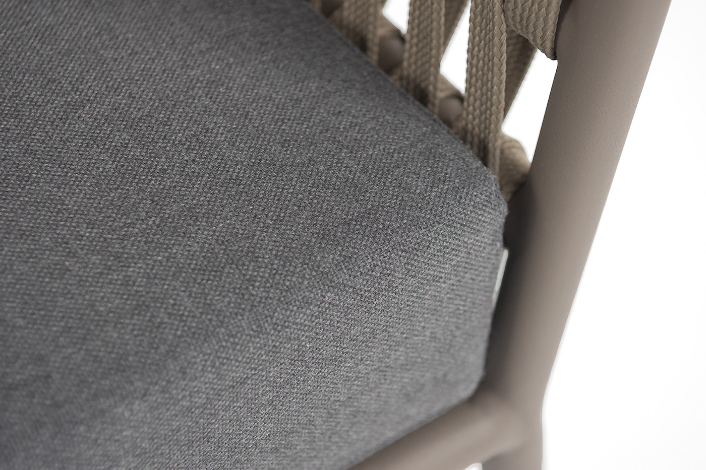 Синтетические ленты, изготовленные из высокопрочных полиэфирных волокон, образуют сложный узор, который притягивает взгляд. Серо-коричневый цвет плетения гармонично сочетается с цветом каркаса, создавая целостный и стильный образ.