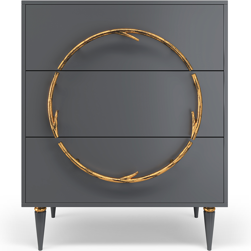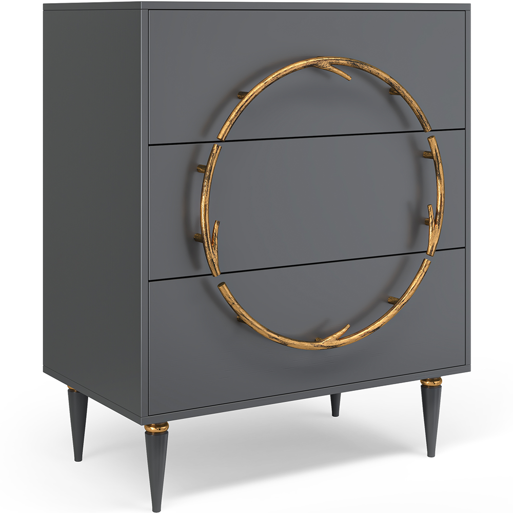 Комод представлен в двух цветах: белый / серый. Особое украшение белого комода - фасад с тропическими листьями, серый вариант однотонный. Изюминка изделия – шикарная кованая ручка округлой формы – ручная работа кузнеца. Покрытие на ножках комода различается в зависимости от модели.