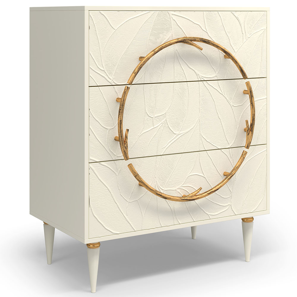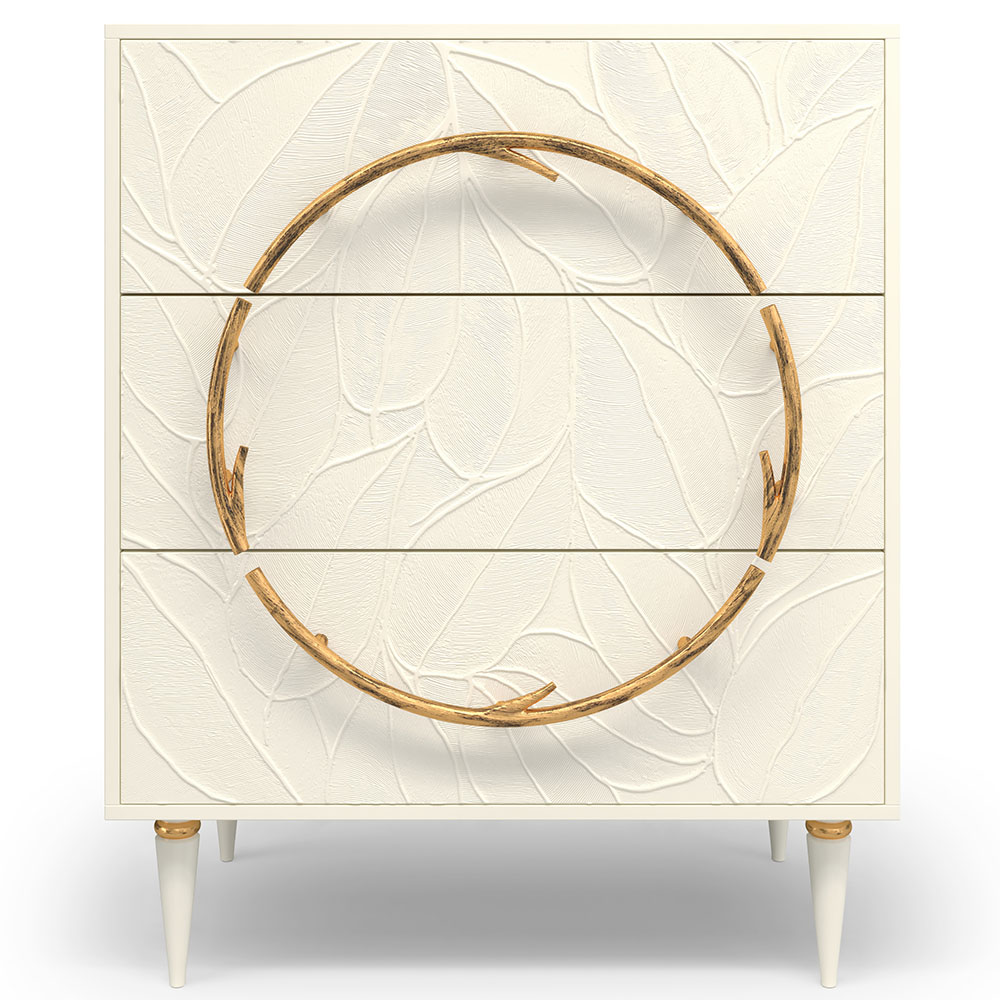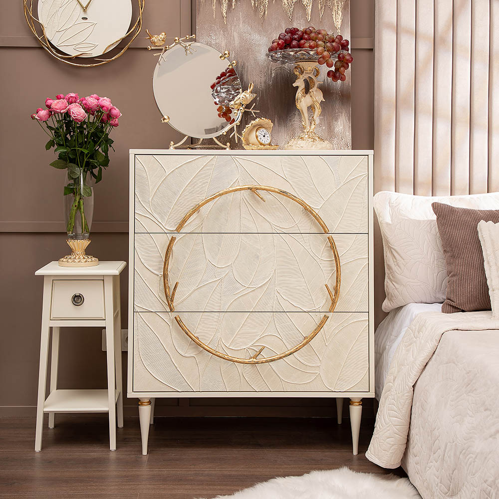 Комод изготовлен из высококачественного МДФ. Покрытие износостойкое, не требует особого ухода. Достаточно протереть поверхность слегка влажной тряпочкой. Ручка выполнена из кованой стали. Высота ножек - 19,8 см.