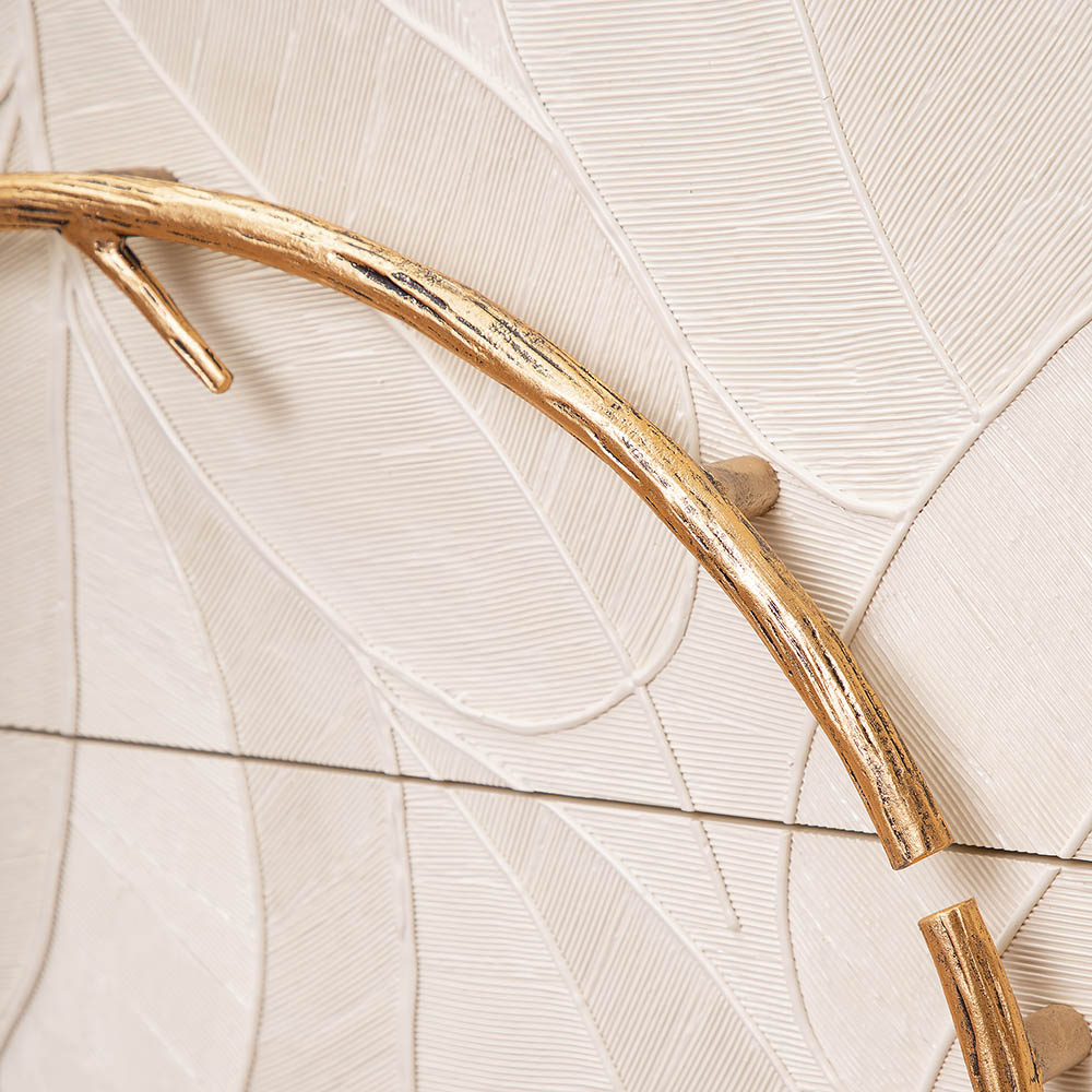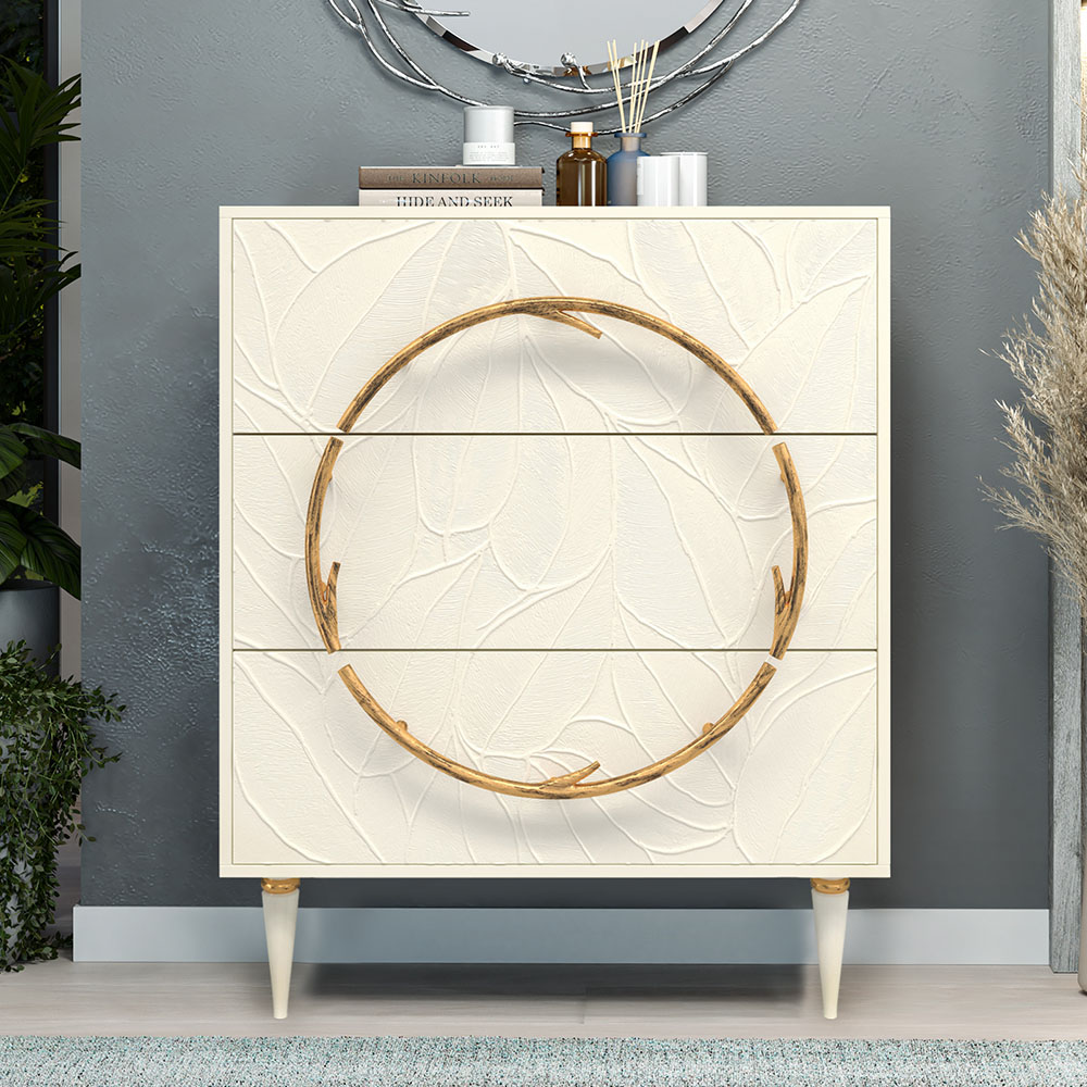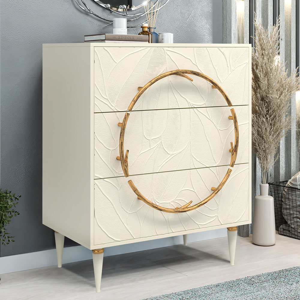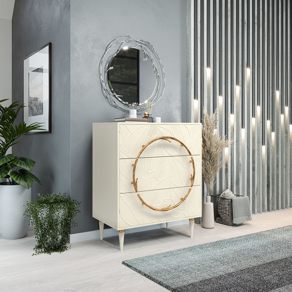 Комод изготовлен из высококачественного МДФ. Покрытие износостойкое, не требует особого ухода. Достаточно протереть поверхность слегка влажной тряпочкой. Ручка выполнена из кованой стали. Высота ножек - 19,8 см.