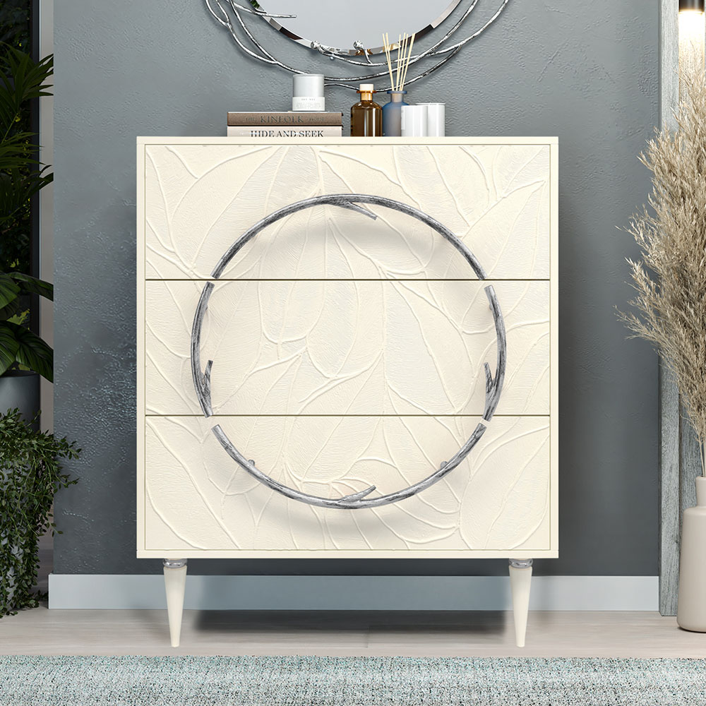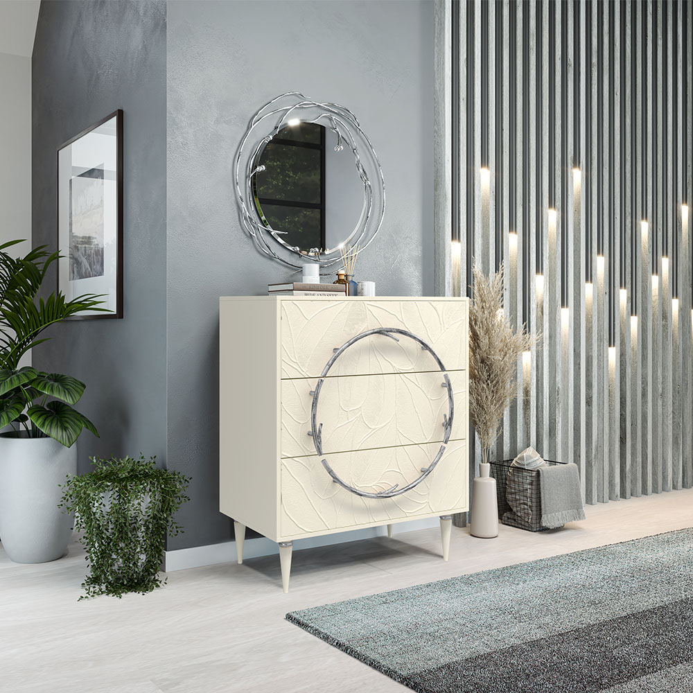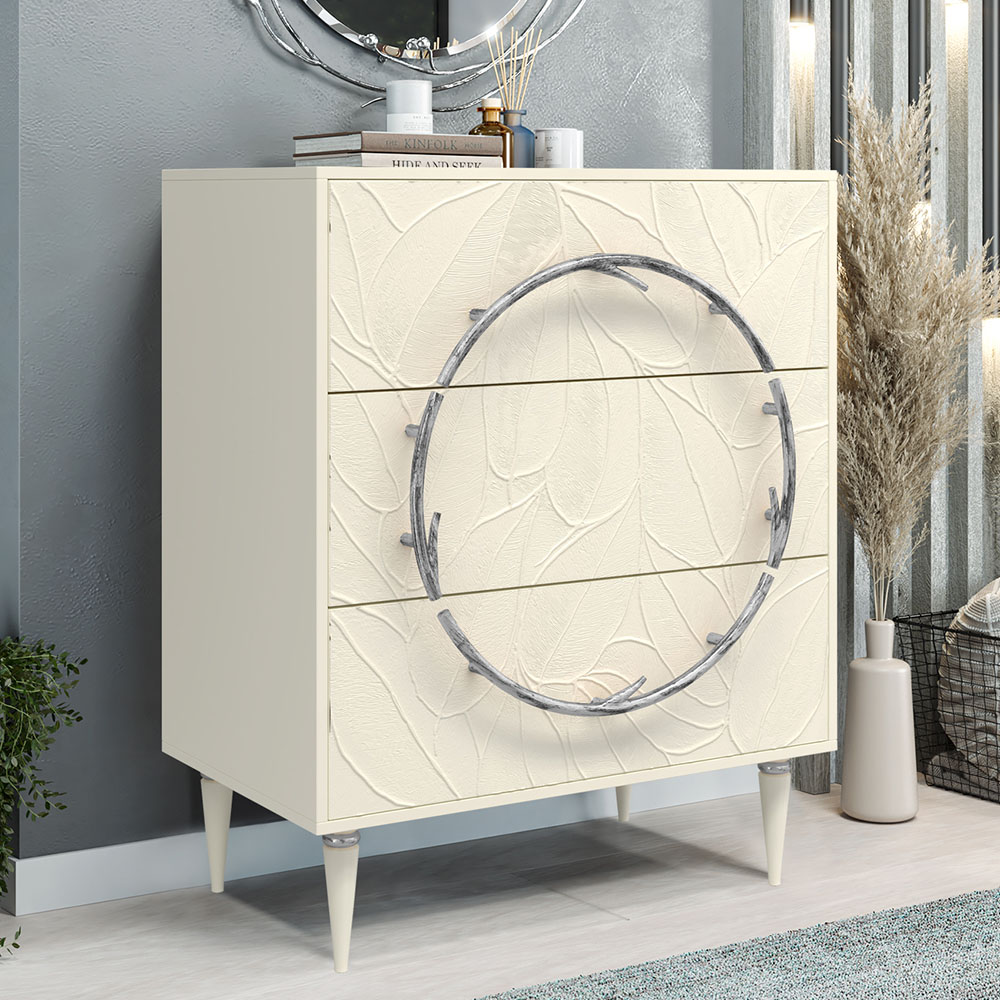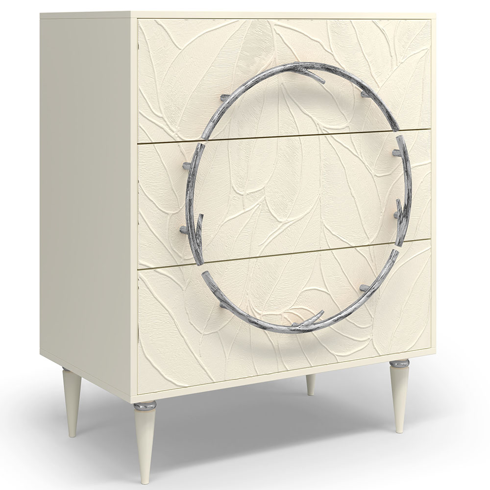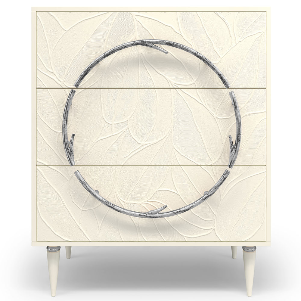 Комод изготовлен из высококачественного мдф. Покрытие износостойкое, не требует особого ухода. Достаточно протереть поверхность слегка влажной тряпочкой. Ручка выполнена из кованой стали. Высота ножек - 19,8 см.