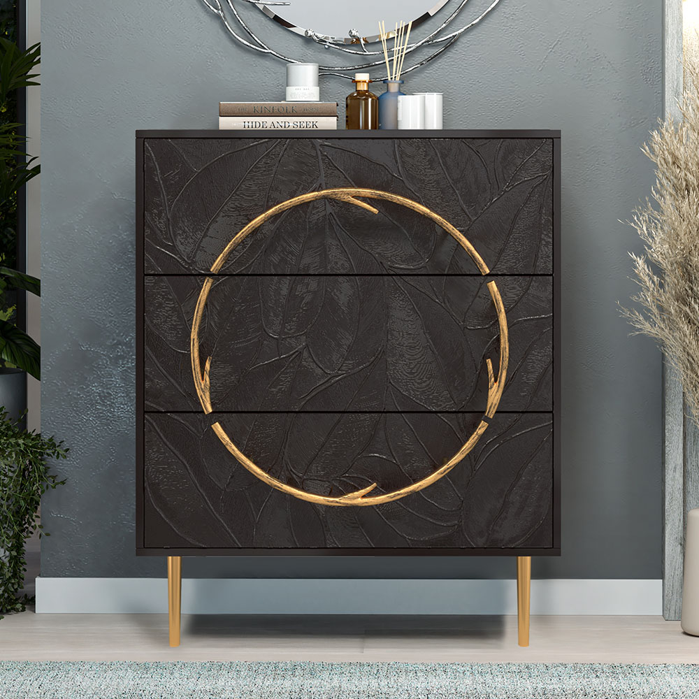 Комод изготовлен из высококачественного МДФ. Покрытие износостойкое, не требует особого ухода. Достаточно протереть поверхность слегка влажной тряпочкой. Ручка выполнена из кованой стали. Высота ножек - 19,8 см.