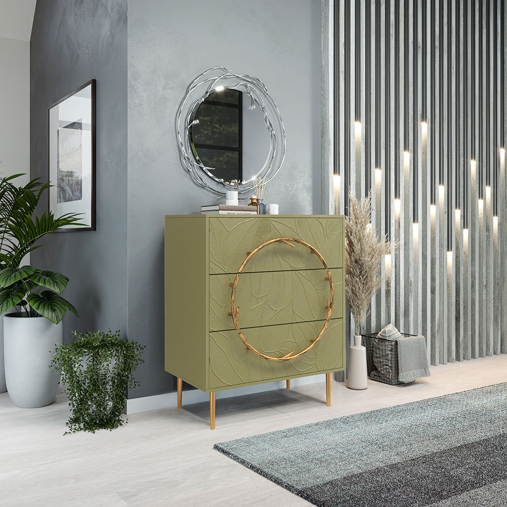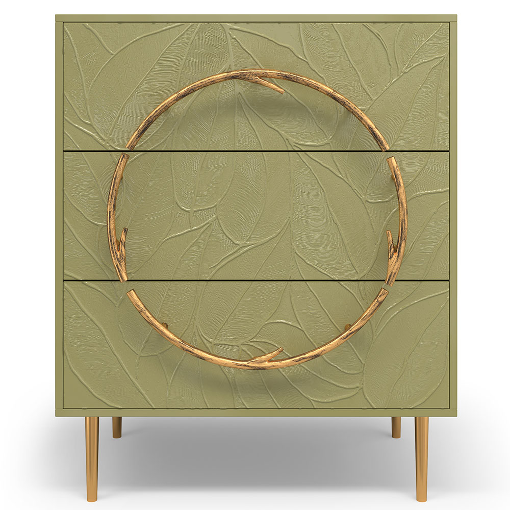 Комод изготовлен из высококачественного МДФ. Покрытие износостойкое, не требует особого ухода. Достаточно протереть поверхность слегка влажной тряпочкой. Ручка выполнена из кованой стали. Высота ножек - 19,8 см.