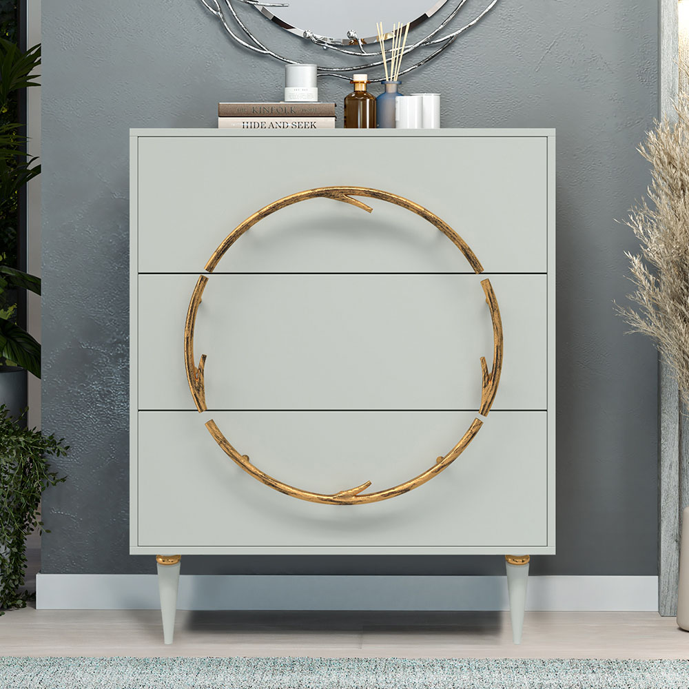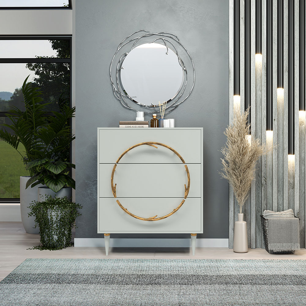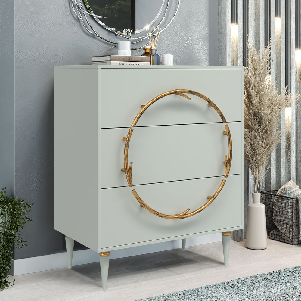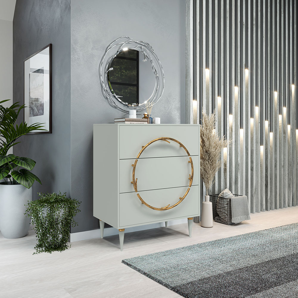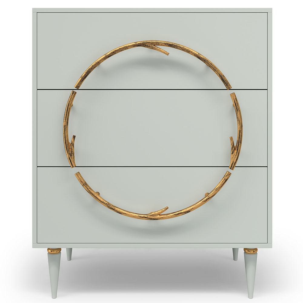 Комод изготовлен из высококачественного МДФ. Покрытие износостойкое, не требует особого ухода. Достаточно протереть поверхность слегка влажной тряпочкой. Ручка выполнена из кованой стали. Высота ножек - 19,8 см.