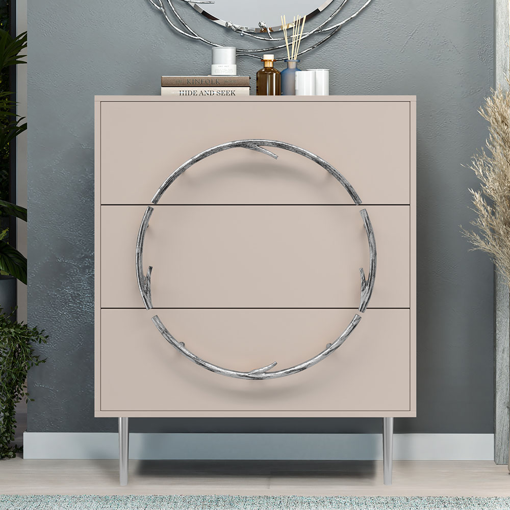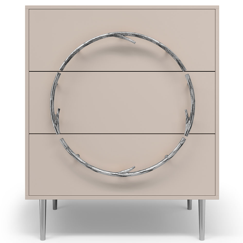 Комод изготовлен из высококачественного мдф. Покрытие износостойкое, не требует особого ухода. Достаточно протереть поверхность слегка влажной тряпочкой. Ручка выполнена из кованой стали. Высота ножек - 19,8 см.