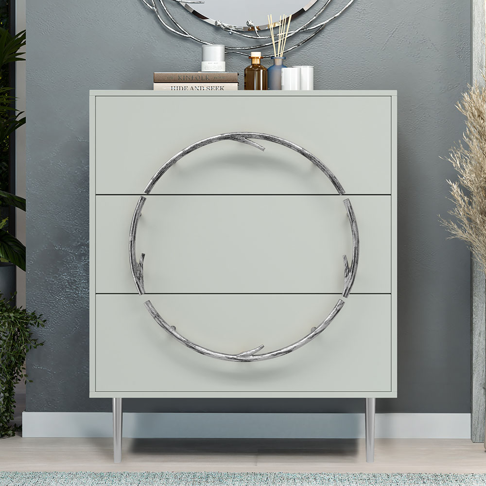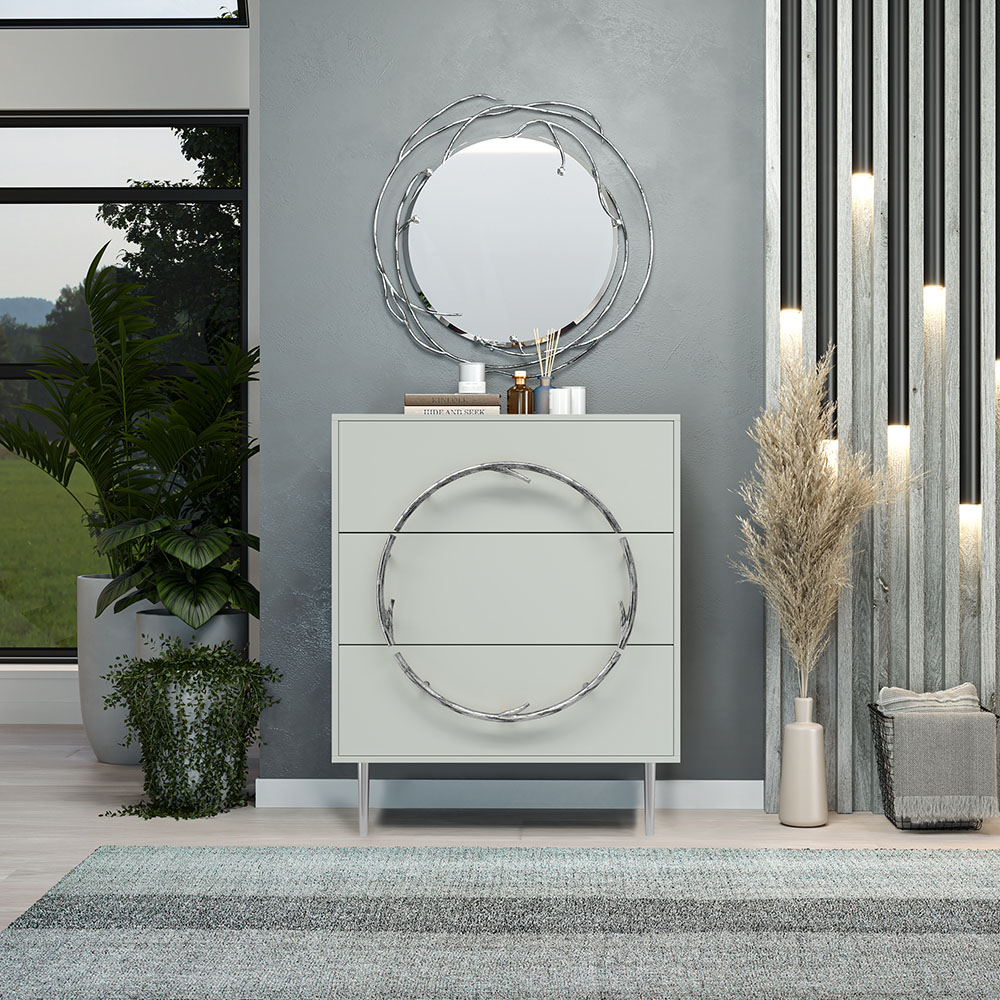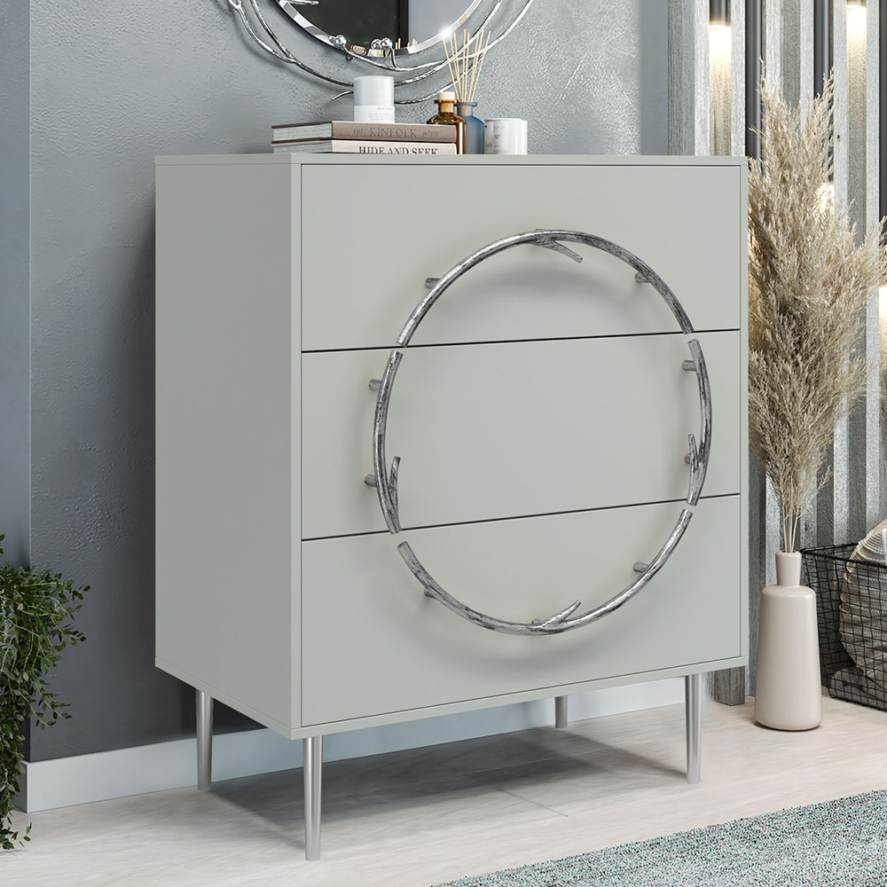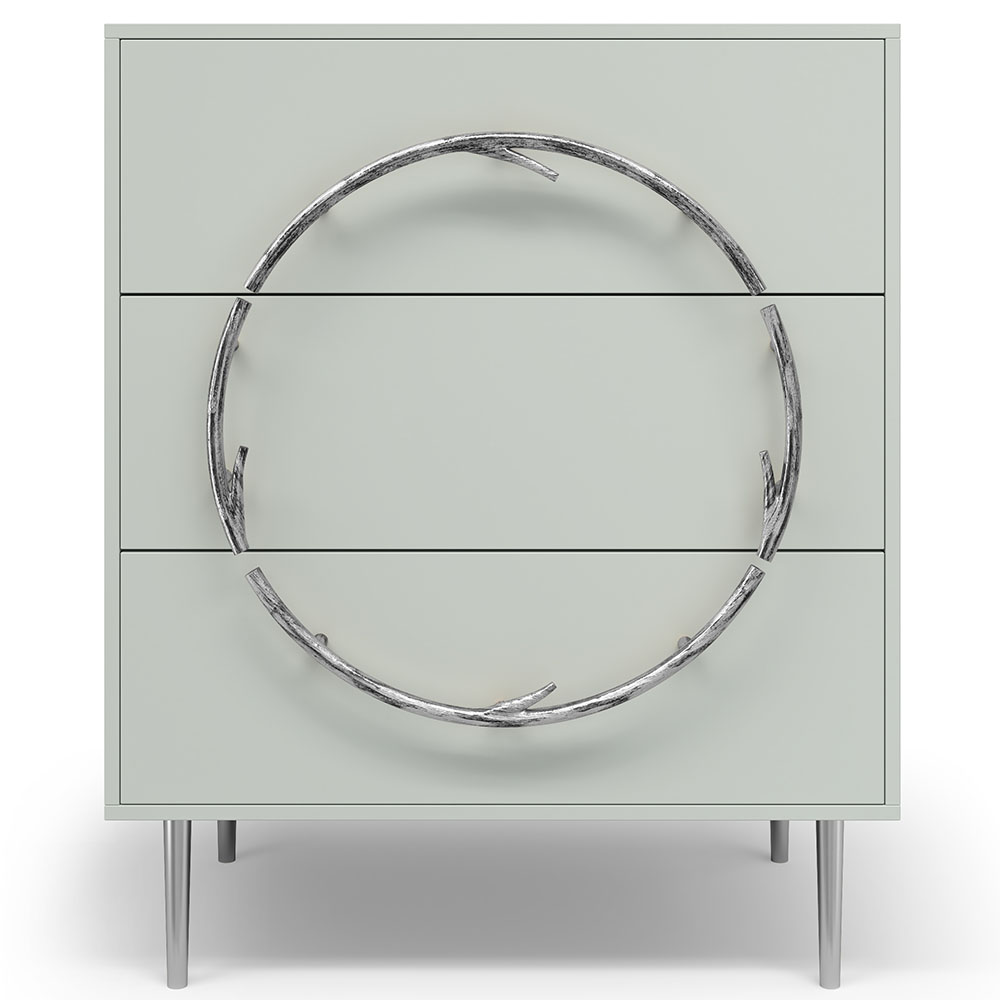 Комод изготовлен из высококачественного МДФ. Покрытие износостойкое, не требует особого ухода. Достаточно протереть поверхность слегка влажной тряпочкой. Ручка выполнена из кованой стали. Высота ножек - 19,8 см.