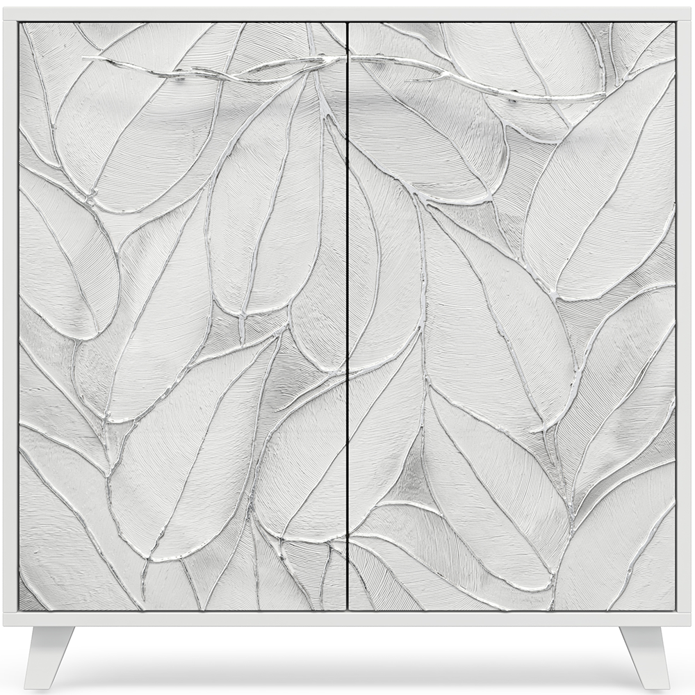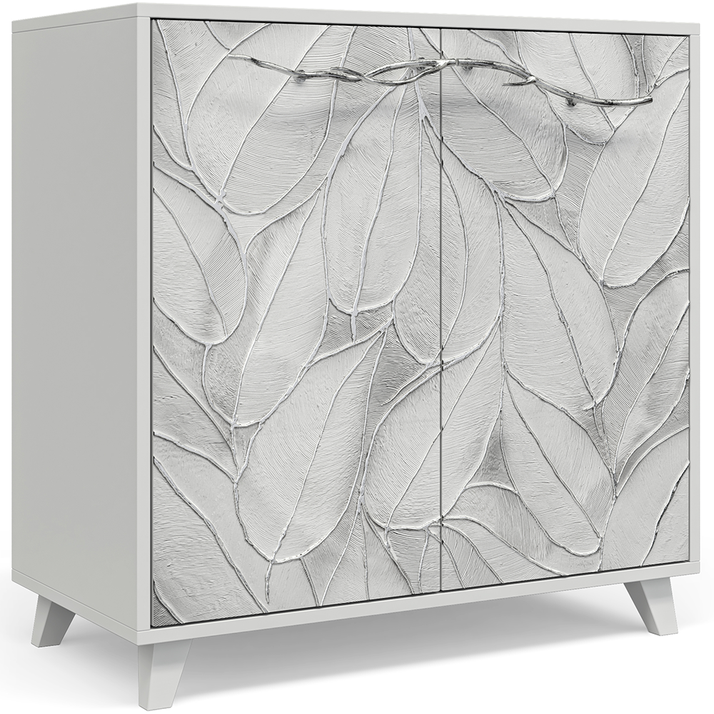 Комод с дверцами Арт напоминает своей конструкцией мини-шкаф небольшой высоты с двумя отделениями с полками для хранения вещей, скрытыми за распашными дверцами. Комод представлен в двух цветах: белый / серый. Особое украшение белого комода - фасад с тропическими листьями, серый вариант однотонный. Изюминка изделия – шикарная кованая ручка в форме ветви дерева – ручная работа кузнеца. Покрытие на ножках комода различается в зависимости от модели. Комод деревянный: корпус выполнен из высококачественного мдф, ножки – из бука. Он отлично подойдет для прихожей, гостиной, коридора, спальни, детской. При этом его поверхность можно использовать в качестве подставки для цветов, для декора, книг, светильника.Простые линии форм, универсальные цвета, неброский декор позволяют легко вписать такую мебель в современный интерьер, даже такой минималистичный как сканди.