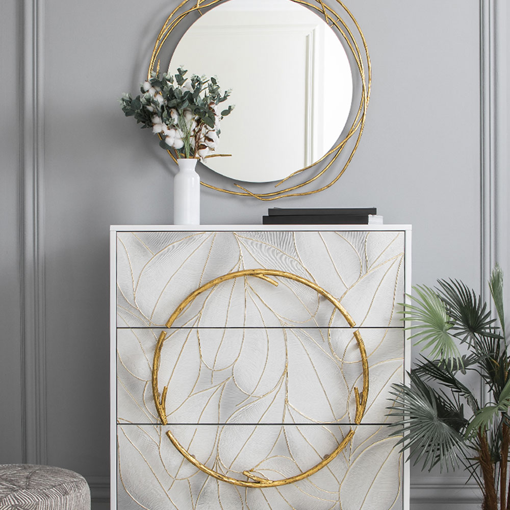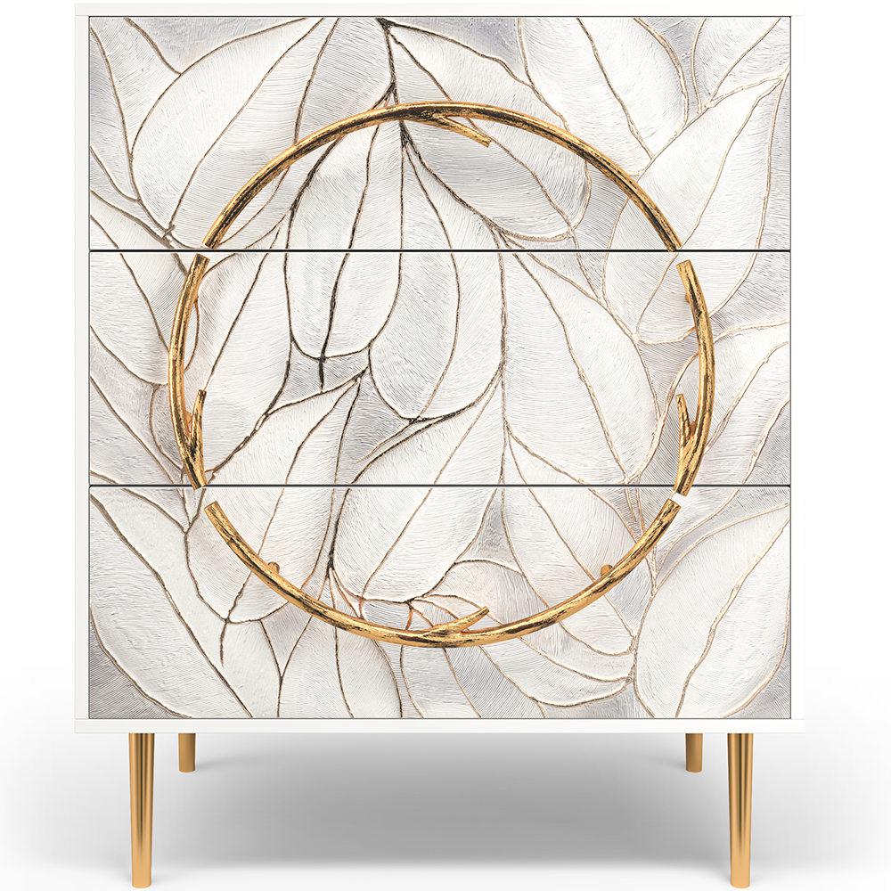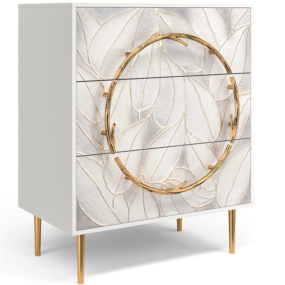 Комод представлен в двух цветах: белый / серый. Особое украшение белого комода - фасад с тропическими листьями, серый вариант однотонный. Изюминка изделия – шикарная кованая ручка округлой формы – ручная работа кузнеца. Покрытие на ножках комода различается в зависимости от модели.