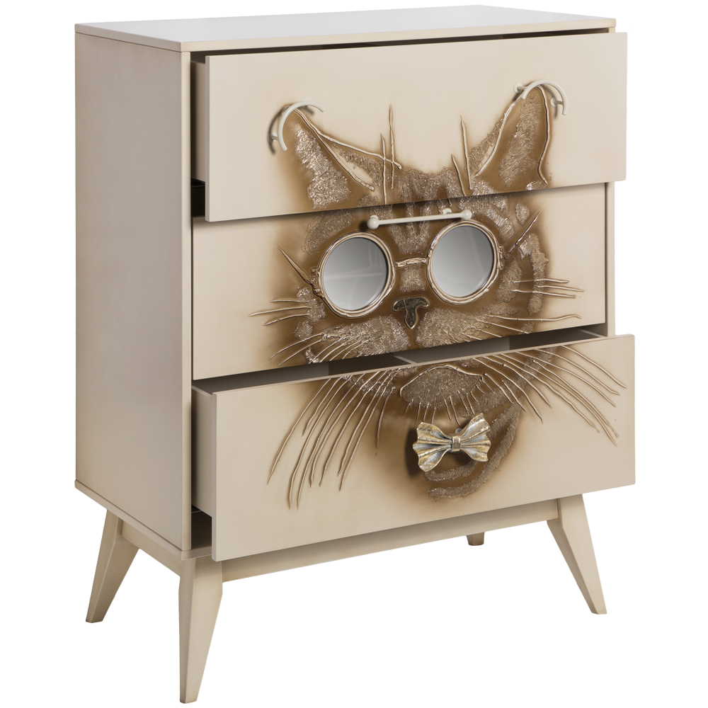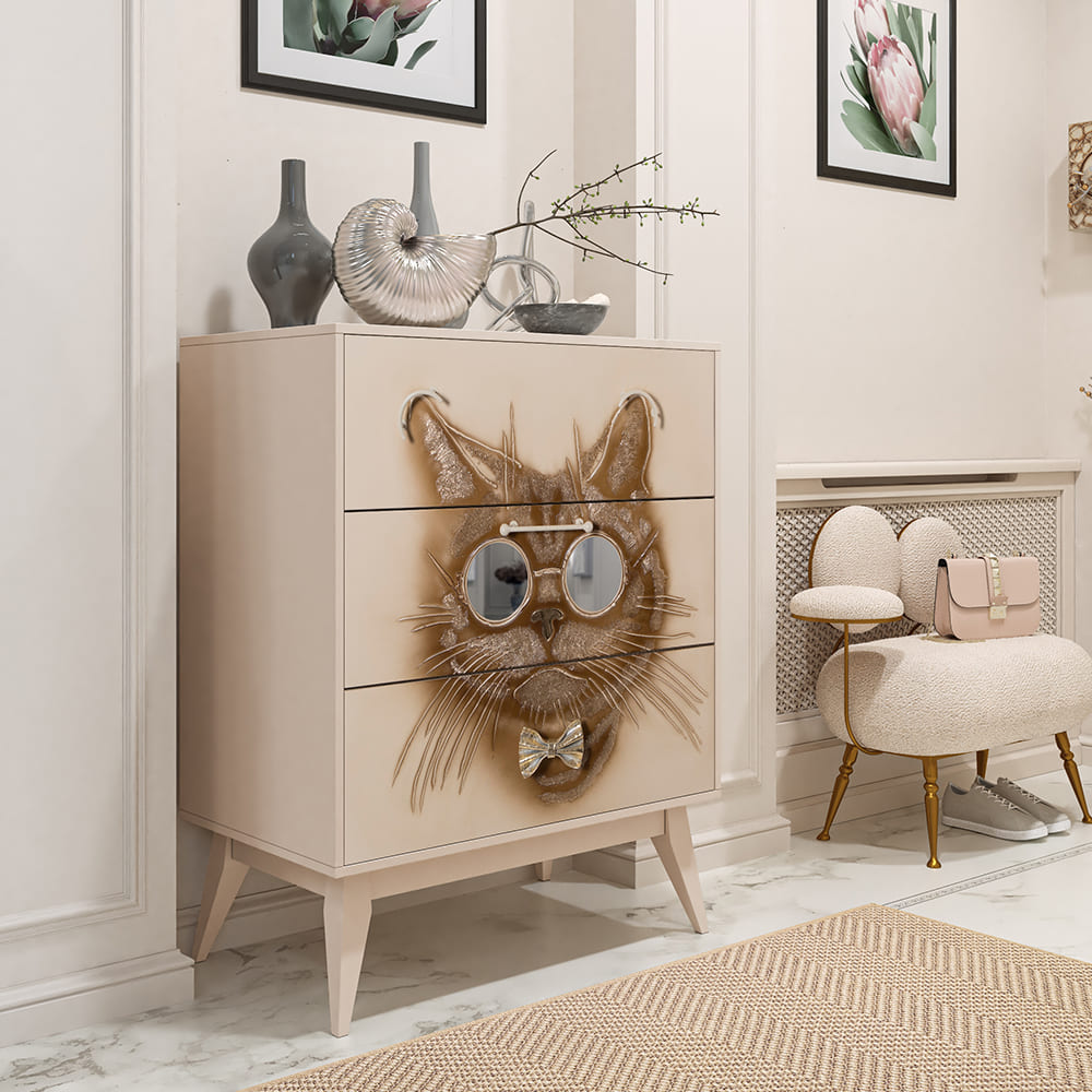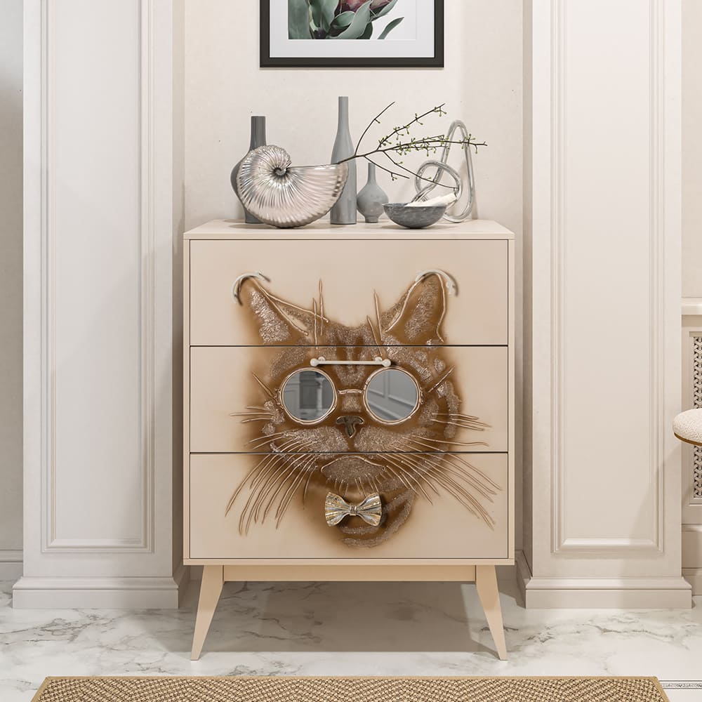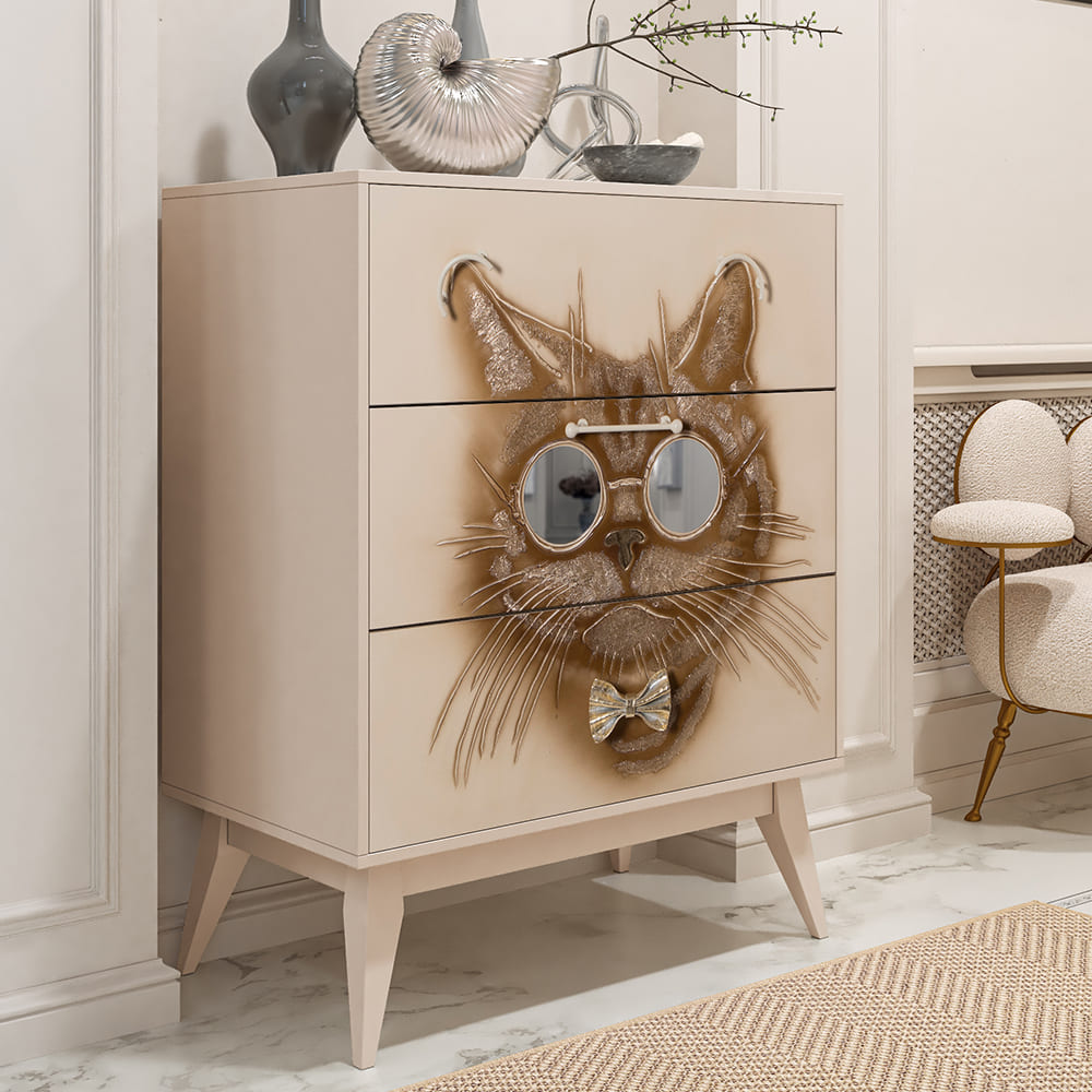 Комод BOGACHO Кот Саймон бежевый из коллекции Фьюжин – это образ современности вне времени.Конические ножки и прочный каркас выполнены из МДФ, декоративные элементы изготовлены вручную из мраморной пудры и легированной стали вручную. Комод имеет три выдвижных ящика и доставляется в собранном виде.Добавьте в интерьер своего пространства уюта и атмосферу гармонии вместе с эксклюзивными изделиями BOGACHO.