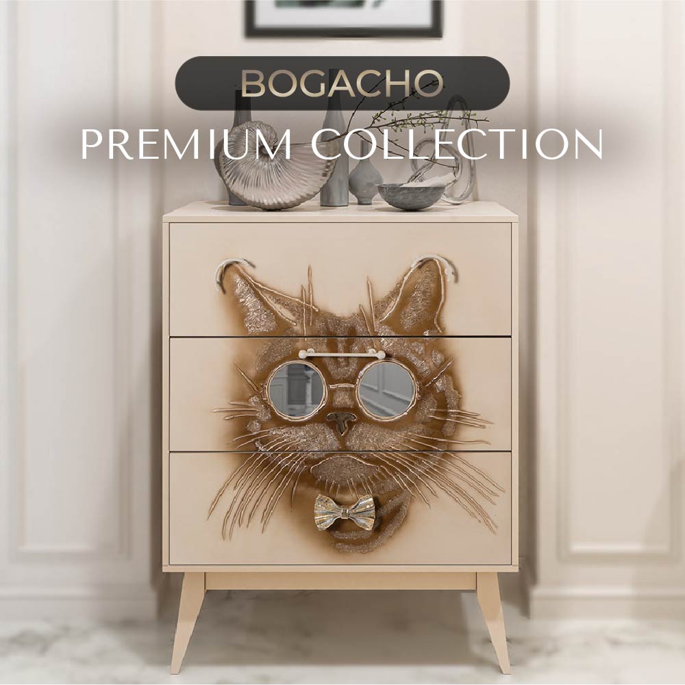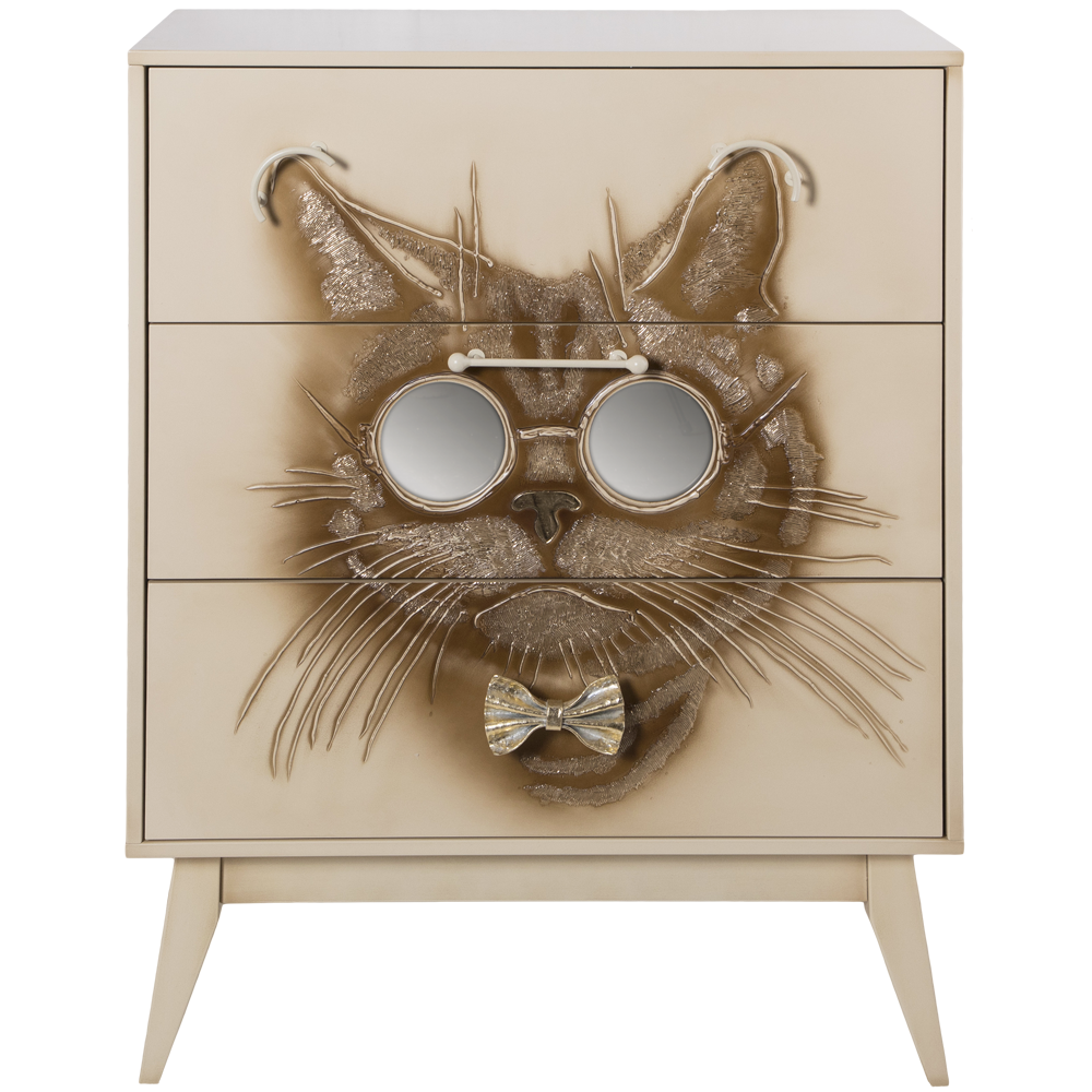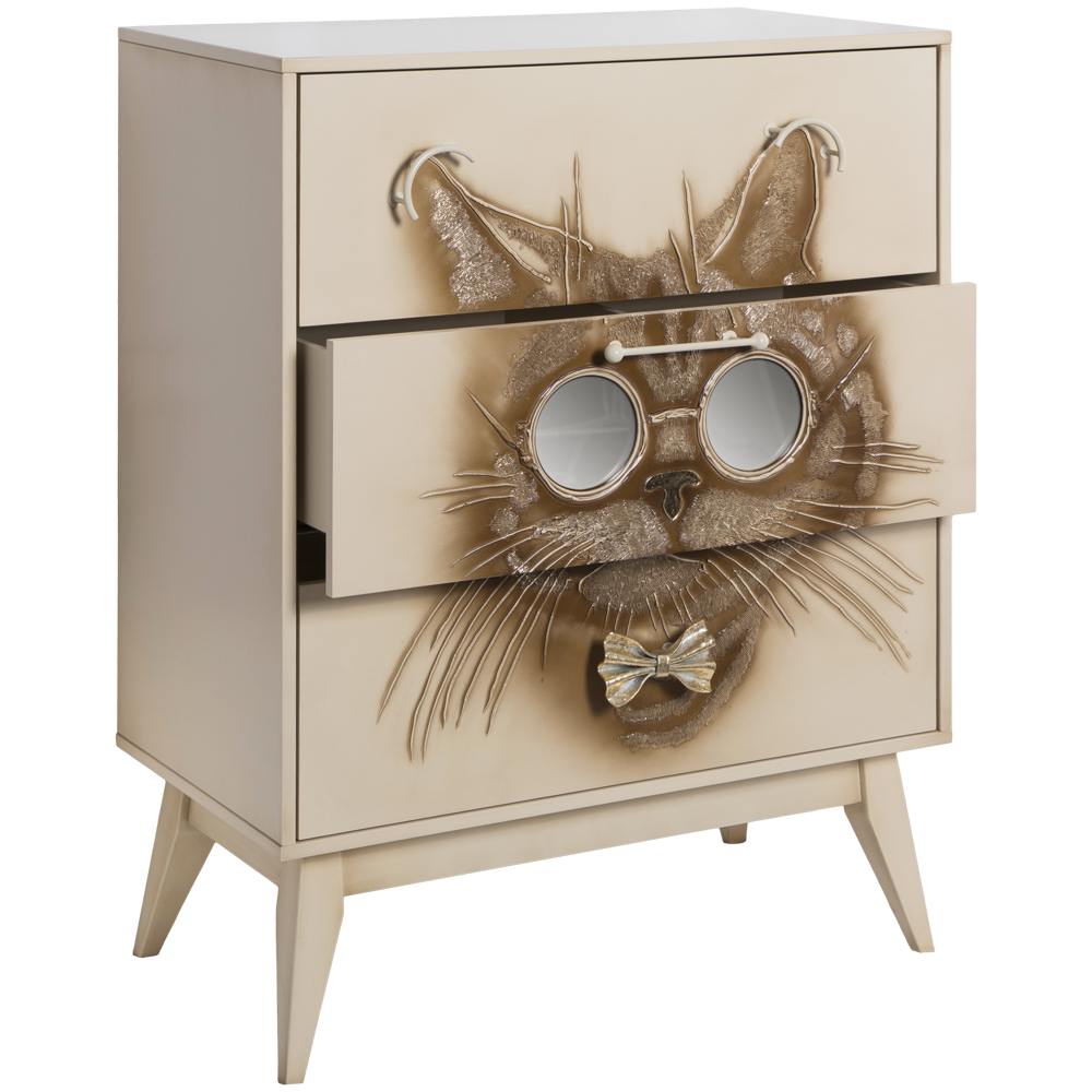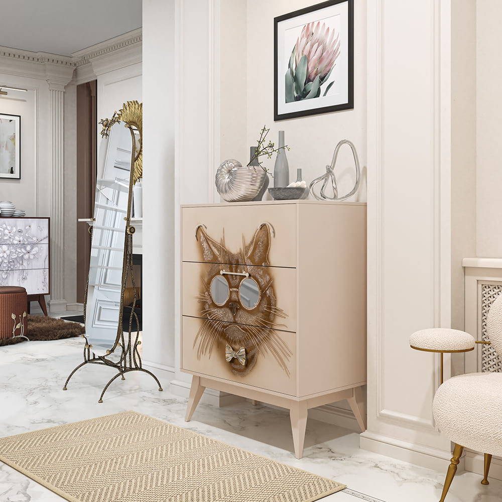 Комод BOGACHO Кот Саймон бежевый из коллекции Фьюжин – это образ современности вне времени.Конические ножки и прочный каркас выполнены из МДФ, декоративные элементы изготовлены вручную из мраморной пудры и легированной стали вручную. Комод имеет три выдвижных ящика и доставляется в собранном виде.Добавьте в интерьер своего пространства уюта и атмосферу гармонии вместе с эксклюзивными изделиями BOGACHO.