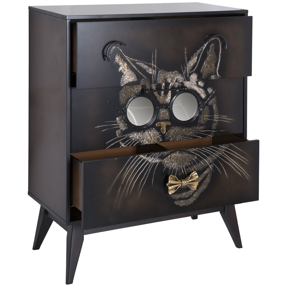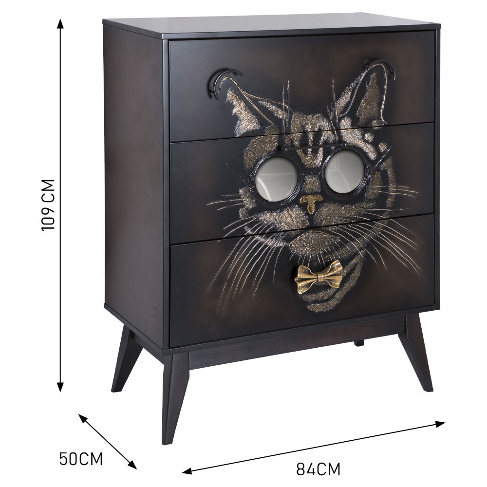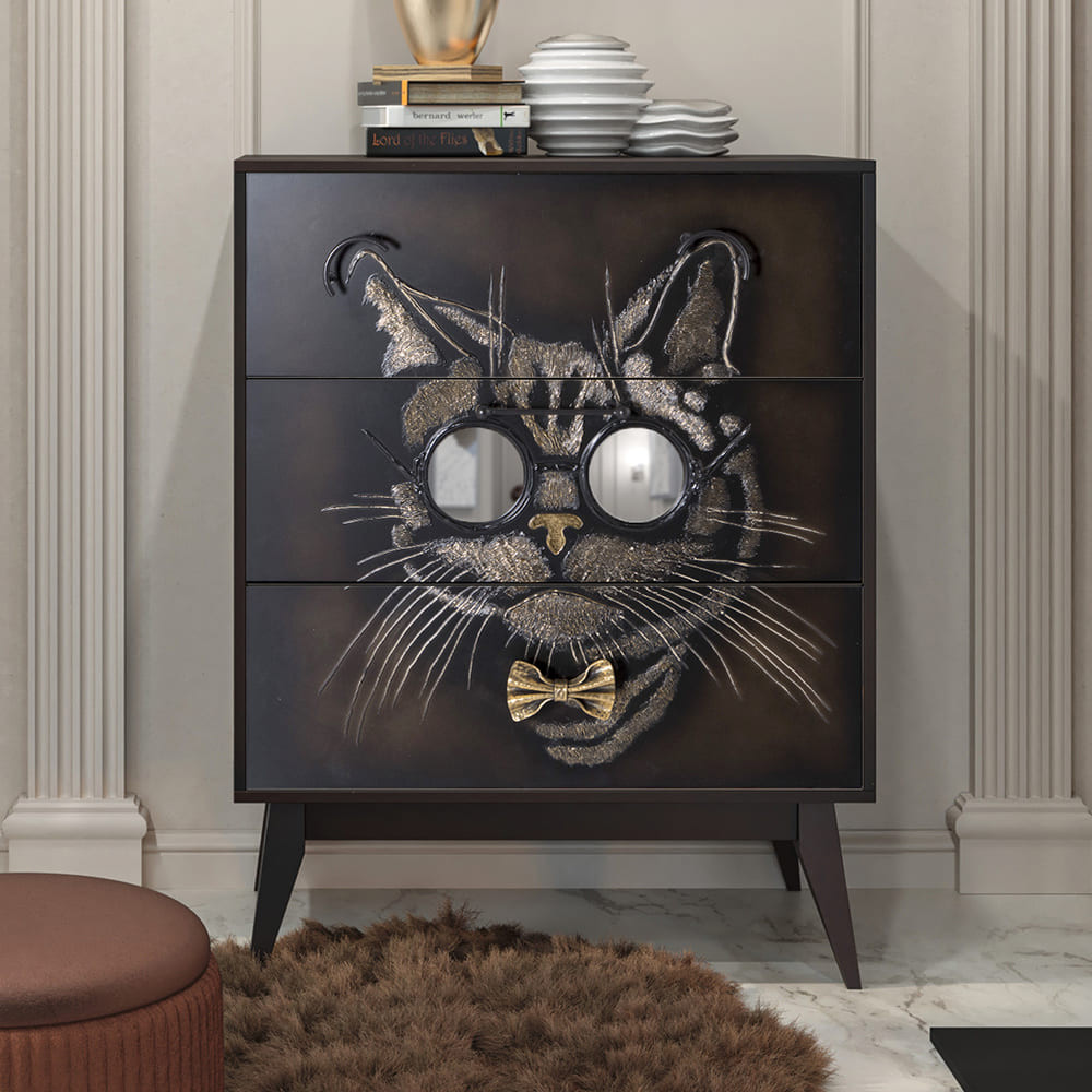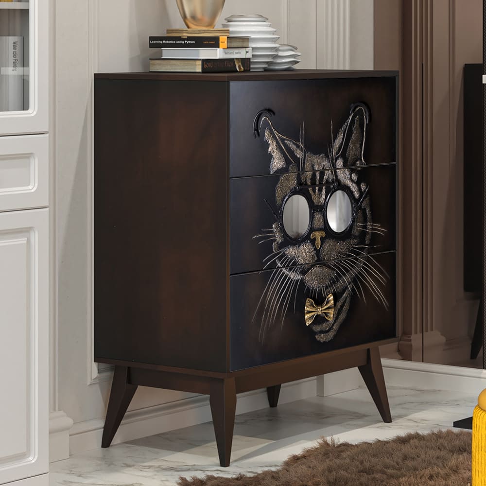 Комод BOGACHO Кот Саймон коричневый из коллекции Фьюжин – это образ современности вне времени.Конические ножки и прочный каркас выполнены из мдф, декоративные элементы изготовлены вручную из мраморной пудры и легированной стали вручную. Комод имеет три выдвижных ящика и доставляется в собранном виде.Добавьте в интерьер своего пространства уюта и атмосферу гармонии вместе с эксклюзивными изделиями BOGACHO.