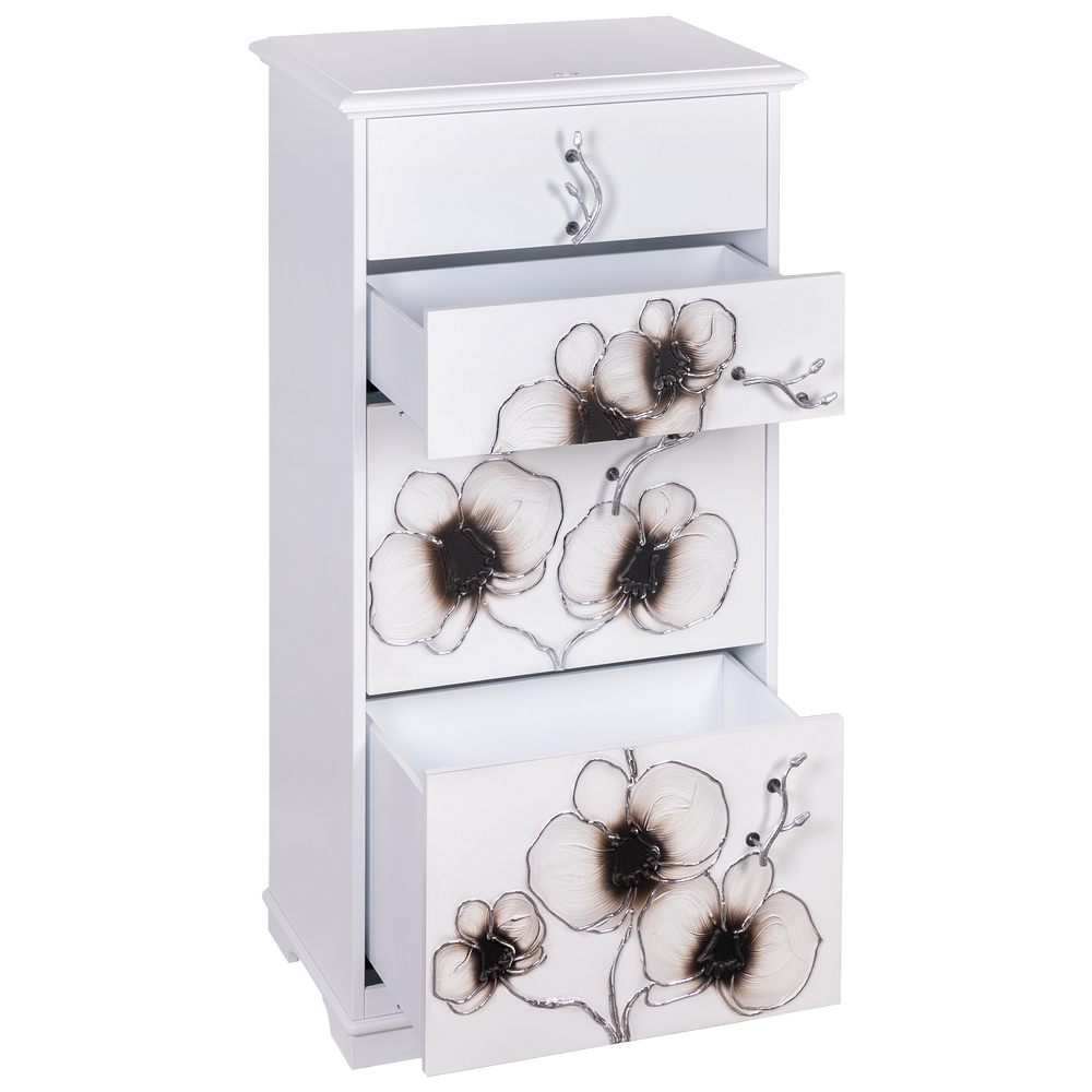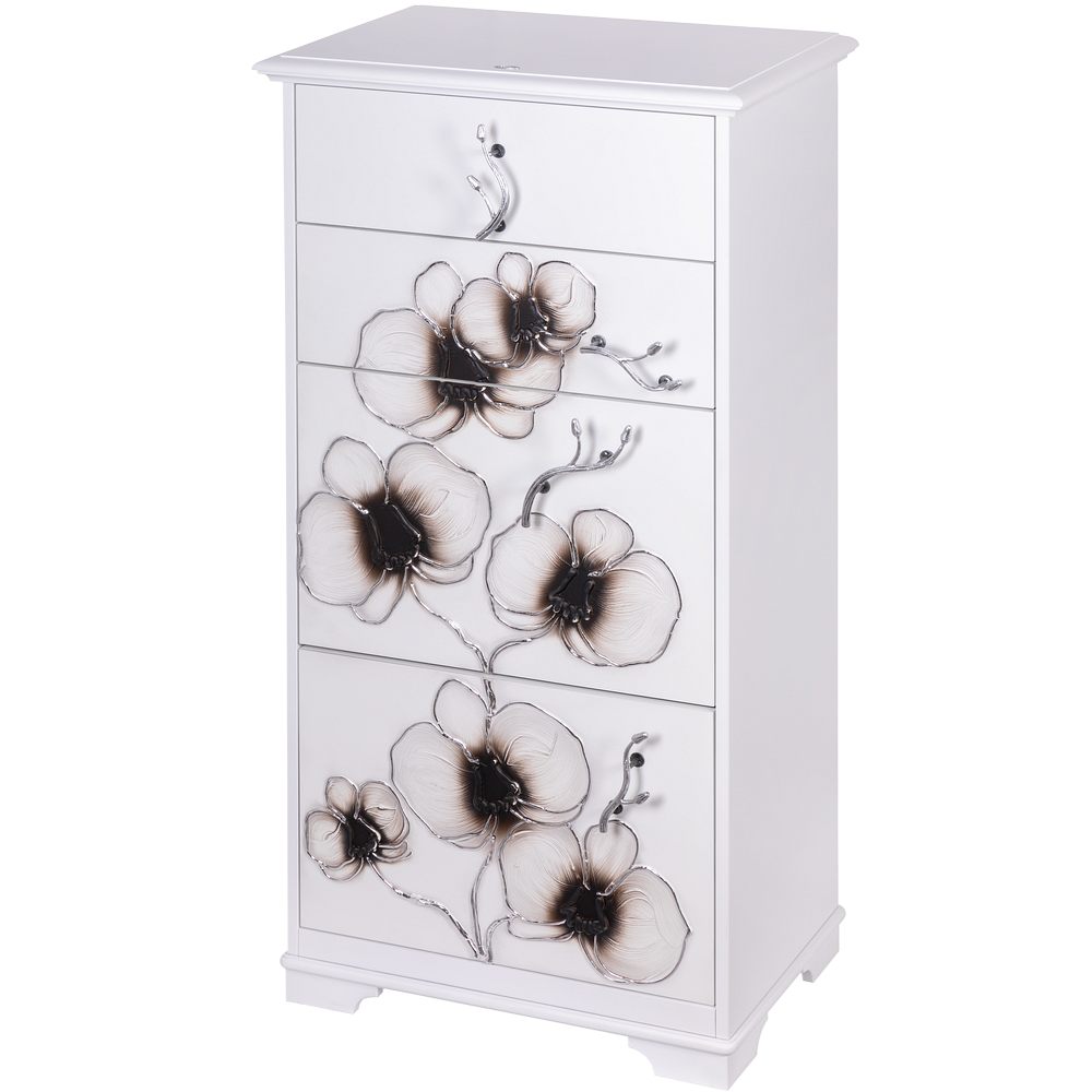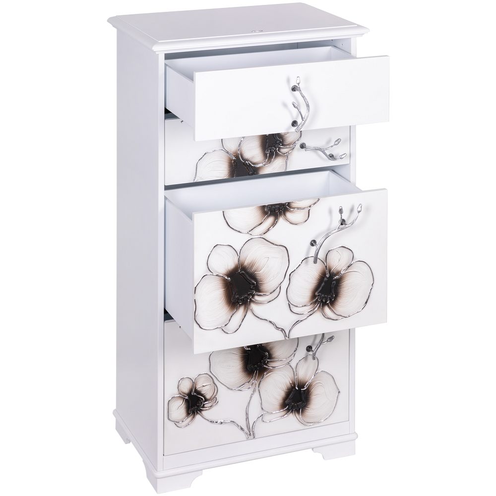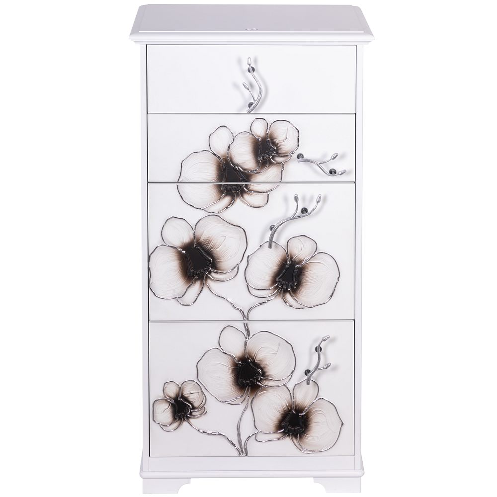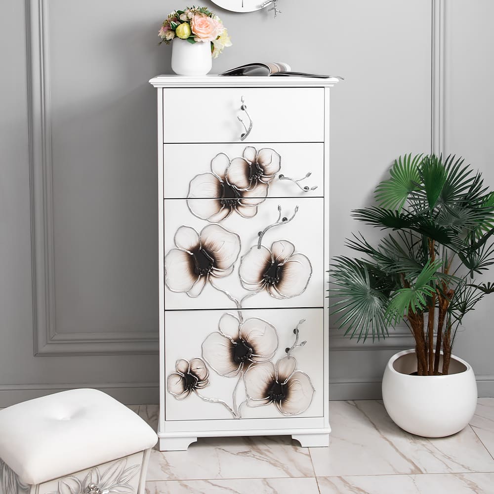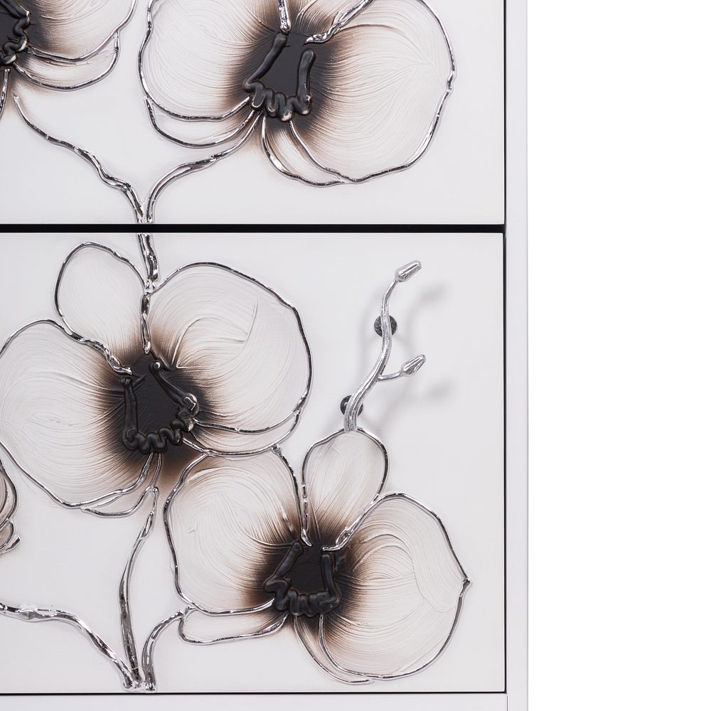 Изящный Комод BOGACHO Орхидея Симпл белый (ручная работа) - станет настоящим центром притяжения вашего пространства.Конические ножки создают впечатление, будто комод парит в воздухе. Каркас изделия изготовлен из МДФ и декорирован мраморными патинированными элементами в виде бутонов. Комод доставляется в собранном виде.Добавьте индивидуальности в свой интерьер с помощью эксклюзивных изделий BOGACHO.