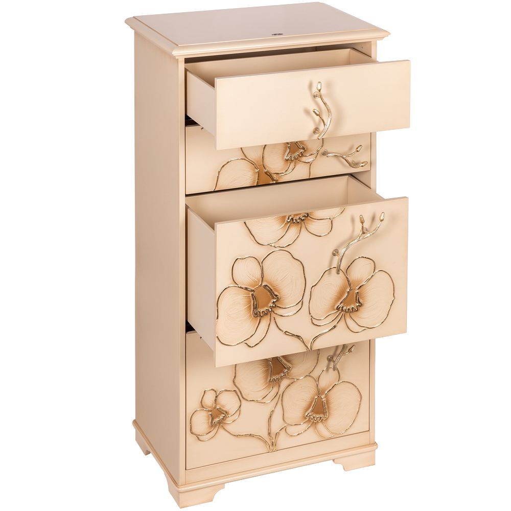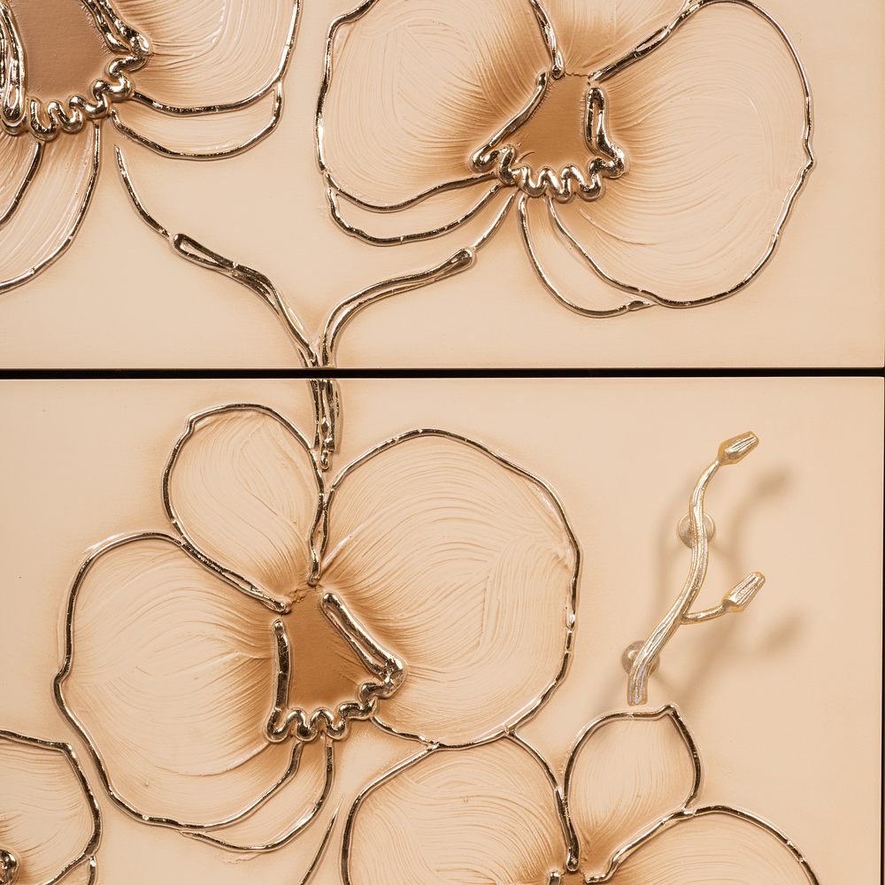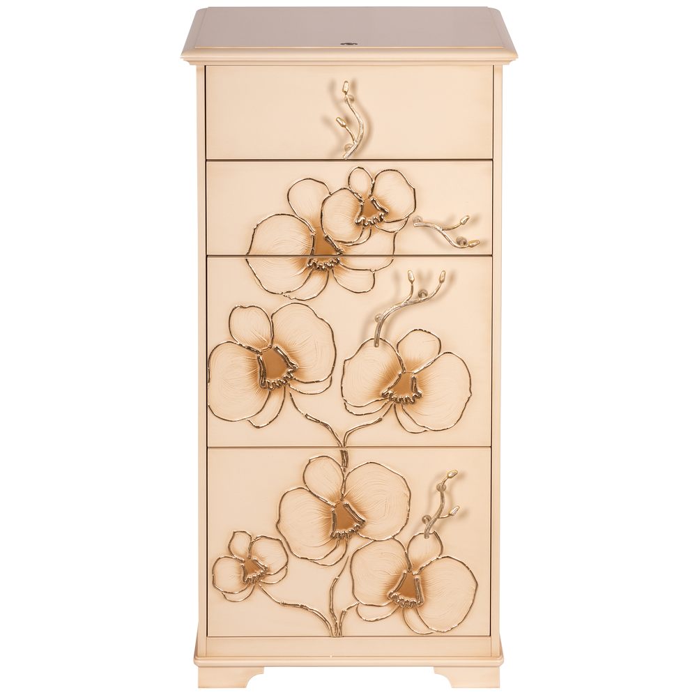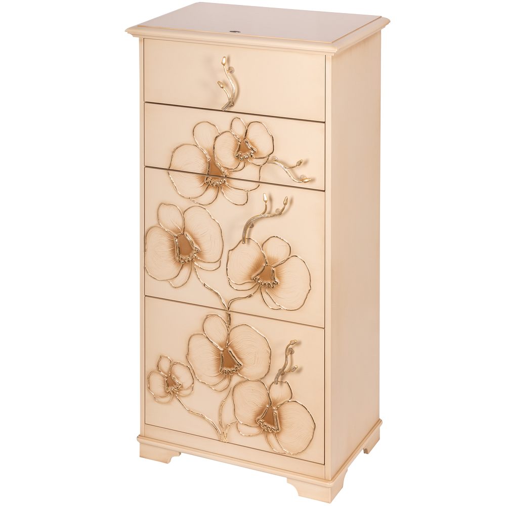 Изящный Комод BOGACHO Орхидея Симпл бежевый (ручная работа) станет настоящим центром притяжения вашего пространства.Конические ножки создают впечатление, будто комод парит в воздухе. Каркас изделия изготовлен из МДФ и декорирован мраморными патинированными элементами в виде бутонов. Комод доставляется в собранном виде.Добавьте индивидуальности в свой интерьер с помощью эксклюзивных изделий BOGACHO.