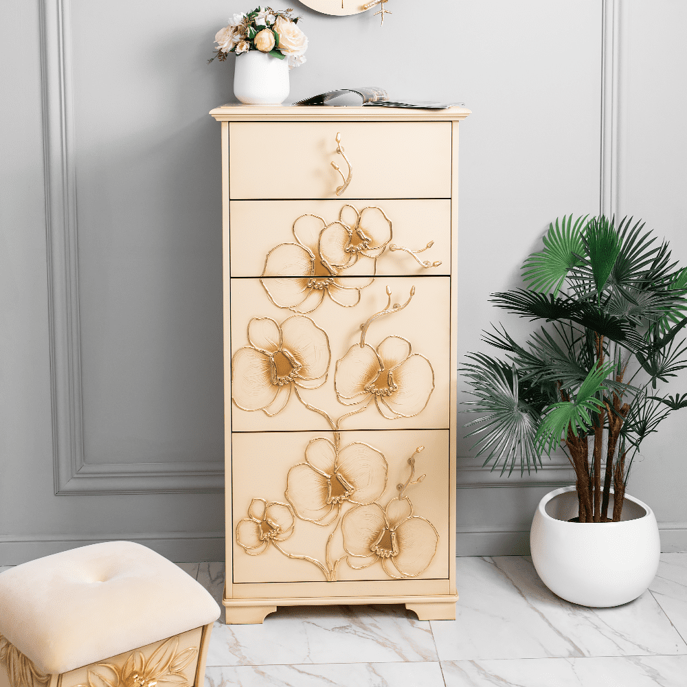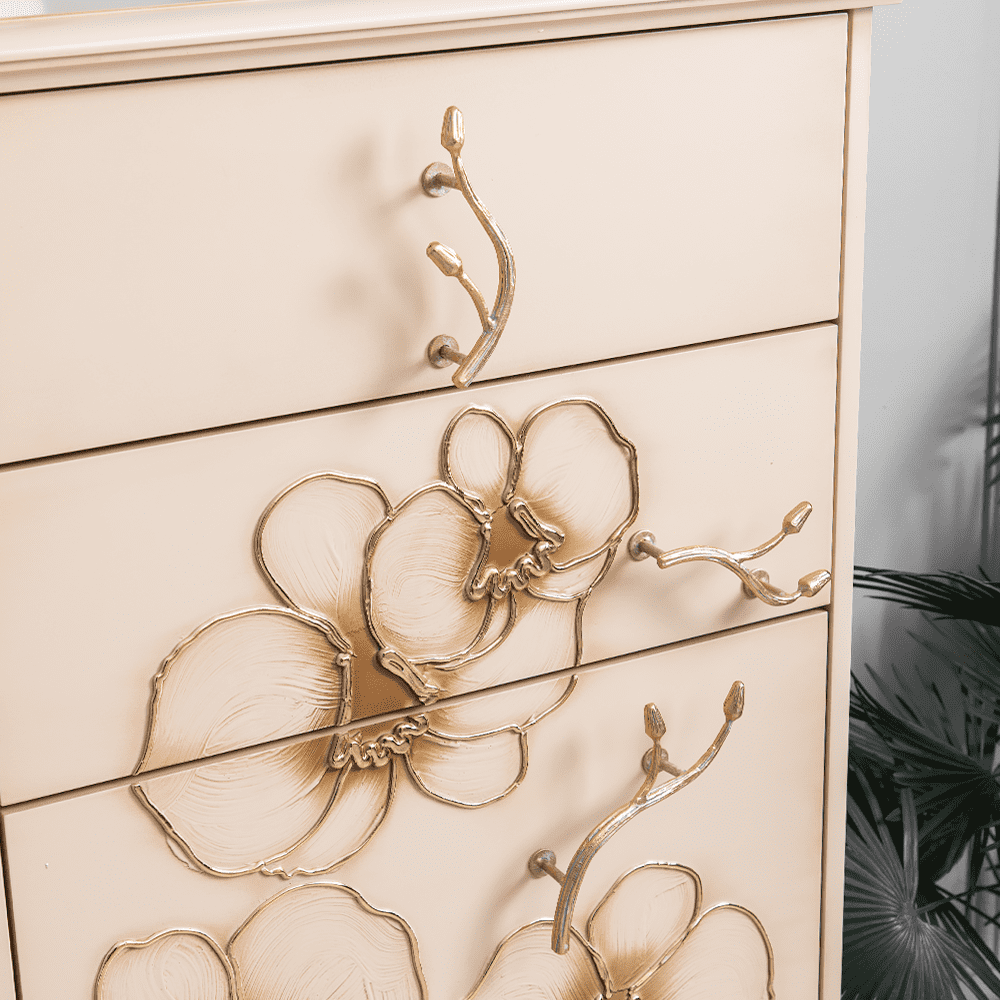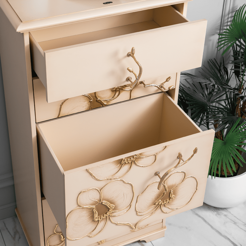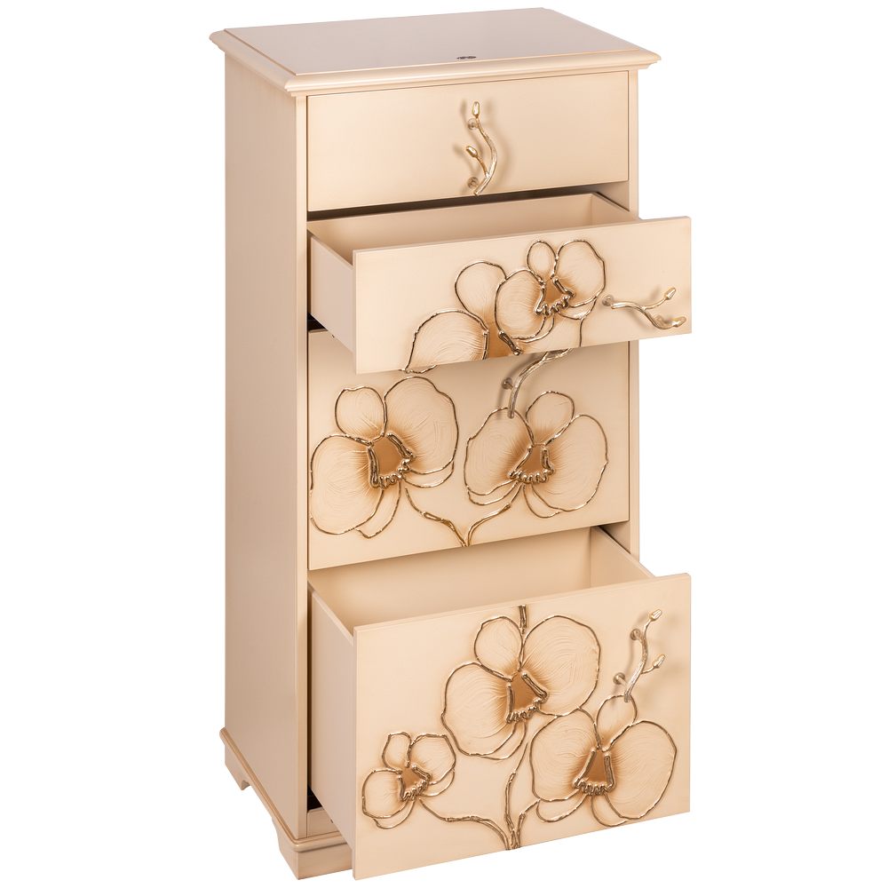 Изящный Комод BOGACHO Орхидея Симпл бежевый (ручная работа) станет настоящим центром притяжения вашего пространства.Конические ножки создают впечатление, будто комод парит в воздухе. Каркас изделия изготовлен из МДФ и декорирован мраморными патинированными элементами в виде бутонов. Комод доставляется в собранном виде.Добавьте индивидуальности в свой интерьер с помощью эксклюзивных изделий BOGACHO.