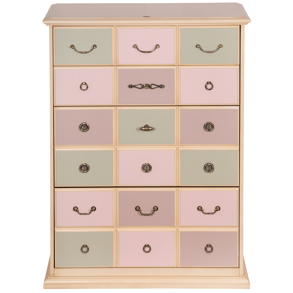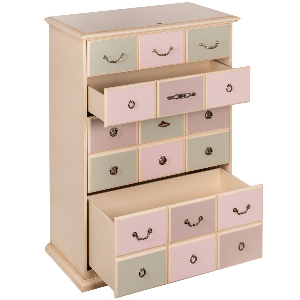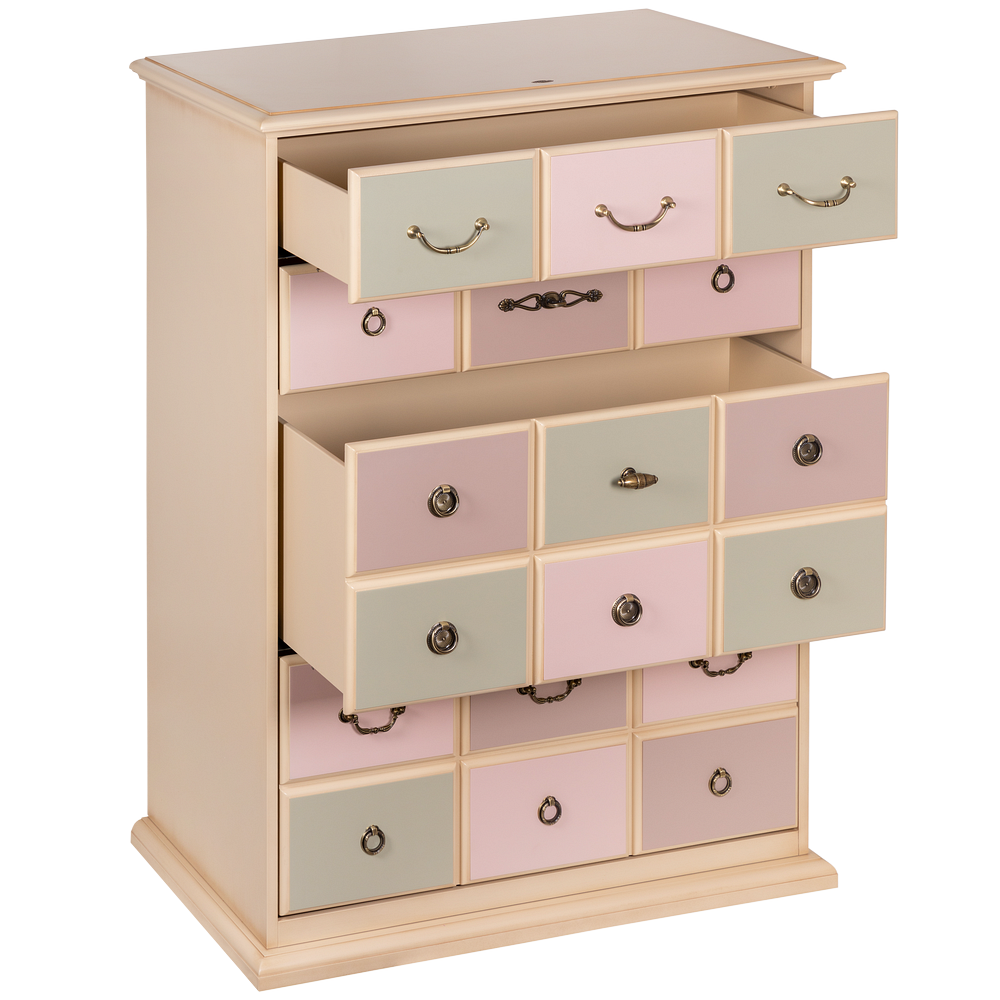 Материалы изготовления и размеры изделияКаркас комода и ящики выполнены из мдф. Поверхность тонирована, патинирована и покрыта лаком. Ящики выполнены из мдф и окрашены в синий, белый и красный цвета. Фурнитура из латуни испанского производства.