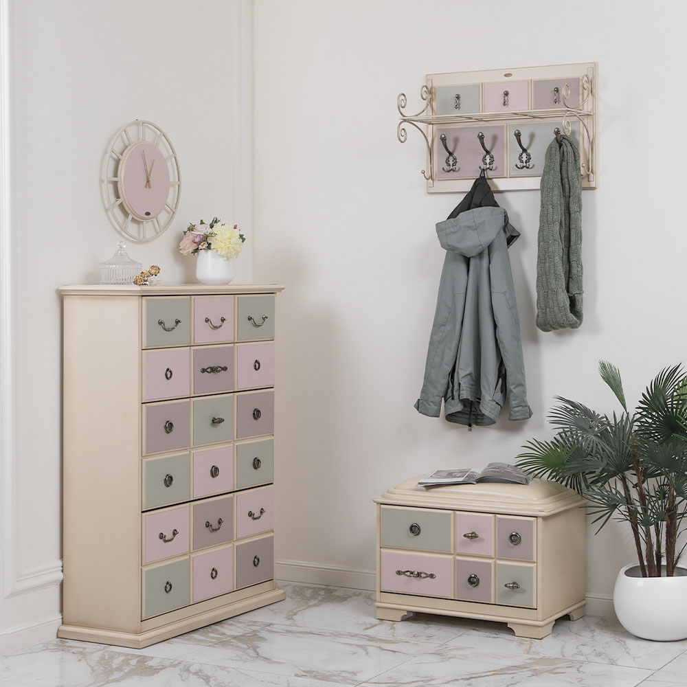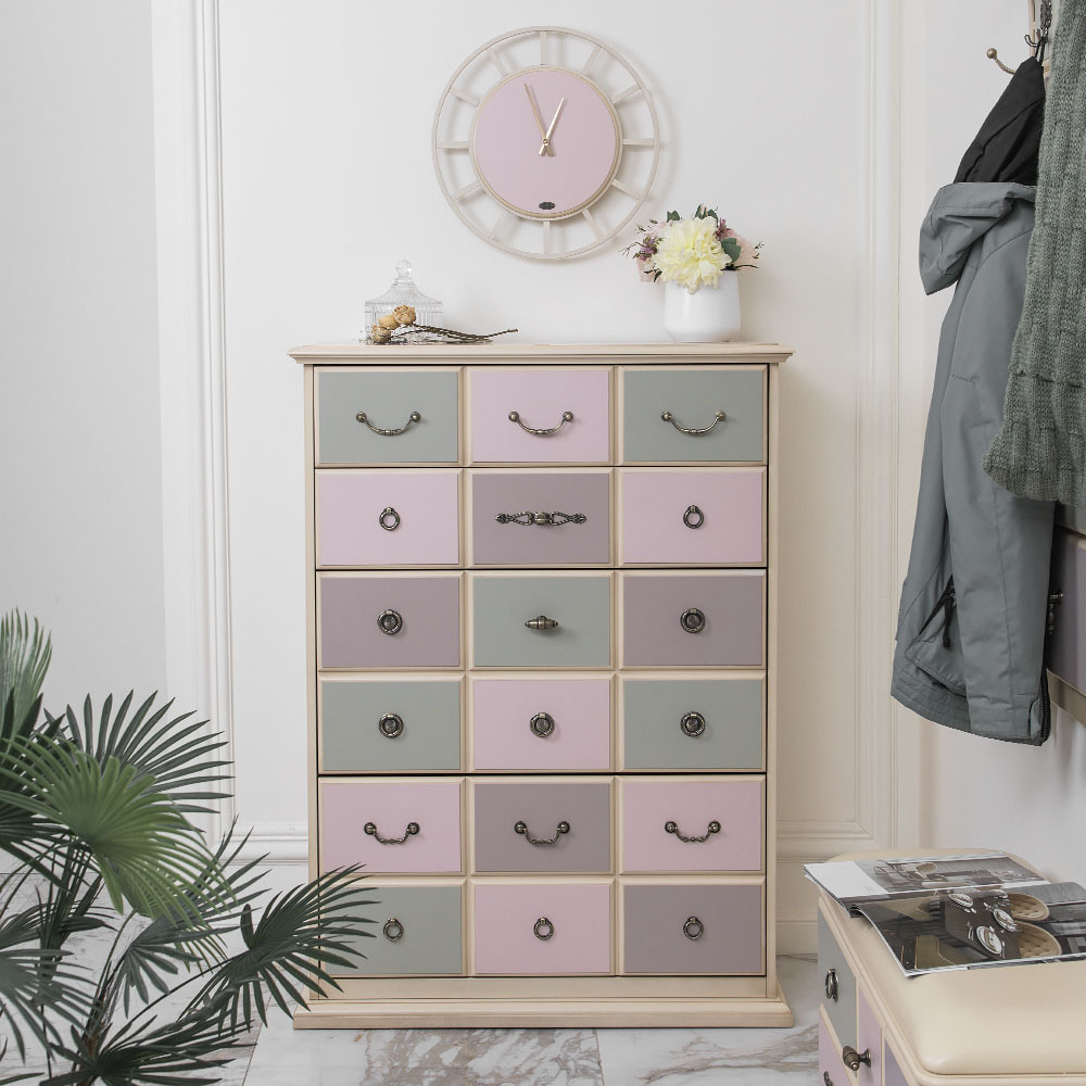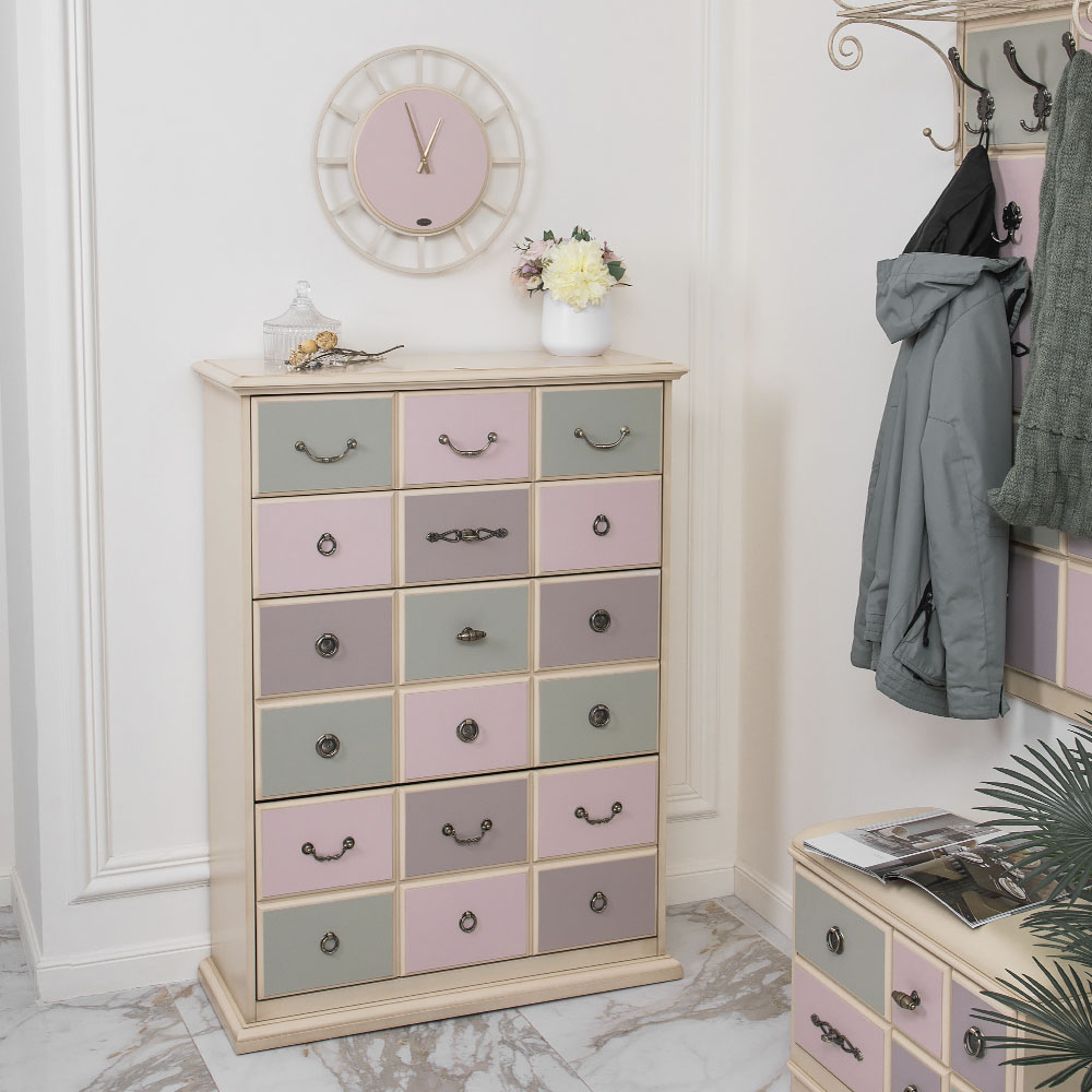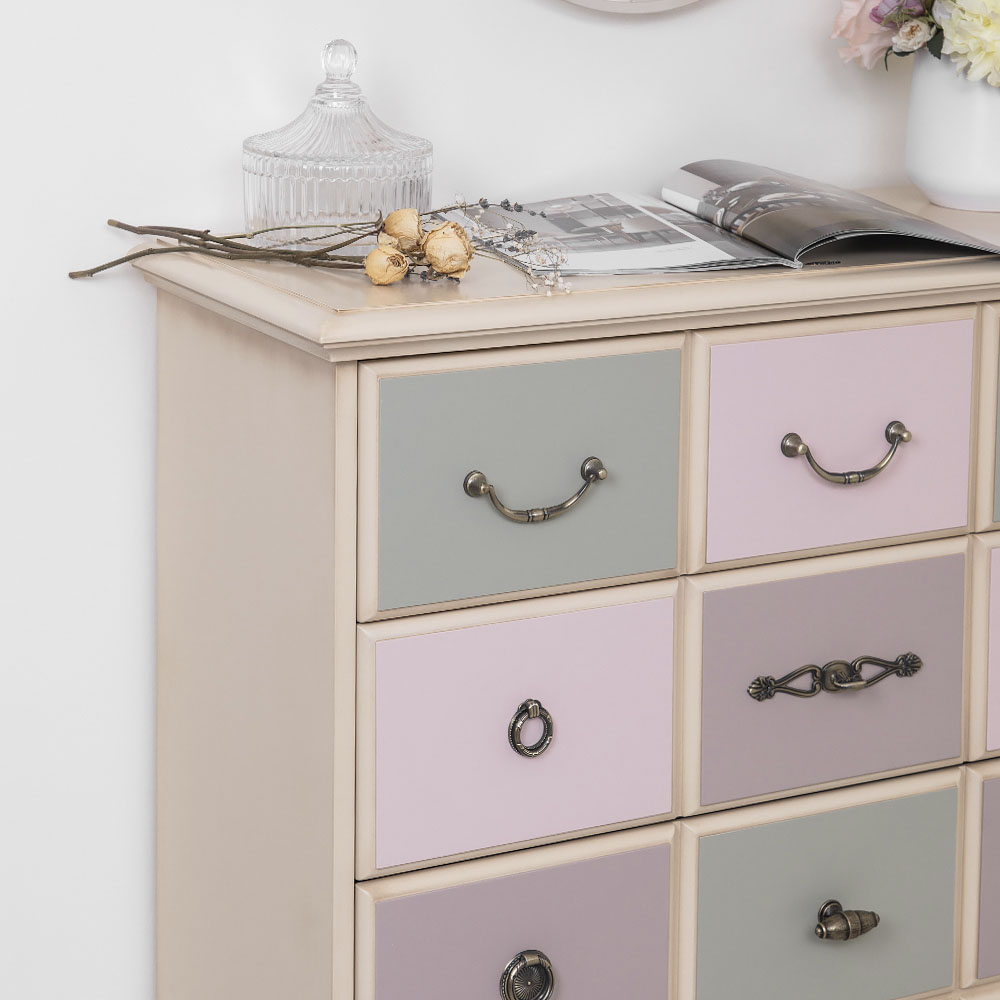 Материалы изготовления и размеры изделияКаркас комода и ящики выполнены из мдф. Поверхность тонирована, патинирована и покрыта лаком. Ящики выполнены из мдф и окрашены в синий, белый и красный цвета. Фурнитура из латуни испанского производства.