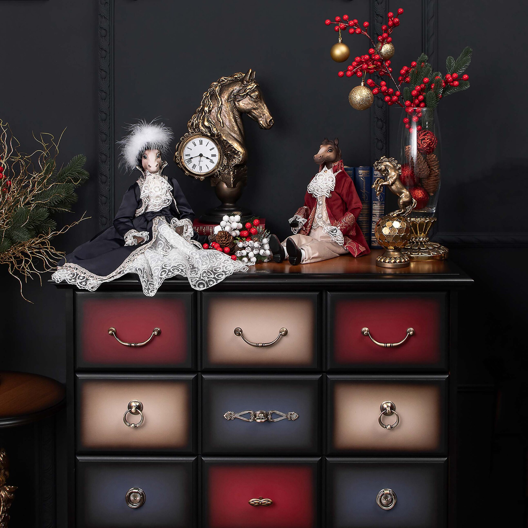 Материалы изготовления и размеры изделияКаркас комода и ящики выполнены из Мдф. Поверхность тонирована, патинирована и покрыта лаком. Ящики выполнены из Мдф и окрашены в синий, белый и красный цвета. Фурнитура из латуни испанского производства.