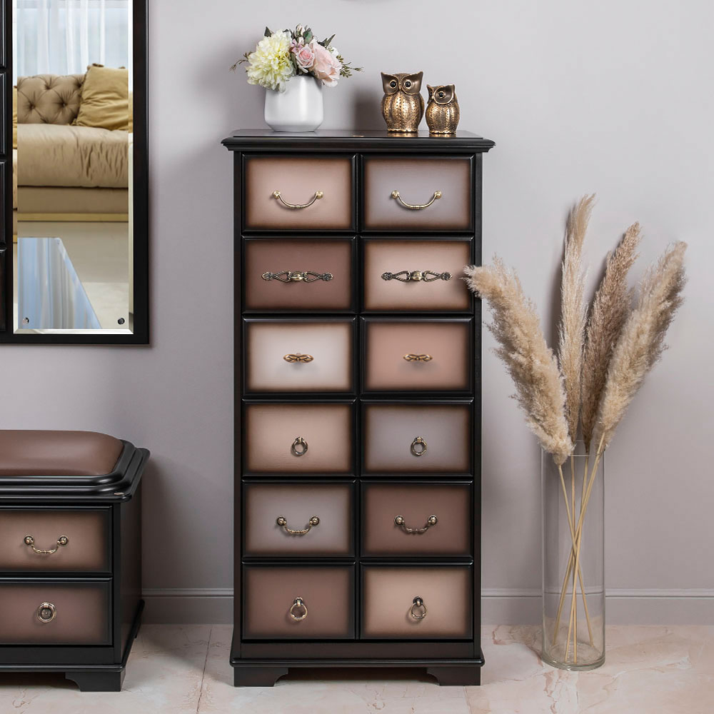Большой оригиналКомод оборудован четырьмя ящиками. Два верхних предназначены для мелких вещей, два нижних - для крупных. Все необходимое будет под рукой. Недаром само слово «комод» произошло от французского commode, что в переводе означает «удобный». При его изготовление используются латунная фурнитура испанского производства и качественные европейские направляющие (фирма BLUM, Австрия).