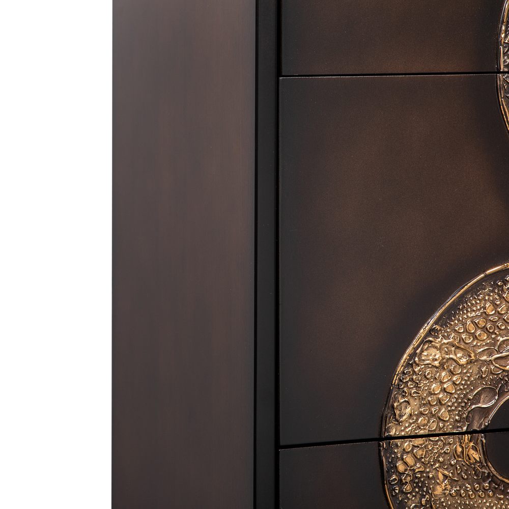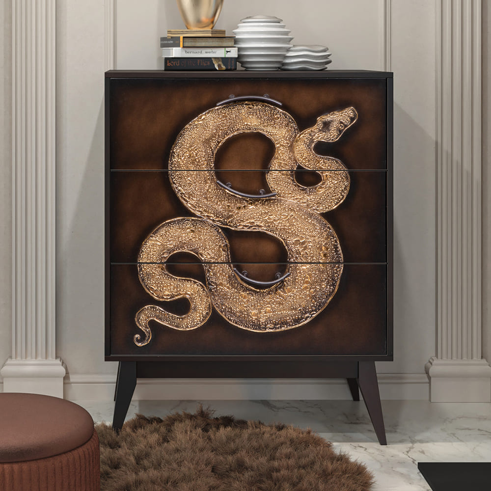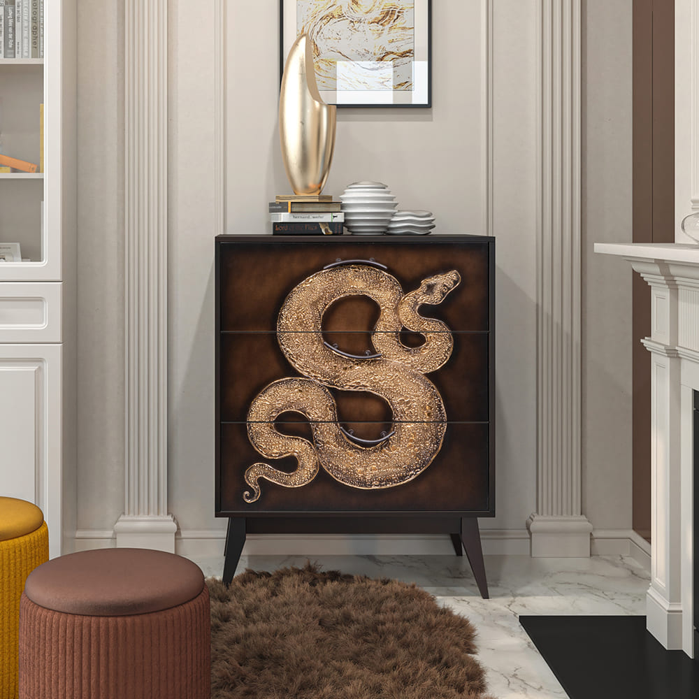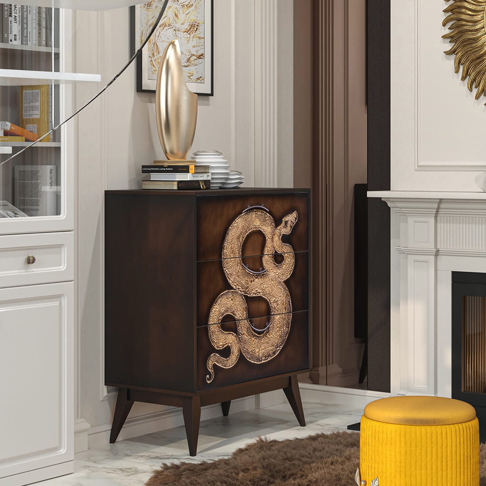 Комод из МДФ с тремя выдвижными ящиками. Комод BOGACHO - это образ современности вне времени. Конические ножки и прочный каркас выполнены из МДФ, декоративные элементы изготовлены из мраморной пудры и легированной стали, отшлифованы и патинированы вручную. Комод имеет три выдвижных ящика и доставляется в собранном виде. Добавьте в интерьер своего пространства уюта и атмосферу гармонии вместе с эксклюзивными изделиями BOGACHO.