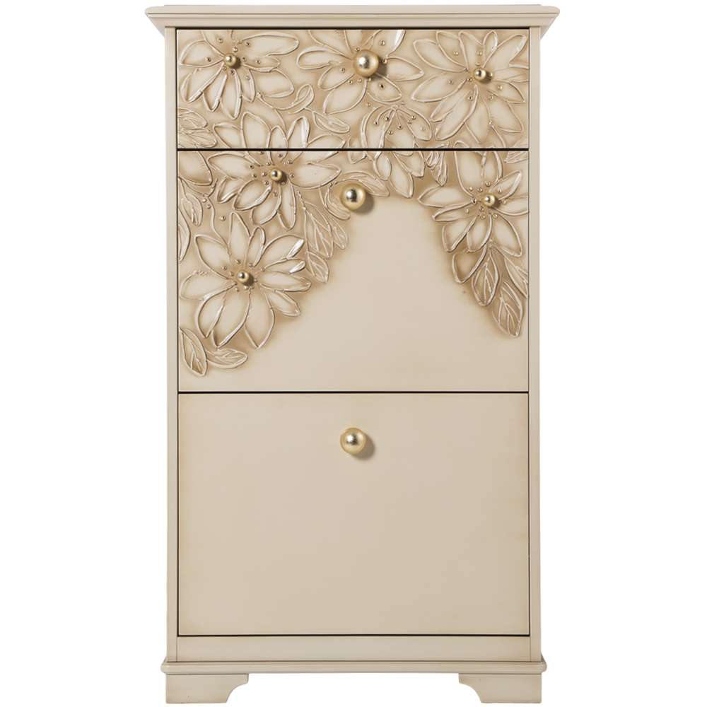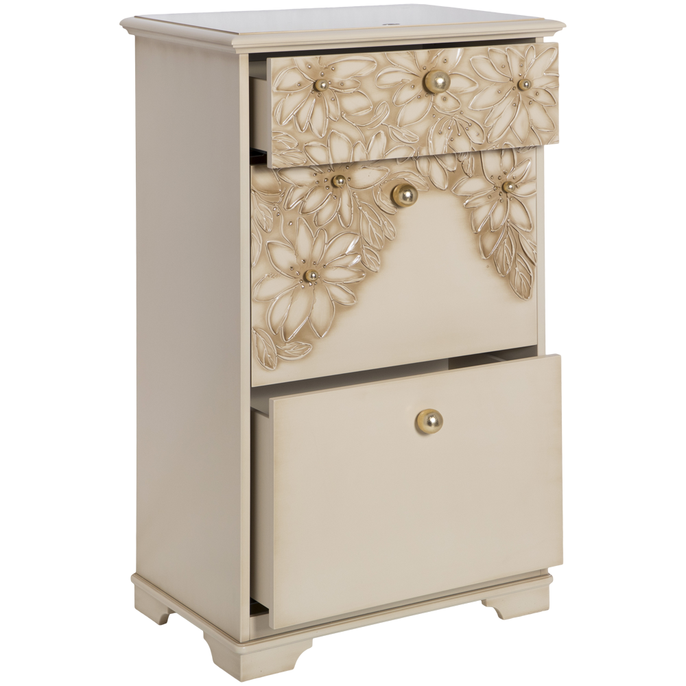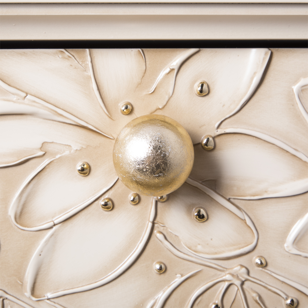 Комод BOGACHO Терра с 3 ящиками кремового цвета (ручная работа) - это сочетание безупречной гармонии простоты, утонченности, комфорта и безупречного стиля.Коллекция отличается уникальными фасадами, декорированными мраморной пудрой. Каждый рисунок наносится вручную без применения штамповки.Фабрика BOGACHO гарантирует высочайшее качество своих изделий, и это подтверждается сертификатами, премиями и наградами, завоеванными на специализированных выставках, а также благодарными отзывами клиентов. Компания использует лучшие материалы при изготовлении своей продукции – натуральные, безопасные, экологичные, передовые.