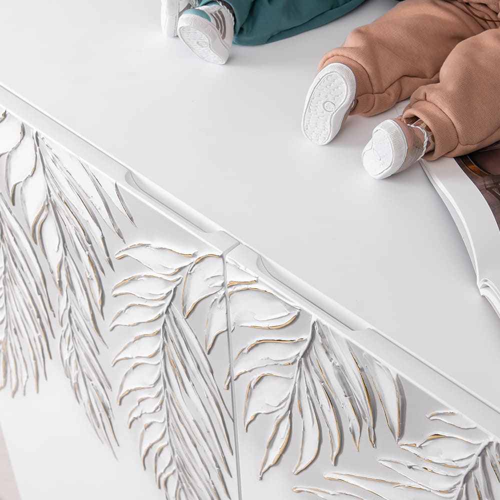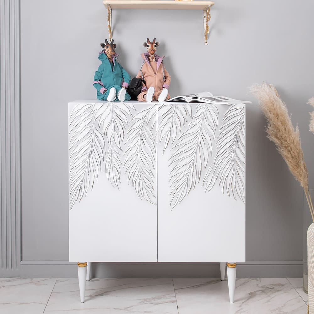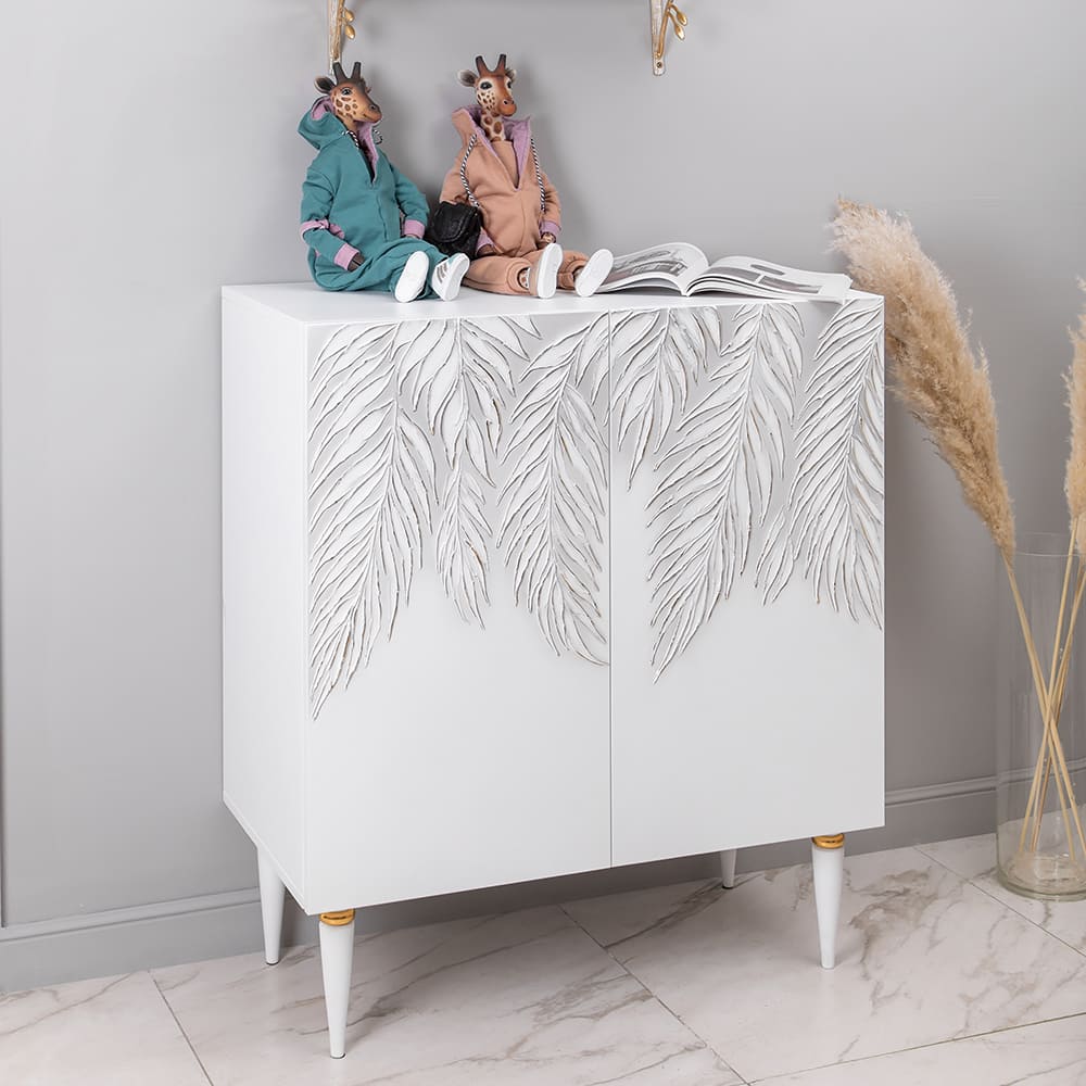 Комод с дверцами Тропик напоминает своей конструкцией мини-шкаф небольшой высоты с двумя отделениями с полками для хранения вещей, скрытыми за распашными дверцами. Комод представлен в двух цветах: белый / серый. Особое украшение изделия - фасад с тропическими листьями, выполненными в авторской технологии мраморной пылью. Покрытие на ножках комода различается в зависимости от модели. Комод деревянный: корпус выполнен из высококачественного МДФ, ножки – из бука. Он отлично подойдет для прихожей, гостиной, коридора, спальни, детской. При этом его поверхность можно использовать в качестве подставки для цветов, для декора, книг, светильника.Простые линии форм, универсальные цвета, неброский декор позволяют легко вписать такую мебель в современный интерьер.