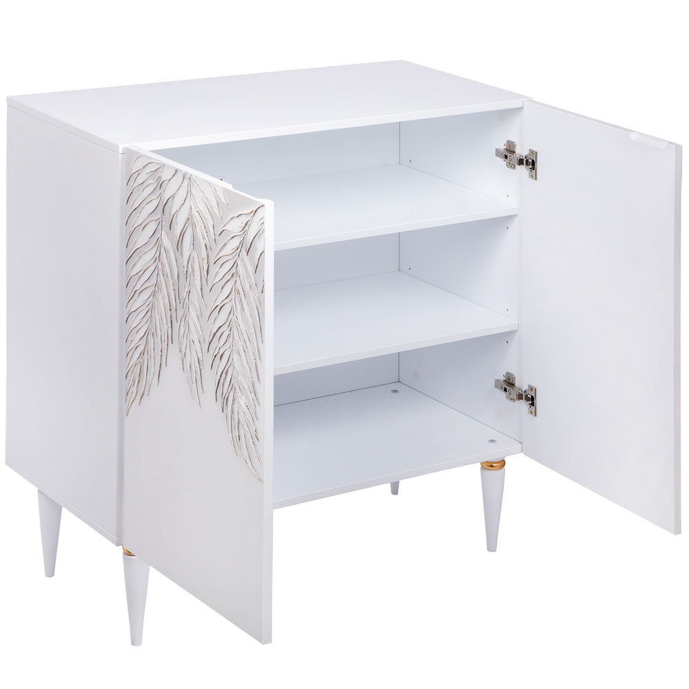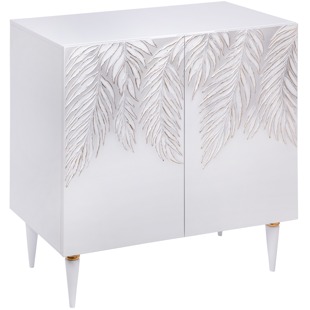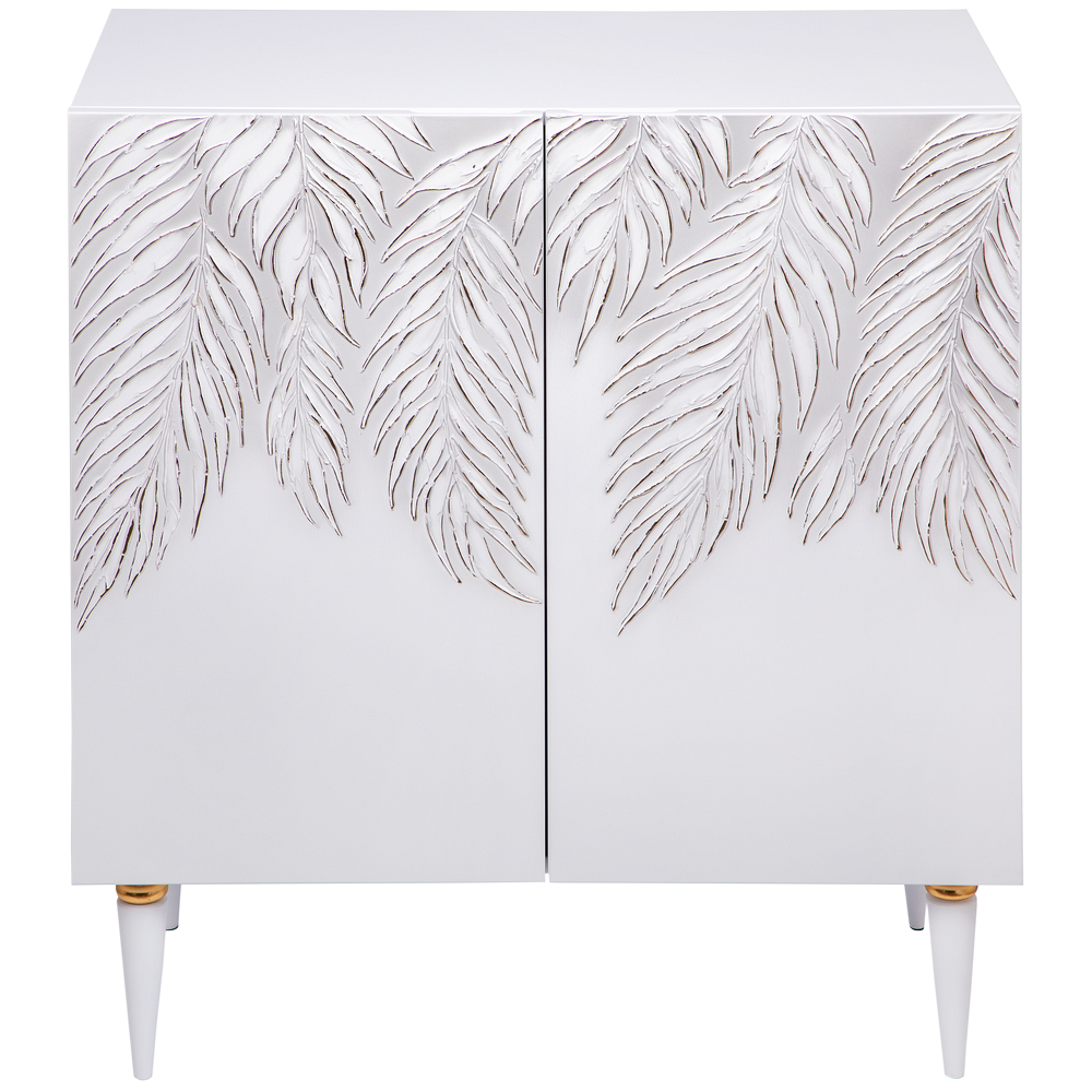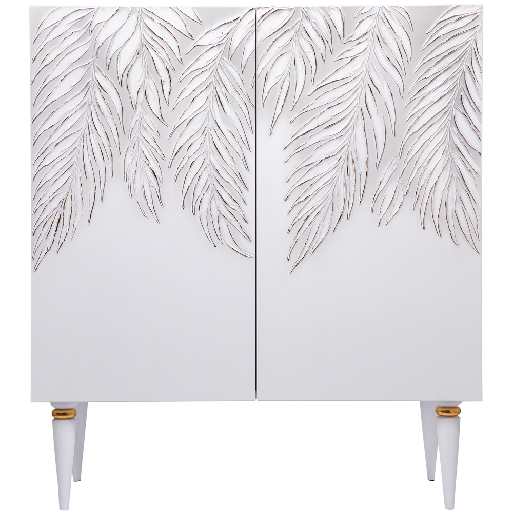 Комод с дверцами Тропик напоминает своей конструкцией мини-шкаф небольшой высоты с двумя отделениями с полками для хранения вещей, скрытыми за распашными дверцами. Комод представлен в двух цветах: белый / серый. Особое украшение изделия - фасад с тропическими листьями, выполненными в авторской технологии мраморной пылью. Покрытие на ножках комода различается в зависимости от модели. Комод деревянный: корпус выполнен из высококачественного МДФ, ножки – из бука. Он отлично подойдет для прихожей, гостиной, коридора, спальни, детской. При этом его поверхность можно использовать в качестве подставки для цветов, для декора, книг, светильника.Простые линии форм, универсальные цвета, неброский декор позволяют легко вписать такую мебель в современный интерьер.