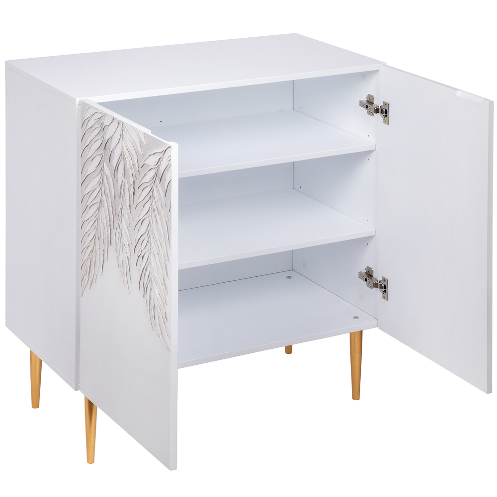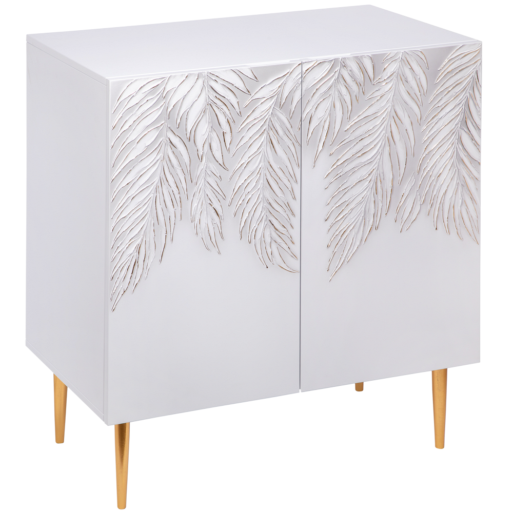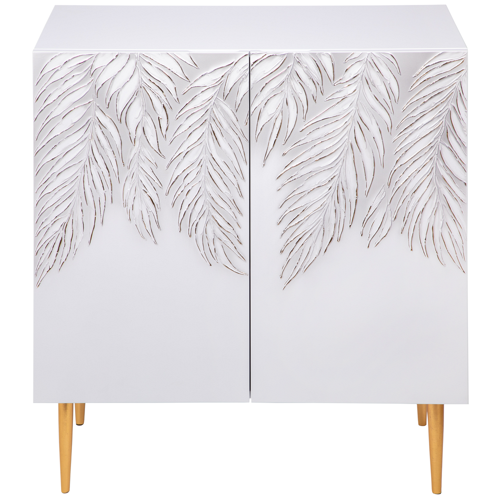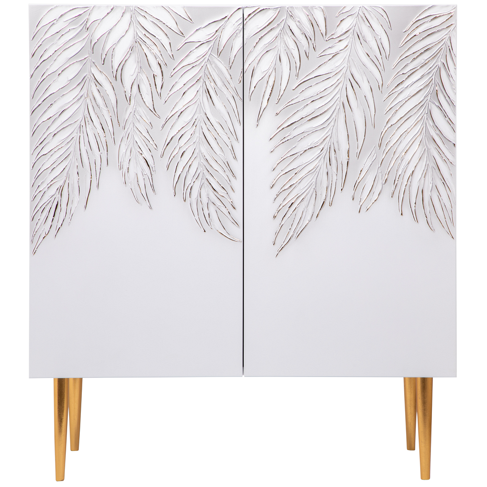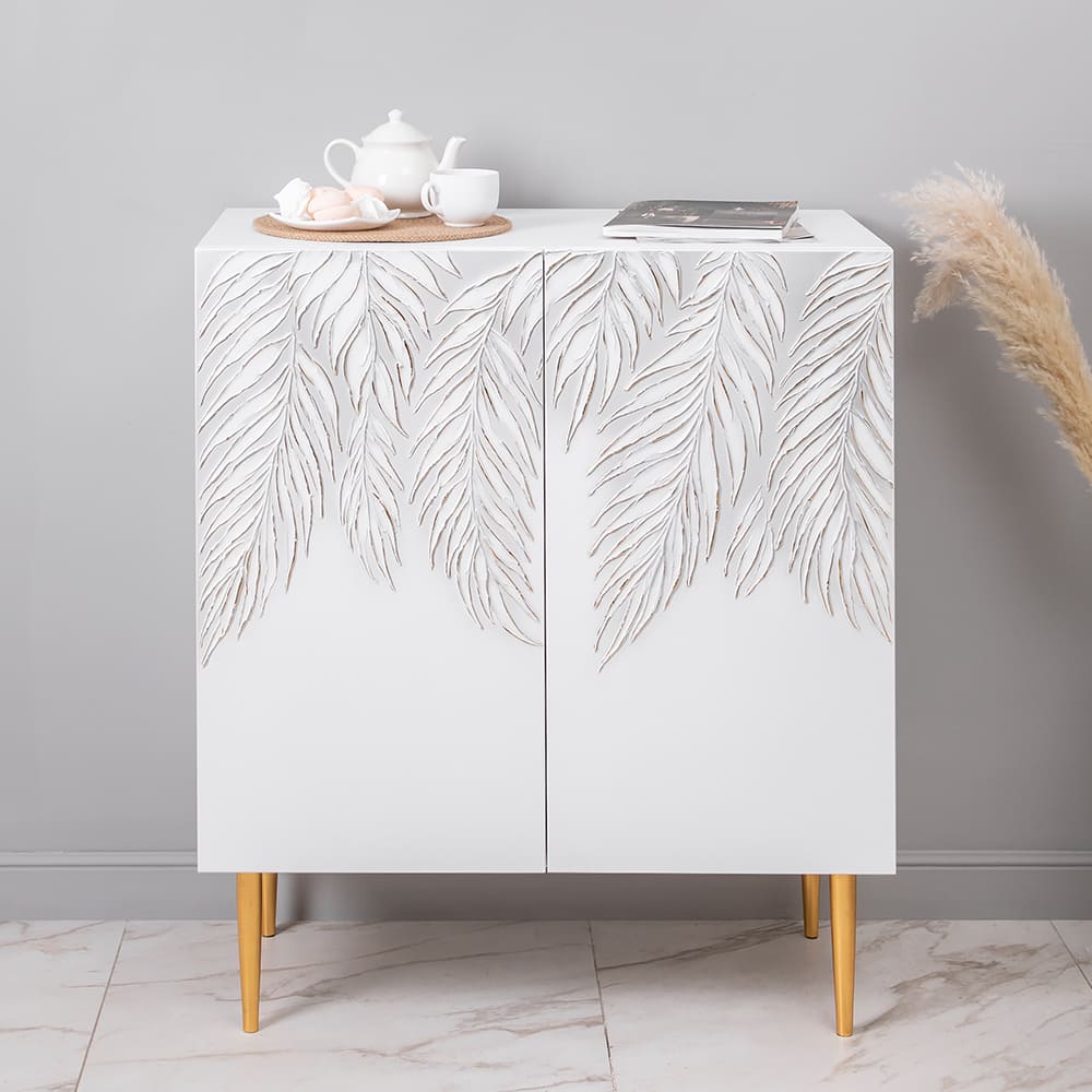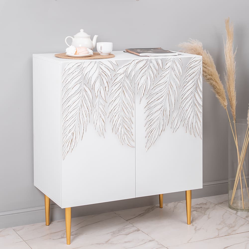 Комод с дверцами Тропик напоминает своей конструкцией мини-шкаф небольшой высоты с двумя отделениями с полками для хранения вещей, скрытыми за распашными дверцами. Комод представлен в двух цветах: белый / серый. Особое украшение изделия - фасад с тропическими листьями, выполненными в авторской технологии мраморной пылью. Покрытие на ножках комода различается в зависимости от модели. Комод деревянный: корпус выполнен из высококачественного МДФ, ножки – из бука. Он отлично подойдет для прихожей, гостиной, коридора, спальни, детской. При этом его поверхность можно использовать в качестве подставки для цветов, для декора, книг, светильника.Простые линии форм, универсальные цвета, неброский декор позволяют легко вписать такую мебель в современный интерьер.