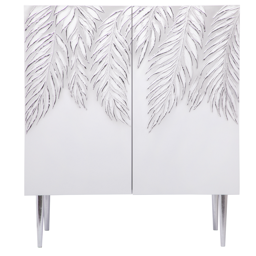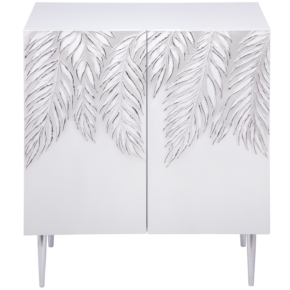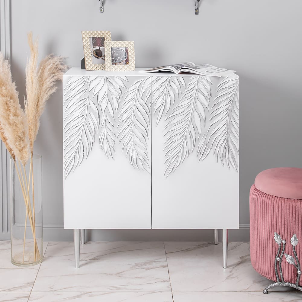 Комод с дверцами Тропик напоминает своей конструкцией мини-шкаф небольшой высоты с двумя отделениями с полками для хранения вещей, скрытыми за распашными дверцами. Комод представлен в двух цветах: белый / серый. Особое украшение изделия - фасад с тропическими листьями, выполненными в авторской технологии мраморной пылью. Покрытие на ножках комода различается в зависимости от модели. Комод деревянный: корпус выполнен из высококачественного МДФ, ножки – из бука. Он отлично подойдет для прихожей, гостиной, коридора, спальни, детской. При этом его поверхность можно использовать в качестве подставки для цветов, для декора, книг, светильника.Простые линии форм, универсальные цвета, неброский декор позволяют легко вписать такую мебель в современный интерьер.