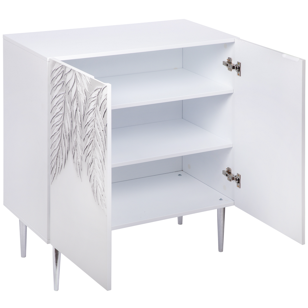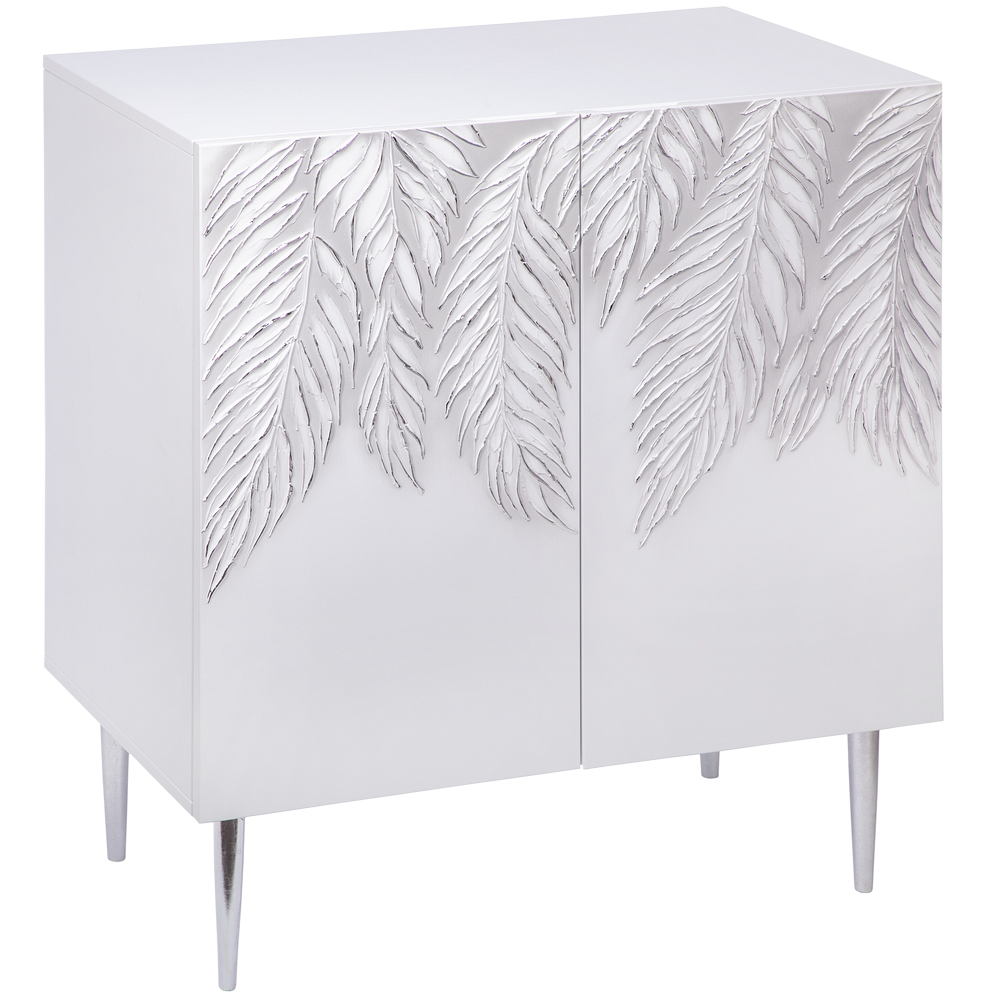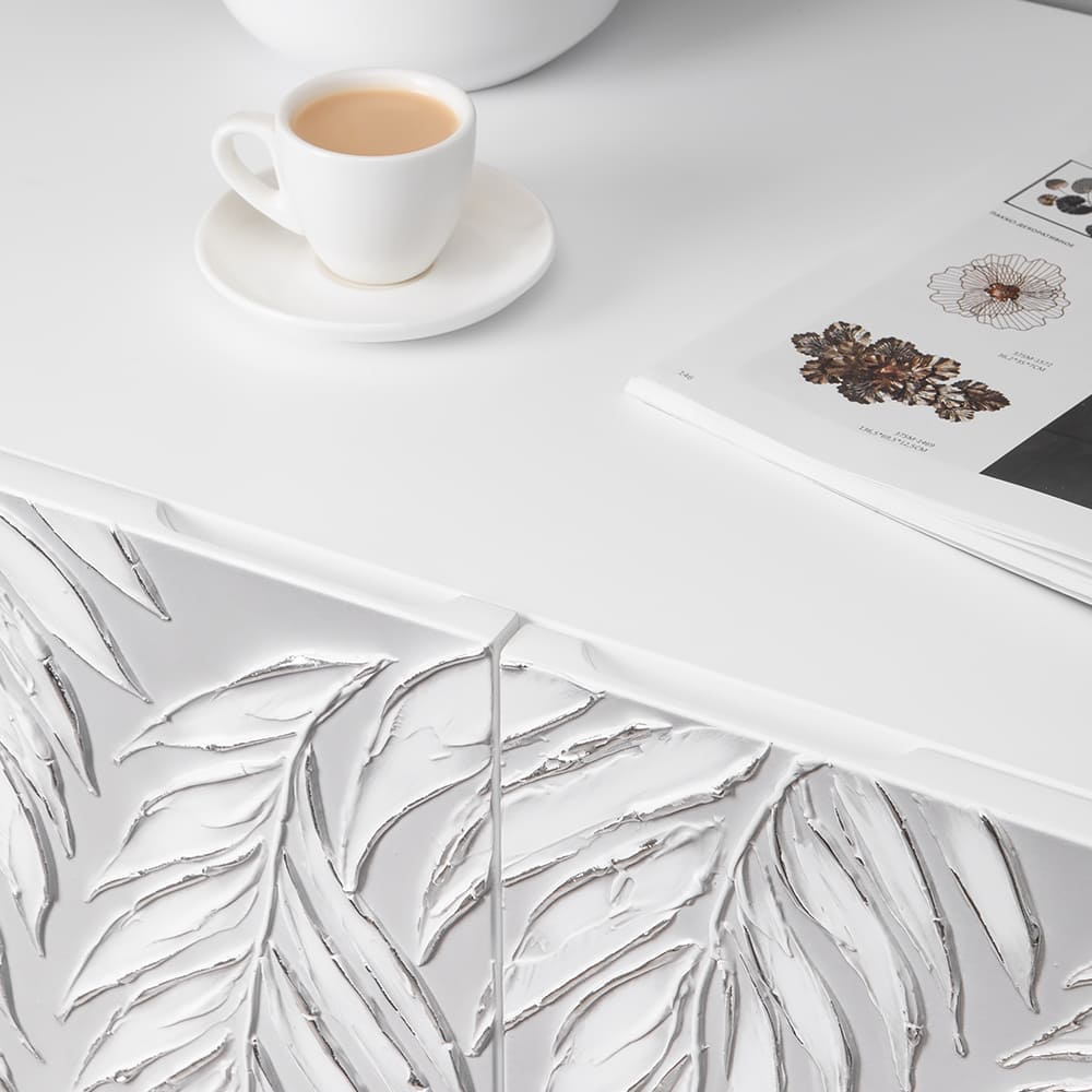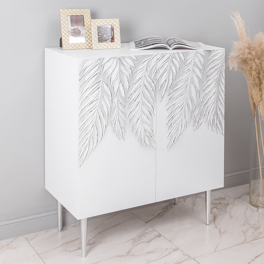 Комод с дверцами Тропик напоминает своей конструкцией мини-шкаф небольшой высоты с двумя отделениями с полками для хранения вещей, скрытыми за распашными дверцами. Комод представлен в двух цветах: белый / серый. Особое украшение изделия - фасад с тропическими листьями, выполненными в авторской технологии мраморной пылью. Покрытие на ножках комода различается в зависимости от модели. Комод деревянный: корпус выполнен из высококачественного МДФ, ножки – из бука. Он отлично подойдет для прихожей, гостиной, коридора, спальни, детской. При этом его поверхность можно использовать в качестве подставки для цветов, для декора, книг, светильника.Простые линии форм, универсальные цвета, неброский декор позволяют легко вписать такую мебель в современный интерьер.