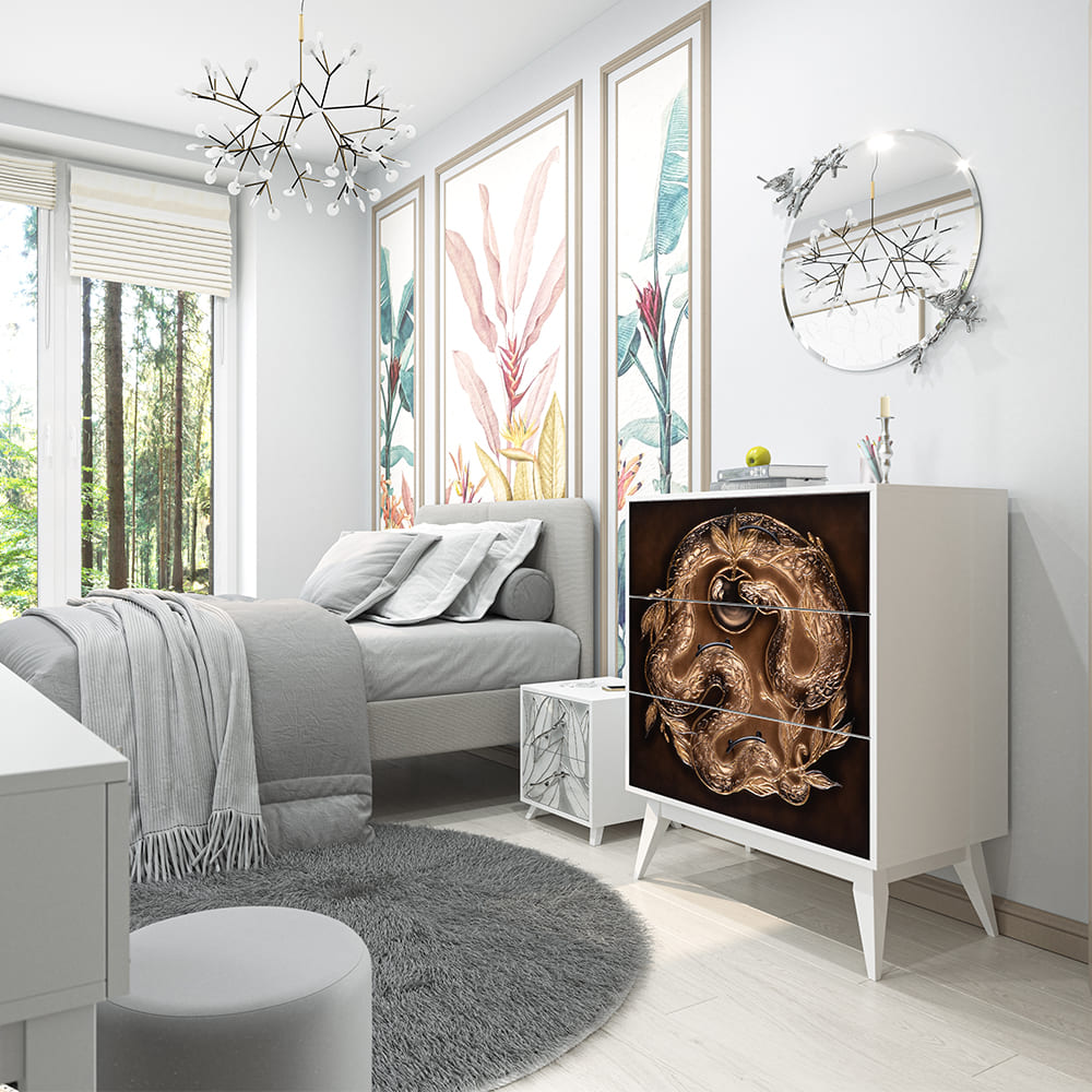 Комод из мдф с тремя выдвижными ящиками. Комод BOGACHO - это образ современности вне времени. Конические ножки и прочный каркас выполнены из мдф, декоративные элементы изготовлены из мраморной пудры и легированной стали, отшлифованы и патинированы вручную. Комод имеет три выдвижных ящика и доставляется в собранном виде. Добавьте в интерьер своего пространства уюта и атмосферу гармонии вместе с эксклюзивными изделиями BOGACHO.