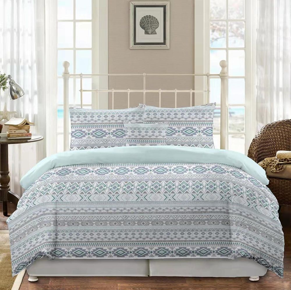 Оборотная часть пододеяльника выполнена в бледно-голубом цвете. Простыня – в сером цвете.