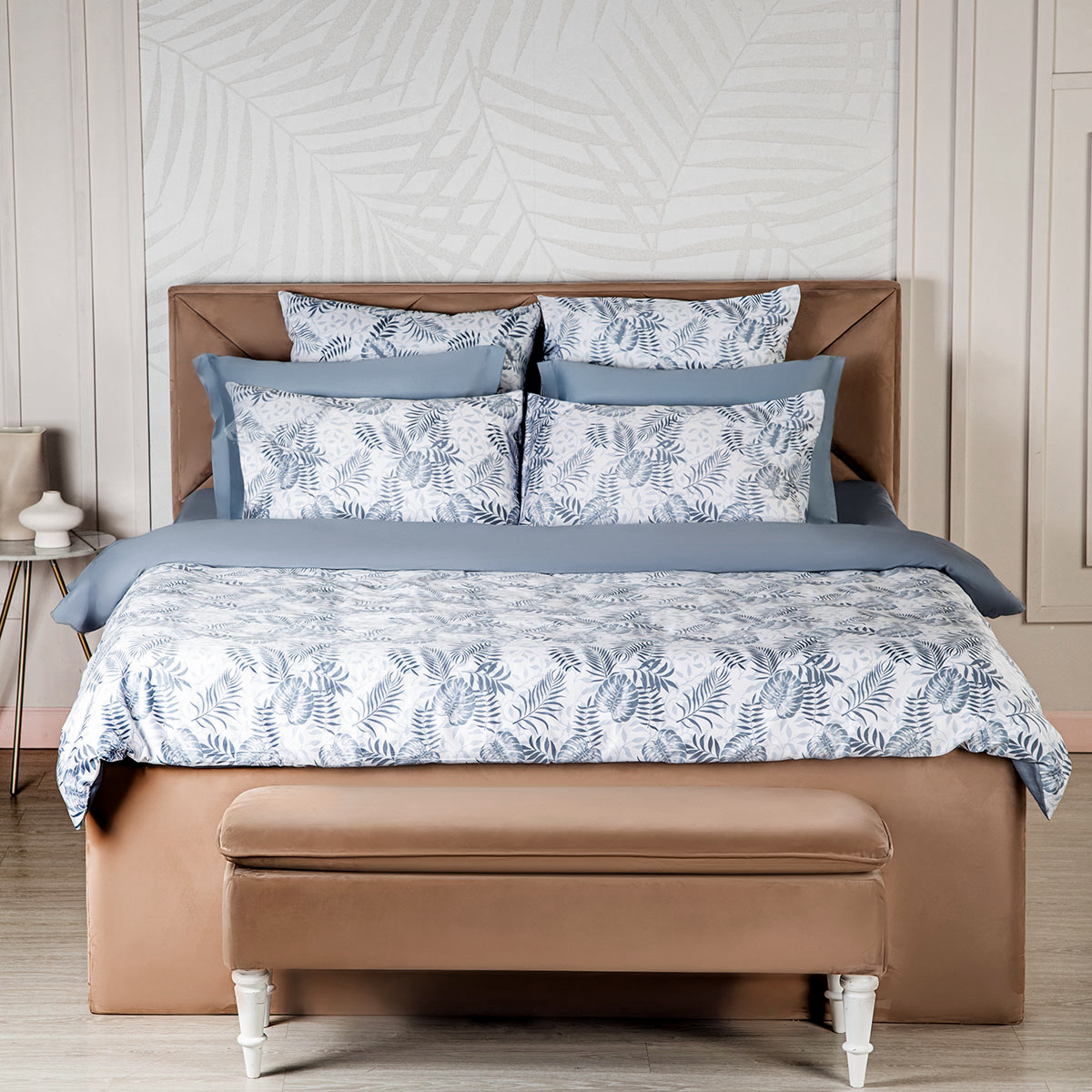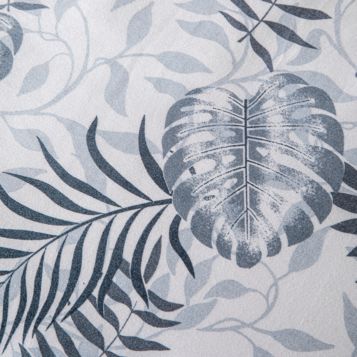 Растительный рисунок с листьями тропической монстеры и ветвями папоротника выполнен градиентным переходом от светлого до глубокого голубого цвета, что придает ему объем и многоплановость.