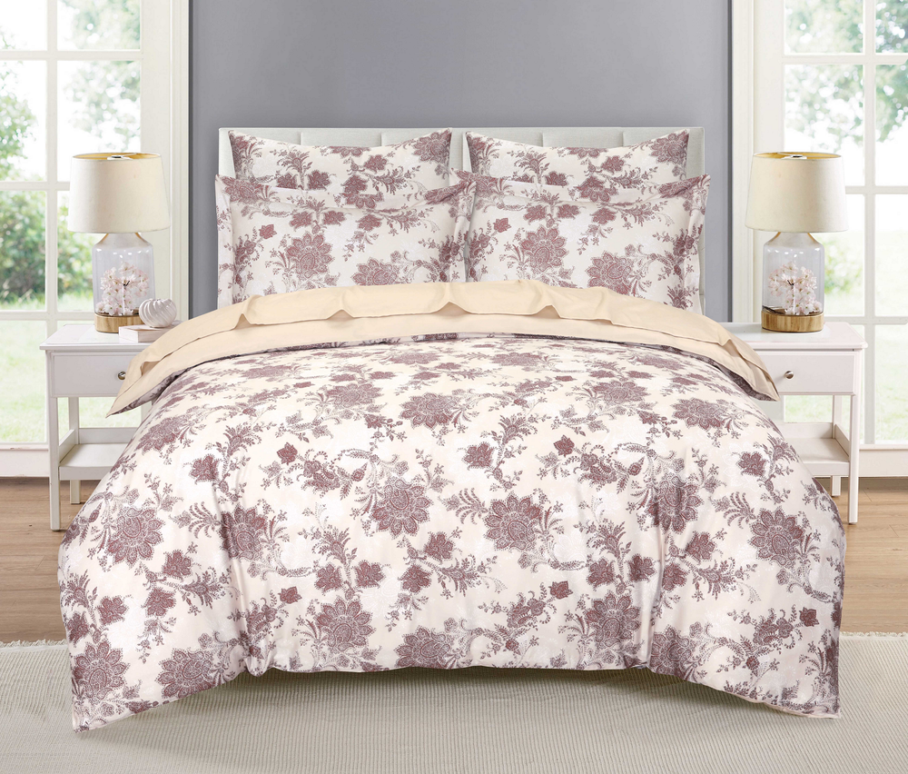 Рисунок на белье выполнен в стиле русского орнамента и имитирует хохломскую роспись. Ажурные завитки цветочной гирлянды соединяют крупные пурпурные бутоны с мельчайшими изогнутыми веточками, создавая ощущение неповторимости каждой детали. Комплект поистине оценят любители национальных мотивов, отдающие предпочтение в интерьере элементам рустикального стиля.